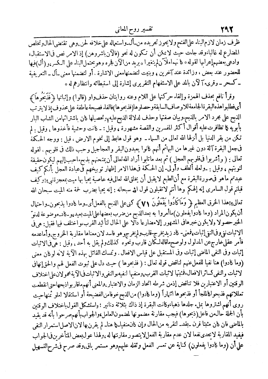 وقرأ نافع بحذف الهمزة وإلقاء حركتها على اللام وعنه روايتان حذف واو قالوا وإثباتها فذبحوها أي فطلبوا هذه البقرة الجامعة للأوصاف السابقة وحصلوها فذبحوها فالفاء فصيحة عاطفة على محذوف إذ لا يترتب الذبح على مجرد الأمر بالذبح وبيان صفتها وحذف لدلالة الذبح عليه وتحصيلها كان بإشترائها من الشاب البار بأبويه كما تظافرت عليه أقوال أكثر المفسرين والقصة مشهورة وقيل : كانت وحشية فأخذوها وقيل : لم تكن من بقر الدنيا بل أنزلها الله تعالى من السماء وهو قول هابط إلى تخوم الأرض قيل : ووجه الحكمة في جعل البقرة آلة دون غيرها من البهائم أنهم كانوا يعبدون البقر والعجاجيل وحبب ذلك في قلوبهم لقوله تعالى : وأشربوا في قلوبهم العجل ثم بعد ما تابوا أراد الله تعالى أن يمتحنهم بذبح ما حبب إليهم ليكون حقيقة لتوبتهم وقيل : لعله ألطف وأولىإن الحكمة في هذا الأمر إظهار توبيخهم في عبادة العجل بأنكم كيف عبدتم ما هو في صورة البقرة مع أن الطبع لا يقبل أن يخلق الله تعالى فيه خاصية يحيا بها ميت بمعجزة نبي ! وكيف قبلتم قول السامري إنه إلهكم وها أنتم لاتقبلون قول الله سبحانه : إنه يحيا بضرب لحمة منه الميت سبحان الله تعالى ! هذا الخرق العظيم وما كادوا يفعلون 17 كنى على الذبح بالفعل أيوما كادوا يذبحونوإحتمال أن يكون المراد وما كادوا يفعلون ما أمروا به بعد الذبح من ضرب بعضها على الميت بعيد وكاد موضوعة لدنو الخبر حصولا ولا يكون خبرها في المشهور إلا مضارعا دالا على الحال لتأكيد القرب وأختلف فيها فقيل : هي في الإثبات نفي وفي النفي إثبات فمعنىكاد زيد يخرجقارب ولم يخرج وهو فاسد لأن معناها مقاربة الخروج وأما عدمه فأمر عقلي خارج عن المدلول ولو صح ما قاله لكان قارب ونحوه كذلك ولم يقل به أحد وقيل : هي في الإثبات إثبات وفي النفي الماضي إثبات وفي المستقبل على قياس الأفعال وتمسك القائل بهذه الآية لأنه لو كان معنى وما كادوا هنا نفيبا للفعل عنهم لناقض قوله تعالى : فذبحوها حيث دل على ثبوت الفعل لهم والحق إنها في لإثبات والنفي كسائر الأفعال فمثبتها لإثبات القرب ومنفيها لنفيه والنفي والإثبات في الآية محمولان على إختلاف الوقتين أو العتبارين فلا تناقض إذ من شرطه إتحاد الزمان والإعتبار والمعنى أنهم ما قاربوا ذبحها حتى أنقطعت تعللاتهم فذبحوا كالملجأ أو فذبحوها إئتمارا وما كادوا من الذبح خوفا من الفضيحة أو إستثقالا لغلو ثمنها حيث روى أنهم أشتروها بملء جلدها ذهبا وكانت البقرة إذ ذاك بثلاثة دنانير وأستشكل القول بإختلاف الوقتين بأن الجملة حال من فاعل ذبحوها فيجب مقارنة مضمونها لمضمون العامل والجواب بأنهم صرحوا بأنه قد يقيد بالماضي فإن كان مثبتا قرنب قد لتقربه من الحال وإن كان منفيا كما هنالم يقرن بها لأن الأصل إستمرار النفي فيفيد المقاربة لا يجدي نفعا لأن عدم مقاربة الفعل لايتصور مقارنتها له ولهذا عول بعض المتأخرين في الجواب على أن وما كادوا يفعلون كناية عن تعسر الفعل وثقله عليهم وهو مستمر باق وقد صرح في شرح التسهيل