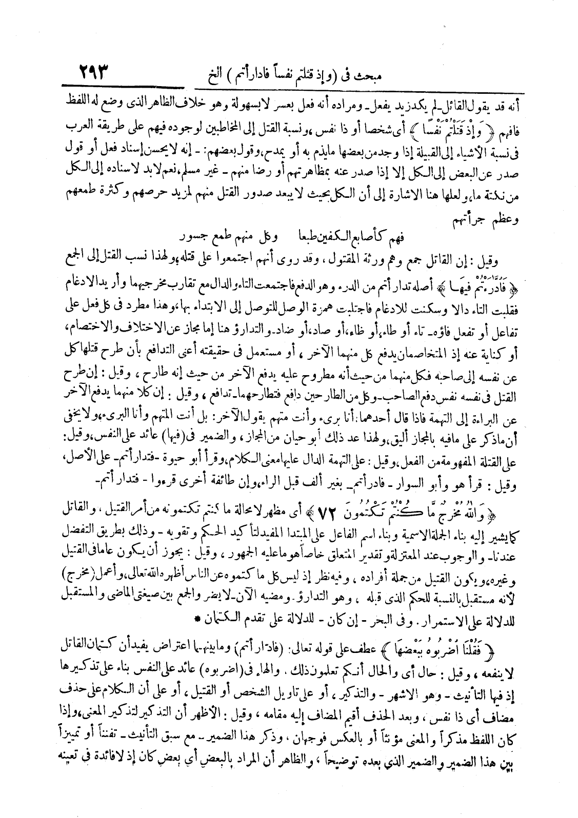 أنه قد يقول القائل لم يكد زيد يفعل ومراده أنه فعل بعسر لا بسهولة وهو خلاف الظاهر الذي وضع له اللفظ فأفهم وإذ قتلتم نفسا أي شخصا أو إذا نفس ونسبة القتل إلى المخاطبين لوجوده فيهم على طريقة العرب في نسبة الأشياء إلى القبيلة إذا وجد من بعضها ما يذم به أو يمدح وقول بعضهم : إنه لا يسحن إسناد فعل أو قول صدر عن البعض إلى الكل إذ إذا صدر عنه بمظاهرتهم أو رضا منه مغير مسلم نعم لابد لإسناده إلى الكل من نكتة ما ولعلها هنا الإشارة إلى أن الكل بحيث لا يبعد صدور القتل منهم لمزيد حرصهم وكثرة طمعهم وعظم جرأتهم فهم كأصابع الكفين طبعا وكل منهم طمع جسور وقيل : إن القاتل جمع وهم ورثة المقتول وقد روى أنهم أجتمعوا على قتله ولهذا نسب القتل إلى الجمع فأدرأتم فيها أصله تدارأتم من الدرء وهو الدفع فأجتمعت التاء والدال مع تقارب مخرجيهما وأريد الإدغام فقلبت التاء دالا وسكنت للإدغام فأجتلبت همزة الوصل للتوصل إلى الإبتداء بها وهذا مطرد في كل فعل على تفاعل أو تفعل فاؤهتاء أو طاء أو ظاء أؤ صاد أو ضاد والتدارؤ هنا إما مجاز عن الإختلاف والإختصام أو كناية عنه إذ المتخاصمان يدفع كل منهما الآخر أو مستعمل في حقيقته أعني التدافع بأن طرح قتلها كل عن نفسه إلى صاحبه فكل منهما من حيث أنه مطروح عليه يدفع الآخر من حيث إنه طارح وقيل : إن طرح القتل في نفسه نفس دفع الصاحب وكل من الطارحين دافع فتطارحه ما تدافع وقيل : إن كلا منهما يدفع الآخر عن البراءة إلى التهمة فإذا قال أحدهما : أنا بريء وأنت متهم يقول الآخر : بل أنت المتهم وأنا البريء ولا يخفى أن ما ذكر على ما فيه بالمجاز أليق ولهذا عد ذلك أبو حيان من المجاز والضمير في فيها عائد على النفس وقيل : على القتلة المفهومة من الفعل وقيل : على التهمة الدال عليها معنى الكلام وقرأ أبو حيوة فتدار أتم على الأصل وقيل : قرأ هو وأبو السوار فادرأتم بغير ألف قبل الراء وإن طائفة أخرى قرؤا فتدار أتم والله مخرج ما كنتم تكتمون 27 أي مظهر لا محالة ما كنتم تكتمونه من أمر القتيل والقاتل كما يشير إليه بناء الجملة الأسمية وبناء أسم الفاعل على المبتدأ المفيد لتأكيد الحكم وتقويه وذلك بطريق التفضل عندنا والوجوب عند المعتزلة وتقدير المتعلق خاصا هو ما عليه الجمهور وقيل : يجوز ان يكون عاما في القتيل وغيره ويكون القتيل من جملة أفرادهوفيه نظر إذ ليس كل ما كتموه عن الناس أظهره الله تعالى وأعمل مخرج لأنه مستقبل بالنسبة للحكم الذي قبله وهو التدارؤومضيه الآنلا يضر والجمع بين صيغتي الماضي والمستقبل للدلالة على الإستمرار وفي البحرإن كان للدلالة على تقدم الكتمان