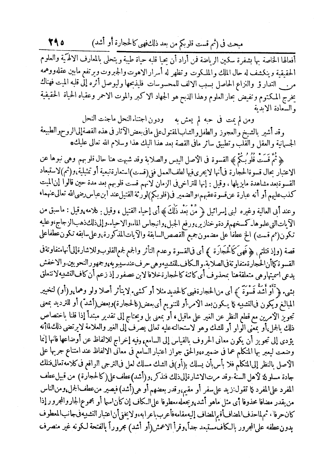 ثم قست قلوبكم القسوة في الأصل اليبس والصلابة وقد شبهت هنا حال قلوبهم وهي نبوها عن الإعتبار بحال قسوة الحجارة في أنها لايجري فيها لطف العمل ففي قست إستعارة تبعية أو تمثيلية و ثم لإستبعاد القسوة بعد مشاهدة ما يزيلها وقيل : إنها للتراخي في الزمان لأنهم قست قلوبهم بعد مدة حين قالوا إن الميت كذب عليهم أو أنه عبارة عن قسوة عقبهم والضمير في قلوبكم لورثة القتيل عند إبن عباس رضي الله تعالى عنهما وعند أبي العالية وغيره لبني إسرائيل من بعد ذلك أي إحياء القتيل وقيل : كلامه وقيل : ما سبق من الآيات التي علموها كمسخهم قردة وخنازير ورفع الجبل وإنبجاس الماء والأحياءوإلى ذلك ذهب الزجاج وعليه تكون ثم قست إلخ عطفا على مضمون جميع القصص السابقة والآيات المذكورة وعلى سابقه تكون عطفا على قصة وإذ قتلتم فهي كالحجارة أي في القسوة وعدم التأثر والجمع لجمع القلوب وللأشارة إلى أنها متفاوتة في القسوة كما أن الحجارة متفاوتة في الصلابة والكاف للتشبيه وهي حرف عند سيبويه وجمهور النحويين والأخفش يدعى أسميتها وهي متعلقة هنا بمحذوف أي كائنة كالحجارة خلافا لإبن عصفور إذ زعم أن كاف التشبيه لا تتعلق بشيء أتو أشد قسوة أي من الحجارة فهي كالحديد مثلا أو كشيء لا يتأثر أصلا ولو وهما و أو لتخيير المبالغ ويكون في التشبيه كما يكون بعد الأمر أو للتنويع أي بعض كالحجارة وبعض أشد أو للترديد بمعنى تجويز الأمرين مع قطع النظر عن الغير على ما قيل أو بمعنى بل ويحتاج إلى تقدير مبتدأ إذا قلنا بإختصاص ذلك بالجمل أو بمعنى الواو أو للشك وهو لإستحالته عليه تعالى يصرف إلى الغير والعلامة لا يرتضى ذلك لما أنه يؤدي إلى تجويز أن يكون معاني الحروف بالقياس إلى السامع وفيه إخراج للإلفاظ عن أوضاعها فإنها إنما وضعت ليعبر بها المتكلم عما في ضميره والحق جواز إعتبار السامع في معاني الألفاظ عند إمتناع جريها على الأصل بالنظر إلى المتكلم فلا بأس بأن يسلك ب أو في الشك مسلك لعل في الترجي الواقع في كلامه تعالى فتلك جادة مسلوكة لأهل السنة وقد مرت الإشارة إلى ذلك فتذكر و أشد عطف على كالحجارة من قبيل عطف المفرد على المفرد كما تقول : زيد على سفر أو مقيم وقدر بعضهم أو هي أشد فيصير من عطف الجمل ومن الناس من يقدر مضافا محذوفا أي مثل ما هو أشد ويجعله معطوفا على الكاف إن كان إسما أو مجموع الجار والمجرور إذا كان حرفا ثم لما حذف المضاف أقيم المضاف إليه مقامه فأعرب بإعرابه ولا يخفى أن إعتبار التشبيه في جانب المعطوف بدون عطفه على المجرور بالكاف مستبعد جدا وقرأ الأعمش أو أشد مجرورا بالفتحة لكونه غير منصرف