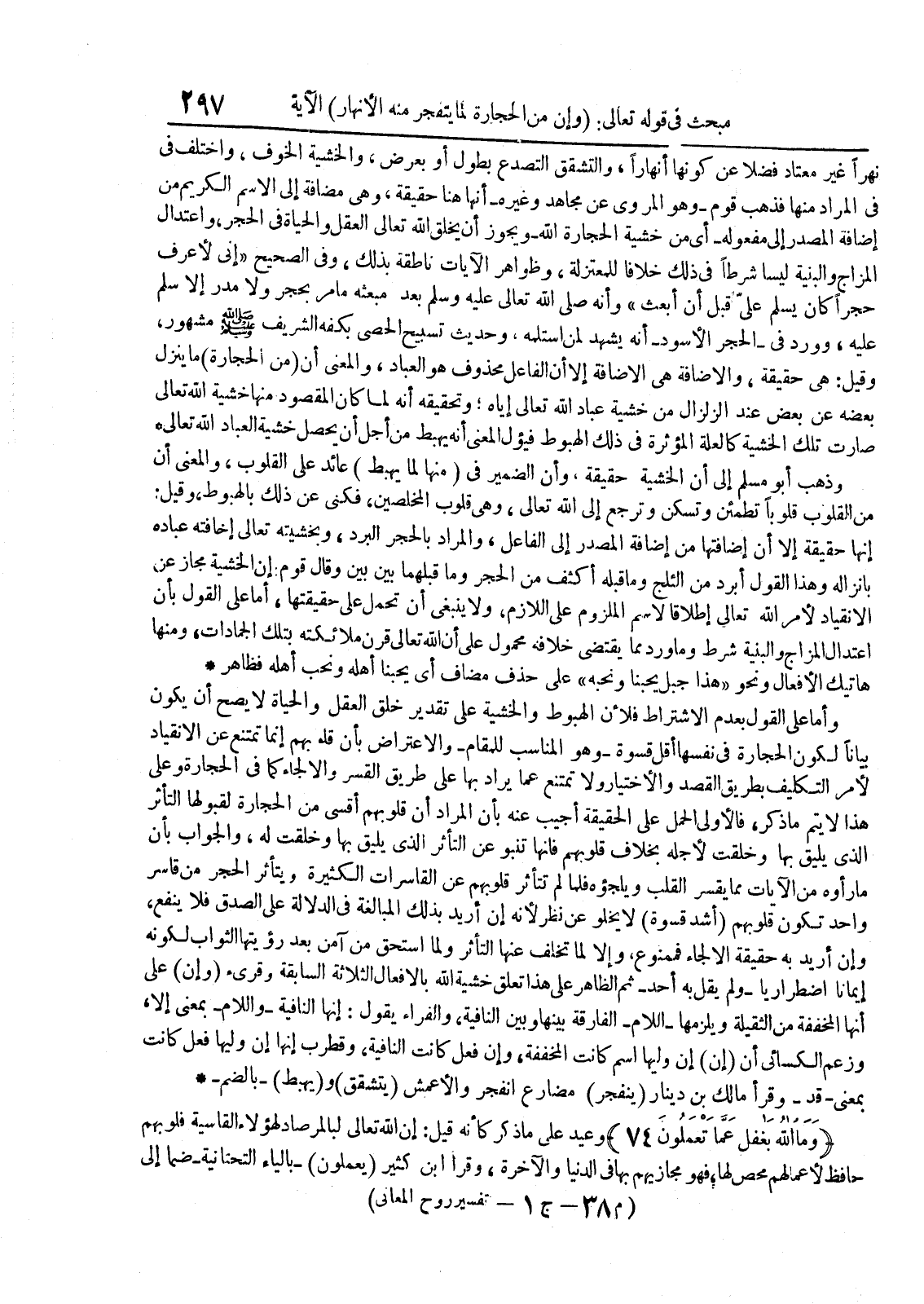 نهرا غير معتاد فضلا عن كونها أنهارا والتشقق التصدع بطول أو بعرض والخشية الخوف وأختلف في المراد منها فذهب قوموهو المروي عن مجاهد وغيرهأنها هنا حقيقة وهي مضافة إلى الأسم الكريم من إضافة المصدر إلى مفعوله أي من خشية الحجارة الله ويجوز أن يخلق الله تعالى العقل والحياة في الحجر وإعتدال المزاج والبنية ليسا شرطا في ذلك خلافا للمعتزلة وظواهر الآيات ناطقة بذلك وفي الصحيح إني لأعرف حجرا كان يسلم على قبل أن أبعث وأنه صلى الله تعالى عليه وسلم بعد مبعثه ما مر بحجر ولا مدر إلا سلم عليه وورد فيالحجر الأسودأنه يشهد لمن أستلمه وحديث تسبيح الحصى بكفه الشريف مشهور وقيل : هي حقيقة والإضافة هي الإضافة إلا أن الفاعل محذوف هو العباد والمعنى أن من الحجارة ما ينزل بعضه عن بعض عند الزلزال من خشية عباد الله تعالى إياه : وتحقيقه أنه لما كان المقصود منها خشية الله تعالى صارت تلك الخشية كالعلة المؤثرة في ذلك الهبوط فيؤل المعنى أنه يهبط من أجل أن يحصل خشية العباد الله تعالى