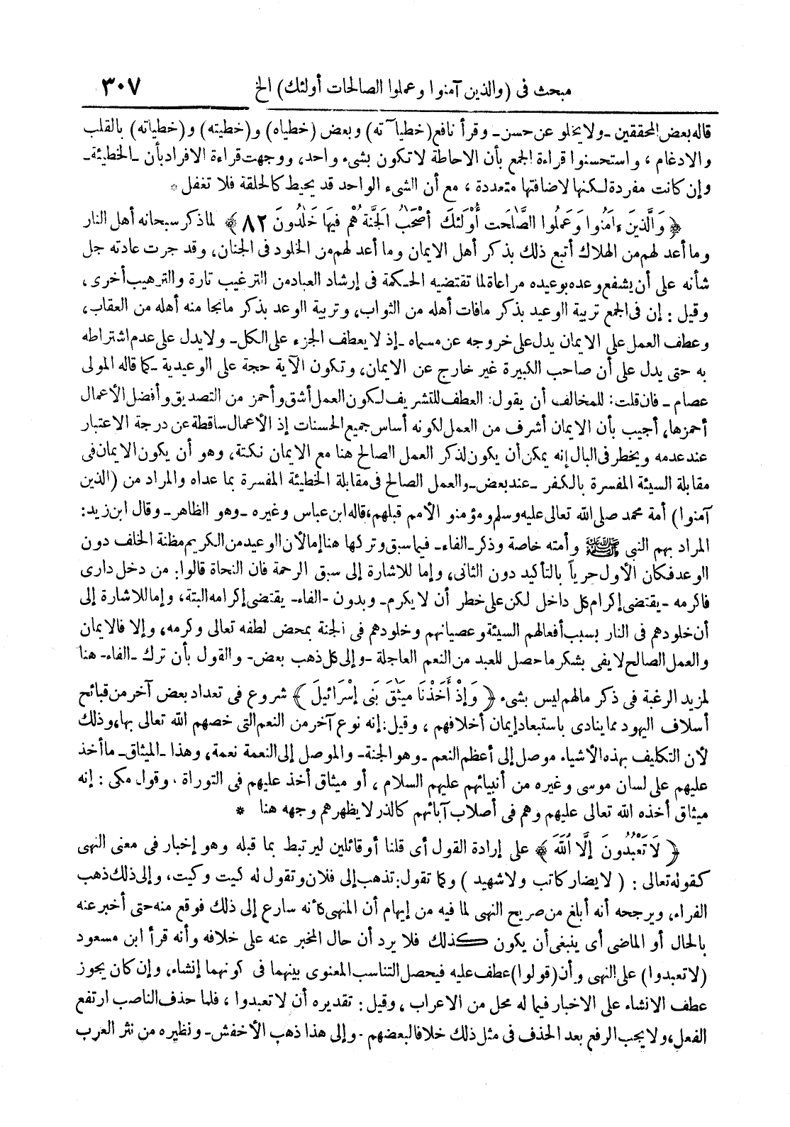 والذين آمنوا وعملوا الصالحات أولئك أصحاب الجنة هم فيها خالدون 28 لما ذكر سبحانه أهل النار وما أعد لهم من الهلاك أتبع ذلك بذكر أهل الإيمان وما أعد لهم من الخلود في الجنان وقد جرت عادته جل شأنه على أن يشفع وعده بوعيده مراعاة لما تقتضيه الحكمة في إرشاد العباد من الترغيب تارة والترهيب أخرى وقيل : إن في الجمع تربية الوعيد بذكر ما فات أهله من الثواب وتربية الوعد بذكر مانجا منه أهله من العقاب وعطف العمل على الإيمان يدل على خروجه عن مسماه إذ لا يعطف الجزء على الكلولا يدل على عدم إشتراطه به حتى يدل على أن صاحب الكبيرة غير خارج عن الإيمان وتكون الآية حجة على الوعيدية كما قاله المولى عصام فإن قلت : للمخالف أن يقول : العطف للتشريف لكون العمل أشق وأحمر من التصديق وأفضل الأعمال أحمزها أجيب بأن الإيمان أشرف من العمل لكونه أساس جميع الحسنات إذ الأعمال ساقطة عن درجة الإعتبار عند عدمه ويخطر في البال إنه يمكن أن يكون لذكر العمل الصالح هنا مع الإيمان نكتة وهو أن يكون الإيمان في مقابلة السيئة المفسرة بالكفرعند بعضوالعمل الصالح في مقابلة الخطيئة المفسرة بما عداه والمراد من الذين آمنوا أمة محمد صلى الله تعالى عليه وسلم ومؤمنو الأمم قبلهم قاله إبن عباس وغيره وهو الظاهر وقال إبن زيد : المراد بهم النبي وأمته خاصة وذكر الفاء فيما سبق وتركها هنا إما لأن الوعيد من الكريم مظنة الخلف دون الوعد فكان الأول حربا بالتأكيد دون الثاني وإما للإشارة إلى سبق الرحمة فإن النحاة قالوا : من دخل داري فأكرمه يقتضي إكرام كل داخل لكن على خطر أن لا يكرم وبدون الفاء يقتضي إكرامه البتة وإما للإشارة إلى أن خلودهم في النار بسبب أفعالهم السيئة وعصيانهم وخلودهم في الجنة بمحض لطفه تعالى وكرمه وإلا فالإيمان والعمل الصالح لا يفي بشكر ما حصل للعبد من النعم العاجلة وإلى كل ذهب بعضوالقول بأن ترك الفاءهنا لمزيد الرغبة في ذكر ما لهم ليس بشيء وإذ أخذنا ميثاق بني إسرائيل شروع في تعداد بعض آخر من قبائح أسلاف اليهود مما ينادي بإستبعاد إيمان أخلافهم وقيل : إنه نوع آخر من النعم التي خصهم الله تعالى بها وذلك لأن التكليف بهذه الأشياء موصل إلى أعظم النعم وهو الجنة والموصل إلى النعمة نعمة وهذأ الميثاق ما أخذ عليهم على لسان موسى وغيره من أنبيائهم عليهم السلام أو ميثاق أخذ عليهم في التوراة وقول مكي : إنه ميثاق أخذه الله تعالى عليهم وهم في أصلاب آبائهم كالذر لا يطهرهم وجهه هنا