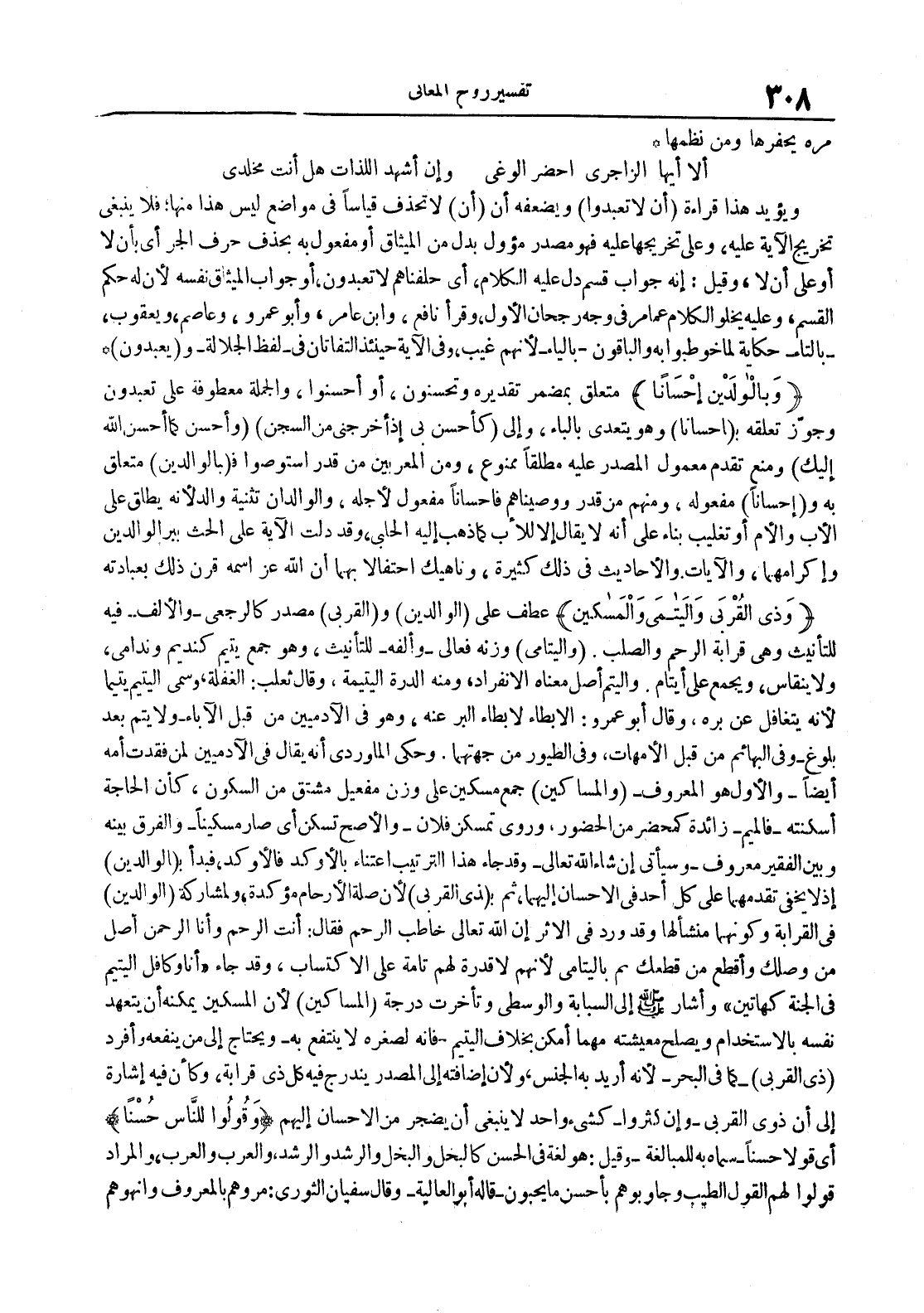 وبالوالدين إحسانا متعلق بمضمر تقديره وتحسنون أو أسحنوا والجملة معطوفة على تعبدون وجوز تعلقه ب إحسانا وهو يتعدى بالباء وإلى كأحسن بي إذ أخرجني من السجن وأحسن كما أحسن الله إليك ومنع تقدم معمول المصدر عليه مطلقا ممنوع ومن المعربين من قدر أستوصوا ف بالوالدين متعلق به و إحسانا مفعوله ومنهم من قدر ووصيناهم فإحسانا مفعول لأجله والوالدان تثنية والد لأنه يطلق على الأب والأم أو تغليب بناء على أنه لا يقال إلا للأب كما ذهب إليه الحلبي وقد دلت الآية على الحث ببر الوالدين وإكرامهما والآيات والأحاديث في ذلك كثيرة وناهيك إحتفالا بهما أن الله عز أسمه قرن ذلك بعبادته وذي القربى واليتامى والمساكين عطف على الوالدين و القربى مصدر كالرجعي والألف فيه للتأنيث وهي قرابة الرحم والصلب واليتامى وزنه فعالى وألفه للتأنيث وهو جمع يتيم كنديم وندامى ولا ينقاس ويجمع على أيتام واليتم أصل معناه الإنفراد ومنه الدرة اليتيمة وقال ثعلب : الغفلة وسمى اليتيم يتيما لأنه يتغافل عن بره وقال أبو عمرو : الإبطاء لإبطاء البر عنه وهو في الآدميين من قبل الآباءولا يتم بعد بلوغ وفي البهائم من قبل الأمهات وفي الطيور من جهتهما وحكى الماوردي أنه يقال في الآدميين لمن فقدت أمه أيضا والأول هو المعروف والمساكين جمع مسكين على وزن مفعيل مشتق من السكون كأن الحاجة أسكنته فالميم زائدة كمحضر من الحضور وروى تمسكن فلان والأصح تسكن أي صار مسكينا والفرق بينه وبين الفقير معروف وسيأتي إن شاء الله تعالى وقد جاء هذا الترتيب إعتناء بالأوكد فالأوكد فبدأ ب الوالدين إذ لا يخفى تقدمهما على كل أحد في الإحسان إليهما ثم ب ذي القربى لأن صلة الأرحام مؤكدة ولمشاركة الوالدين في القرابة وكونهما منشأ لها وقد ورد في الأثر إن الله تعالى خاطب الرحم فقال : أنت الرحم وأنا الرحمن أصل من وصلك واقطع من قطعك ثم باليتامى لأنهم لا قدرة لهم تامة على الإكتساب وقد جاء أنا وكافل اليتيم في الجنة كهاتين واشار إلى السبابة والوسطى وتأخرت درجة المساكين لأن المسكين يمكنه أن يتعهد نفسه بالستخدام ويصلح معيشته مهما أمكن بخلاف اليتيم فإنه لصغره لا ينتفع به ويحتاج إلى من ينفعه وأفرد ذي القربى كما في البحر لأنه أريد به الجنس ولأن إضافته إلى المصدر يندرج فيه كل ذي قرابة وكأن فيه إشارة إلى أن ذوي القربى وإن كثروا كشيء واحد لا ينبغي أن يضجر من الإحسان إليهم وقولوا للناس حسنا أي قولا حسنا سماه به للمبالغة وقيل : هو لغة في الحسن كالبخل والبخل والرشد والرشد والعرب والعرب والمراد قولوا لهم القول الطيب وجاوبوهم بأحسن ما يحبون قاله أبو العالية وقال سفيان الثوري : مروهم بالمعروف وأنهوهم