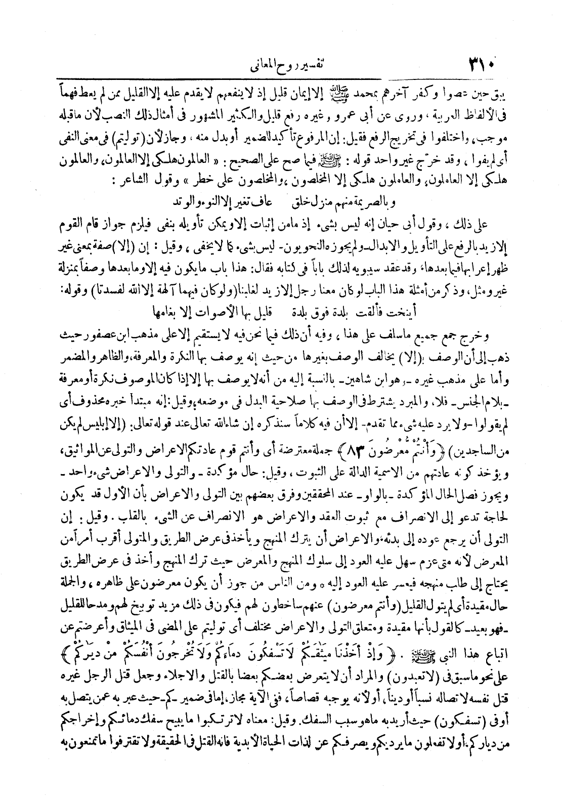 يبقى حين عصوا وكفر آخرهم بمحمد إلا إيمان قليل إذ لا ينفعهم لايقدم عليه إلا القليل ممن لم يعط فهما في الألفاظ العربية وروى عن أبي عمرو وغيره رفع قليل والكثير المشهور في أمثال ذلك النصب لأن ما قبله موجب وأختلفوا في تخريج الرفع فقيل : إن المرفوع تأكيد للضمير أو بدل منه وجاز لأن توليتم في معنى النفي أي لم يفوا وقد خرج غير واحد قوله : فيما صح على الصحيح : العالمون هلكى إلا العالمون والعالمون هلكى إلا العالمون والعالمون هلكى إلا المخلصون والمخلصون على خطر وقول الشاعر : وبالصريمة منهم منزل خلق عاف تغير إلا النوء والوتد على ذلك وقول أبي حيان إنه ليس بشيء إذ ما من إثبات إلا ويمكن تأويله بنفي فيلزم جواز قام القوم إلا زيد بالرفع على التأويل والإبدالولم يجوزه النحويون ليس بشيء كما لايخفى وقيل : إن لا صفة بمعنى غير ظهر إعرابها فيما بعدها وقد عقد سيبويه لذلك بابا في كتابه فقال : هذا باب ما يكون فيه إلا وما بعدها وصفا بمنزلة غير ومثل وذكر من أمثلة هذا الباب لو كان معنا رجل إلا زيد لغلبنا ولو كان فيهما آلهة إلا الله لفسدتا وقوله : أينخت فألقت بلدة فوق بلدة قليل بها الأصوات إلا بغامها وخرج جمع جميع ما سلف على هذا وفيه أن ذلك فيما نحن فيه لا يستقيم إلا على مذهب إبن عصفور حيث ذهب إلى أن الوصف ب إلا يخالف الوصف بغيرها من حيث إنه يوصف بها النكرة والمعرفة والظاهر والمضمر وأما على مذهب غيره وهو إبن شاهين بالنسبة إليه من أنه لا يوصف بها إلا إذا كان الموصوف نكرة أو معرفة بلام الجنس فلا والمبرد يشترط في الوصف بها صلاحية البدل في موضعه وقيل : إنه مبتدأ خبره محدوف أي لم يقولواولا يرد عليه شيء مما تقدم إلا أن فيه كلاما سنذكره إن شاء الله تعالى عند قوله تعالى : إلا إبليس لم يكن من الساجدين وأنتم معرضون 38 جملة معترضة أي وأنتم قوم عادتكم الأعراض والتولي عن المواثيق ويؤخذ كونه عادتهم من الأسمية الدالة على الثبوت وقيل : حال مؤكدة والتولي والأعراض شيء واحد ويجوز فصل الحال المؤكدة بالواو عند المحققين وفرق بعضهم بين التولي والأعراض بأن الأول قد يكون لحاجة تدعو إلى الإنصراف مع ثبوت العقد والأعراض هو الإنصراف عن الشيء بالقلب وقيل : إن التولي أن يرجع عوده إلى بدئه والإعراض أن يترك المنهج ويأخذ في عرض الطريق والمتولي أقرب أمرا من المعرض لأنه متى عزم سهل عليه العود إلى سلوك المنهج والمعرض حيث ترك المنهج واحد في عرض الطريق يحتاج إلى طلب منهجه فيعسر عليه العود إليه