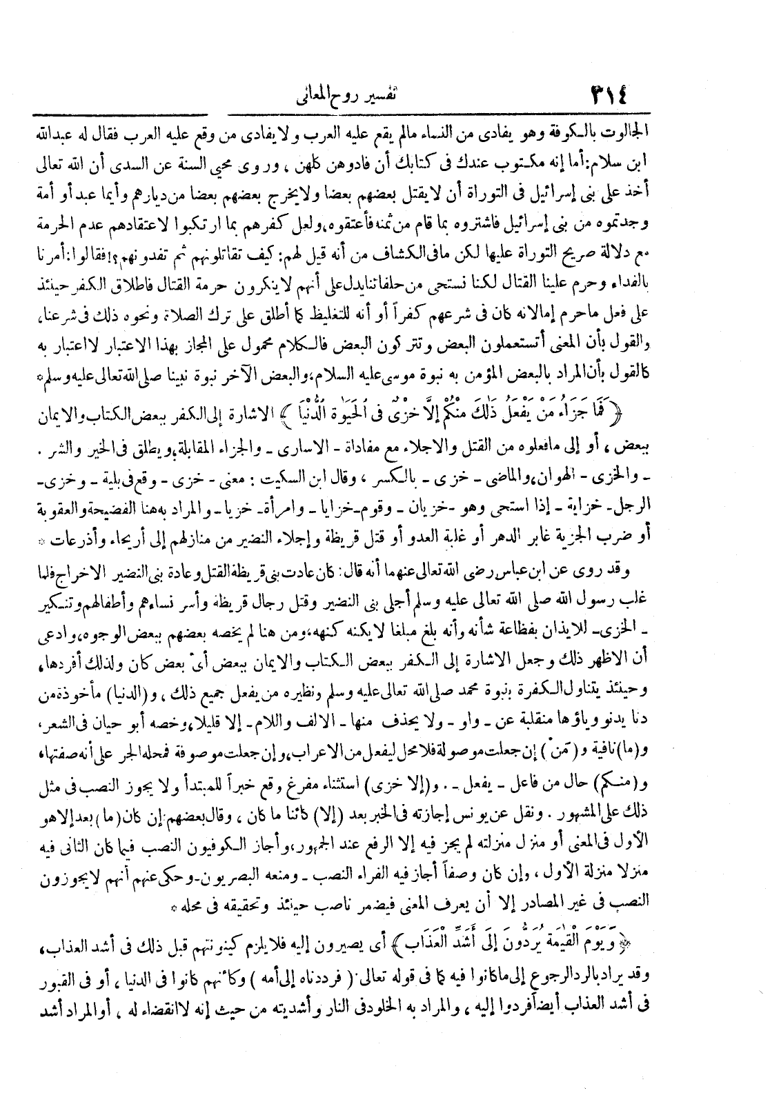 الجالوت بالكوفة وهو يفادي من النساء ما لم يقع عليه العرب ولا يفادي من وقع عليه العرب فقال له عبدالله إبن سلام : أما إنه مكتوب عندك في كتابك أن فادوهن كلهن وروى محيي السنة عن السدي أن الله تعالى أخذ على بني إسرائيل في التوراة أن لا يقتل بعضهم بعضا ولايخرج بعضهم بعضا من ديارهم وأيما عبد أو أمة وجدتموه من بني إسرائيل فأشتروه بما قام من ثمنه فأعتقوه ولعل كفرهم بما أرتكبوا لإعتقادهم عدم الحرمة مع دلالة صريح التوراة عليها لكن ما في الكشاف من أنه قيل لهمك كيف تقاتلونهم ثم تفدوهم ! فقالوا : أمرنا بالفداء وحرم علينا القتال لكنا نستحي من حلفاتنا يدل على أنهم لا ينكرون حرمة القتال فإطلاق الكفر حينئذ على فعل ما حرم إما لأنه كان في شرعهم كفرا أو أنه للتغليظ كما أطلق على ترك الصلاة ونحوه ذلك في شرعنا والقول بأن المعنى أتستعملون البعض وتتركون البعض فالكلام محمول على المجاز بهذا الإعتبار لا إعتبار به كالقول بأن المراد بالبعض المؤمن به نبوة موسى عليه السلام والبعض الآخر نبوة نبينا صلى الله تعالى عليه وسلم
