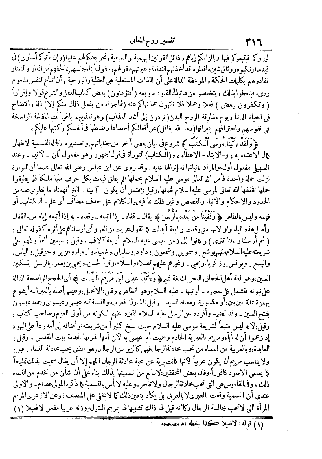 ولقد آتينا موسى الكتاب شروع في بيان بعض آخر من جناياتهم وتصديره بالجملة القسمية لإظهار كمال الإعتناء به والإيتاء الإعطاء و الكتاب التوراة في قول الجمهور وهو مفعول ثان لآتينا وعند السهيلي مفعول أول والمراد بإتيانها له إنزالها عليه وقد روى عن إبن عباس رضي الله تعالى عنهما أن التوراة نزلت جملة واحدة فأمر الله تعالى موسى عليه السلام بحملها فلم يطق فبعث بكل حرف منها ملكا فلم يطيقوا حملها فخففها الله تعالى لموسى عليه السلام فحملها وقيل : يحتمل أن يكون آتينا إلخ أفهمناه ما أنطوى عليه من الحدود والأحكام والأنباء والقصص وغير ذلك مما فيه والكلام على حذف مضاف أي علم الكتاب أو فهمه وليس بالظاهر وقفينا من بعده بالرسل يقال قفاه إذا أتبعه وقفا هبه إذا أتبعه إياه من القفا وأصل هذه الياء واو لأنها متى وقعت رابعة أبدلت كما تقول عريت من العرو أي أرسلناهم على أثره كقوله تعالى : ثم أرسلنا رسلنا تترى وكانوا إلى زمن عيسى عليه السلام أربعة آلاف وقيل : سبعين ألفا وكلهم على شريعته عليه السلام منهم يوشع وشمويل وشمعون وداؤد وسليمان وشعيا وأرمياء وعزير وحزقيل والياس واليسع ويونس وزكريا ويحيى وغيرهم عليهم الصلاة والسلام وقرأ الحسن ويحيى بن يعمر بالرسل بتسكين السين وهو لغة أهل الحجاز والتحريك لغة تميم وأتينا عيسى إبن مريم البينات أي الحجج الواضحة الدالة على نبوته فتشمل كل معجزة أوتيها عليه السلام وهو الظاهر وقيل : الإنجيل وعيسى أصله بالعبرانية أيشوع بهمزة ممالة بين بين أو مكسورة ومعناه السيد وقيل : المبارك فعرب والتسبة إليه عيسى وعيسوى وجمعه عيسون بفتح السين وقد تضم وأفرده عن الرسل عليه السلام لتميزه عنهم لكونه من أولى العزم وصاحب كتاب وقيل : لأنه ليس متبعا لشريعة موسى عليه السلام حيث نسخ كثيرا من شريعته وأضافه إلى أمه ردا على اليهود إذ زعموا أن له أبا ومريم بالعبرية الخادم وسميت أم عيسى به لأن أمها نذرتها لخدمة بيت المقدس وقيل : العابدة وبالعربية من النساء من تحب محادثة الرجال فهي كالزير من الرجال وهو الذي يحب محادثة النساء وقيل : ولا يناسب مريم أن يكون عربيا لأنها كانت برية عن محبة محادثة الرجال اللهم إلا أن يقال سميت بذلك تمليحا كما يسمى الأسود كافورا وقال بعض المحققين : لأ مانع من تسميتها بذلك بناء على أن شأن من تخدم من النساء ذلك وفي القاموس هي التي تحب محادثة الرجال ولا تفجر وعليه لا بأس بالتسمية كما ذكره المولى عصام والأولى عندي أن التسمية وقعت بالعبري لا بالعربي بل يكاد يتعين ذلك كما لا يخفى على المنصف وعن الأزهري المريم المرأة التي لا تحب مجالسة الرجال وكأنه قيل لها ذلك تشبيها لها بمريم البتول ووزنه عربيا مفعل لا فعيلا