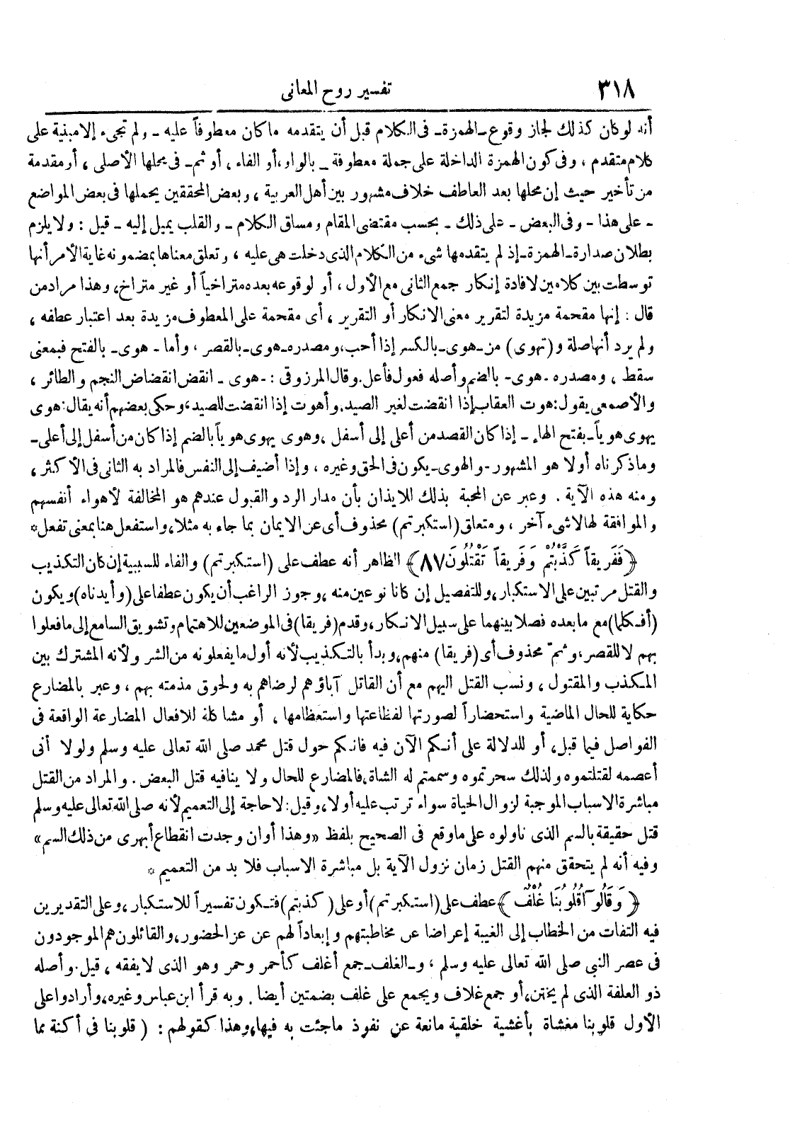 أنه لو كان كذلك لجاز وقوع الهمزة في اللاكلام قبل أن يتقدمه ما كان معطوفا عليه ولم تجيء إلا مبنية على كلام متقدم وفي كون الهمزة الداخلة على جملة معطوفة بالواو أو الفاء أو ثمفي محلها الأصلي أو مقدمة من تأخير حيث إن محلها بعد العاطف خلاف مشهور بين أهل العربية وبعض المحققين يحملها في بعض المواضع على هذأ وفي البعض على ذلك بحسب مقتضى المقام ومساق الكلام والقلب يميل إليه قيل : ولا يلزم بطلان صدارةالهمزةإذ لم يتقدمها شيء من الكلام الذي دخلت هي عليه وتعلق معناها بمضمونه غاية الأمر أنها توسطت بين كلامين لإفادة إنكار جمع الثاني مع الأول أو لوقوعه بعده متراخيا أو غير متراخ وهذا مراد من قال : إنها مقحمة مزيدة لتقرير معنى الإنكار أو التقرير أي مقحمة على المعطوف مزيدة بعد إعتبار عطفه ولم يرد أنها صلة و تهوى منهوى بالكسر إذا أحب ومصدره هوى بالقصر وأما هوى بالفتح فبمعنى سقط ومصدره هوى بالضم وأصله فعول فاعل وقال المرزوقي : هوى إنقض إنقضاض النجم والطائر والأصمعي يقول : هوت العقاب إذا أنقضت لغير الصيد وأهوت إذا أنقضت للصيد وحكى بعضهم أنه يقال : هوى يهوى هويا بفتح الهاءإذا كان القصد من أعلى إلى أسفل وهوى يهوى هويا بالضم إذا كان من أسفل إلى أعلى وما ذكرناه أولا هو المشهوروالهوى يكون في الحق وغيره وإذا أضيف إلى النفس فالمراد به الثاني في الأكثر ومنه هذه الآية وعبر عن المحبة بأن مدار الرد والقبول عندهم هو المخالفة لأهواء أنفسهم والموافقة لها لا شيء آخر ومتعلق أستكبرتم محذوف أي عن الإيمان بما جاء به مثلا وأستفعل هنا بمعنى تفعل