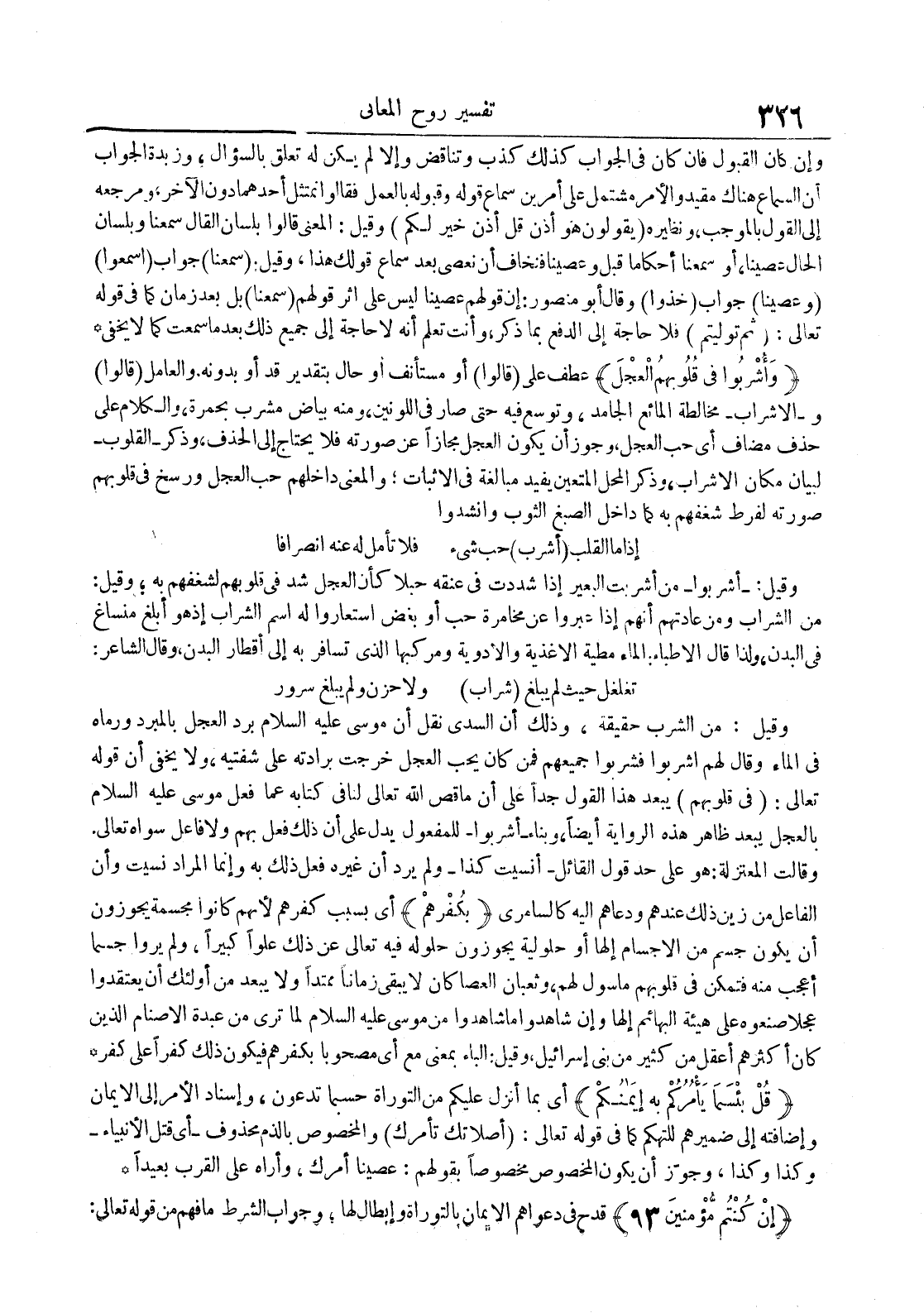 وأشربوا في قلوبهم العجل عطف على قالوا أو مستأنف أو حال بتقدير قد أو بدونه والعامل قالوا والأشرابمخالطة المائع الجامد وتوسع فيه حتى صار في اللونين ومنه بياض مشرب بحمرة والكلام على حذف مضاف أي حب العجل وجوز أن يكون العجل مجازا عن صورته فلا يحتاج إلى الحذف وذكرالقلوبلبيان مكان الأشراب وذكر المحل المتعين يفيد مبالغة في الإثبات والمعنى داخلهم حب العجل ورسخ في قلوبهم صورته لفرط شغفهم به كما داخل الصبغ الثوب وأنشدوا إذا ما القلب أشرب حب شيء فلا تأمل له عنه إنصرافا وقيل : أشربوامن أشربت البعير إذا شددت في عنقه حبلا كأن العجل شد في قلوبهم لشغفهم به وقيل : من الشراب ومن عادتهم أنهم إذا عبروا عن مخامرة حب أو بغض إستعاروا له أسم الشراب إذ هو أبلغ منساغ في البدن ولذا قال الأطباء : الماء مطيةالأغذية والأدوية ومركبها الذي تسافر به إلى أقطار البدن وقال الشاعر : تغلغل حيث لم يبلغ شراب ولا حزن ولم يبلغ سرور وقيل : من الشرب حقيقة وذلك أن السدي نقل أن موسى عليه السلام برد العجل بالمبرد ورماه في الماء وقال لهم أشربوا فشربوا جميعهم فمن كان يحب العجل خرجت برادته على شفتيه ولا يخفى أن قوله تعالى : في قلوبهم يبعد هذا القول جدا على أن ما قص الله تعالى لنا في كتابه عما فعل موسى عليه السلام بالعجل يبعد ظاهر هذه الرواية أيضا وبناءأشربواللمفعول يدل على أن ذلك فعل بهم ولا فاعل سواه تعالى وقالت المعتزلة : هو على حد قول القائل أنسيت كذاولم يرد أن غيره فعل ذلك به وإنما المراد نسيت وأن الفاعل من زين ذلك عندهم ودعاهم إليه كالسامري بكفرهم أي بسبب كفرهم لأنهم كانوا مجسمة يجوزون أن يكون جسم من الأجسام إلها أو حلولية يجوزون حلوله فيه تعالى عن ذلك علوا كبيرا ولم يروا جسما أعجب منه فتمكن في قلوبهم ماسول لهم وثعبان العصا كان لا يبقى زمانا ممتدا ولا يبعد من أولئك أن يعتقدوا عجلا صنعوه على هيئة البهائم إلها وإن شاهدوا ما شاهدوا من موسى عليه السلام لما ترى من عبدة الأصنام الذين كان أكثرهم أعقل من كثير من بني إسرائيل وقيل : الباء بمعنى مع أي مصحوبا بكفرهم فيكون ذلك كفرا على كفر