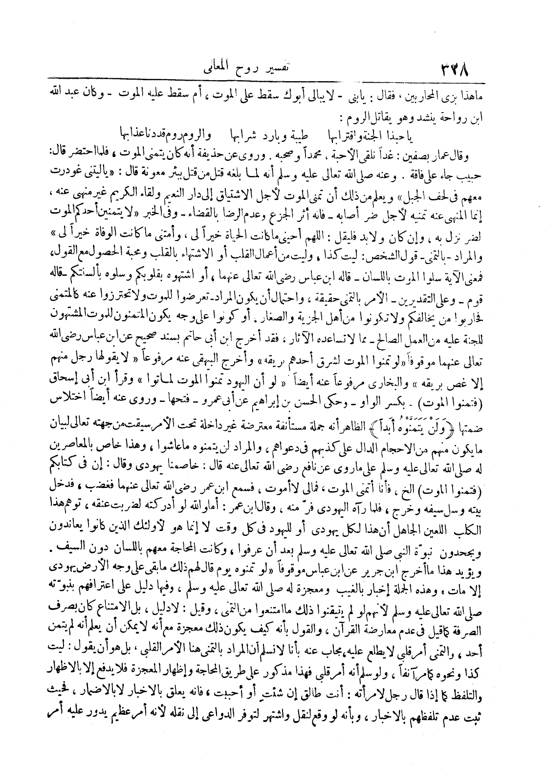 ما هذا بزي المحاربين فقال : يا بني لا يبالي أبوك سقط على الموت أم سقط عليه الموت وكان عبدالله إبن رواحة ينشد وهو يقاتل الروم : ياحبذا الجنة وإقترابها طيبة وبارد شرابها والروم روم قد دنا عذابها وقال عمار بصفين : غدا نلقي الأحبة محمدا وصحبه وروى عن حذيفة أنه كان يتمنى الموت فلما أحتضر قال : حبيب جاء على فاقة وعنه صلى الله تعالى عليه وسلم أنه لما بلغه قتل من قتل ببئر معونة قال : ياليتني غودرت معهم في لحف الجبل ويعلم من ذلك أن تمني الموت لأجل الإشتياق إلى دار النعيم ولقاء الكريم غير منهي عنه إنما النهي عنه تمنيه لأجل ضر أصابهفإنه أثر الجزع وعدم الرضا بالقاضءوفي الخبر لا يتمنين أحدكم الموت لضر نزل به وإن كان ولا بد فليقل : اللهم أحيني ما كانت الحياة خيرا لي وأمتني ما كانت الوفاة خيرا لي والمراد بالتمني قول الشخص : ليت كذا وليت من أعمال القلب أو الإشتهاء بالقلب ومحبة الحصول مع القول فمعنى الآية سلوا الموت باللسان قاله إبن عباس رضي الله تعالى عنهما أو أشتهوه بقلوبكم وسلوه بألسنتكم قاله قوموعلى التقديرين الأمر بالتمني حقيقة وإحتمال أن يكون المراد تعرضوا للموت ولا تحترزوا عنه كالمتمني فحاربوا من يخالفكم ولا تكونوا من أهل الجزية والصغار أو كونوا على وجه يكون المتمنون للموت المشتهون للجنة عليه من العمل الصالحمما لا تساعده الآثار فقد أخرج إبن أبي حاتم بسند صحيح عن إبن عباس رضي الله تعالى عنهما موقوفا لو تمنوا الموت لشر ق أحدهم بريقه وأخرج البيهقي عنه مرفوعا لا يقولها رجل منهم إلا غص بريقه والبخاري مرفوعا عنه أيضا لو أن اليهود تمنوا الموت لماتوا وقرأ إبن أبي إسحاق فتمنوا الموت بكسر الواو وحكى الحسن بن إبراهيم عن أبي عمر وفتحها وروى عنه أيضا إختلاس ضمتها ولن يتمنوه أبدا الظاهر أنه جملة مستأنفة معترضة غير داخلة تحت الأمر سيقت من جهته تعالى لبيان ما يكون مبهم من الأحجام الدال على كذبهم في دعواهم والمراد لن يتمنوه ما عاشوا وهذا خاص بالمعاصرين له صلى الله تعالى عليه وسلم على ما روى عن نافع رضي الله تعالى عنه قال : خاصمنا يهودي وقال : إن في كتابكم فتمنوا الموت إلخ فأنا أتمنى الموت فمالي لا أموت فسمع إبن عمر رضي الله تعالى عنهما فغضب فدخل بيته وسل سيفه وخرج فلما رآه اليهودي فر منه وقال إبن عمر : أما والله لو أدركته لضربت عنقه توهم هذا الكلب اللعين الجاهل أن هذا لكل يهودي أو لليهود في كل وقت لا إنما هو لأولئك الذين كانوا يعاندون ويجحدون نبوة النبي صلى الله تعالى عليه وسلم بعد أن عرفوا وكانت المحاجة معهم باللسان دون السيف ويؤيد هذا ما أخرج إبن جرير عن إبن عباس موقوفا لو تمنوه يوم قال لهم ذلك ما بقى على وجه الأرض يهودي إلا مات وهذه الجملة إخبار بالغيب ومعجزة له صلى الله تعالى عليه وسلم وفيها دليل على إعترافهم بنبوته صلى الله تعالى عليه وسلم لأنهم لو لم يتيقنوا ذلك ما أمتنعوا من التمني وقيل : لا دليل بل الإمتناع كان بصرف الصرفة كما قيل في عدم معارضة القرآن والقول بأنه كيف يكون ذلك معجزة مع أنه لا يمكن أن يعلم أنه لم يتمن أحد والتمني أمر قلبي لا يطلع عليه مجاب عنه بأنا لا نسلم أن المراد بالتمني هنا الأمر القلبي بل هو أن يقول : ليت كذا ونحوه كما مر آنفا ولو سلم أنه أمر قلبي فهذا مذكور على طريق المحاجة وإظهار المعجزة فلا يدفع إلا بالإظهار والتلفظ كما إذا قال رجل لأمرأته : أنت طالق إن شئت أو أحببت فإنه يعلق بالأخبار لا بالإضمار فحيث ثبت عدم تلفظهم بالاخبار وبأنه لو وقع لنقل وأشتهر لتوفر الدواعي إلى نقله لأنه أمر عظيم يدور عليه أمر