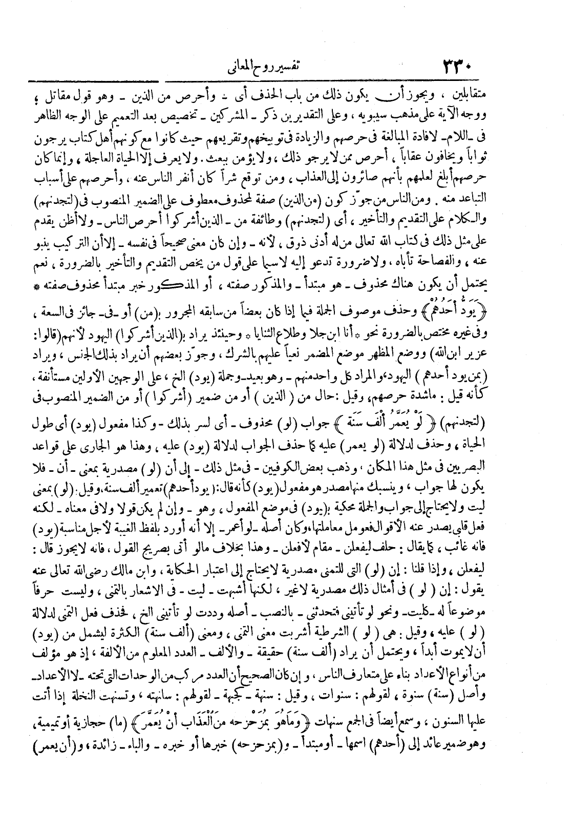 متقابلين ويجوز أن يكون ذلك من باب الحذف أيوأحرص من الذينوهو قول مقاتل ووجه الآية على مذهب سيبويه وعلى التقديرين ذكرالمشركين تخصيص بعد التعميم على الوجه الظاهر في اللام لإفادة المبالغة في حرصهم والزيادة توبيخهم وتقريعهم حيث كانوا مع كونهم أهل كتاب يرجون ثوابا ويخافون عقابا أحرص ممن لا يرجو ذلك ولا يؤمن ببعث ولا يعرف إلا الحياة العاجلة وإنما كان حرصهم أبلغ لعلمهم بأنهم صائرون إلى العذاب ومن توقع شرا كان أنفر الناس عنه وأحرصهم على أسباب التباعد منه ومن الناس من جوز كون من الذين صفة لمحذوف معطوف على الضمير المنصوب في لتجدنهم والكلام على التقديم والتأخير أي لتجدنهم وطائفة منالذين أشركوا أحرص الناسولا أظن يقدم على مثل ذلك في كتاب الله تعالى من له أدنى ذوق لأنه وإن كان معنى صحيحا في نفسهإلا أن التركيب ينبو عنه والفصاحة تأباه ولا ضرورة تدعو إليه لا سيما على قول من يخص التقديم والتأخير بالضرورة نعم يحتمل أن يكون هناك محذوفهو مبتدأوالمذكور صفته أو المذكور خبر مبتدأ محذوف صفته