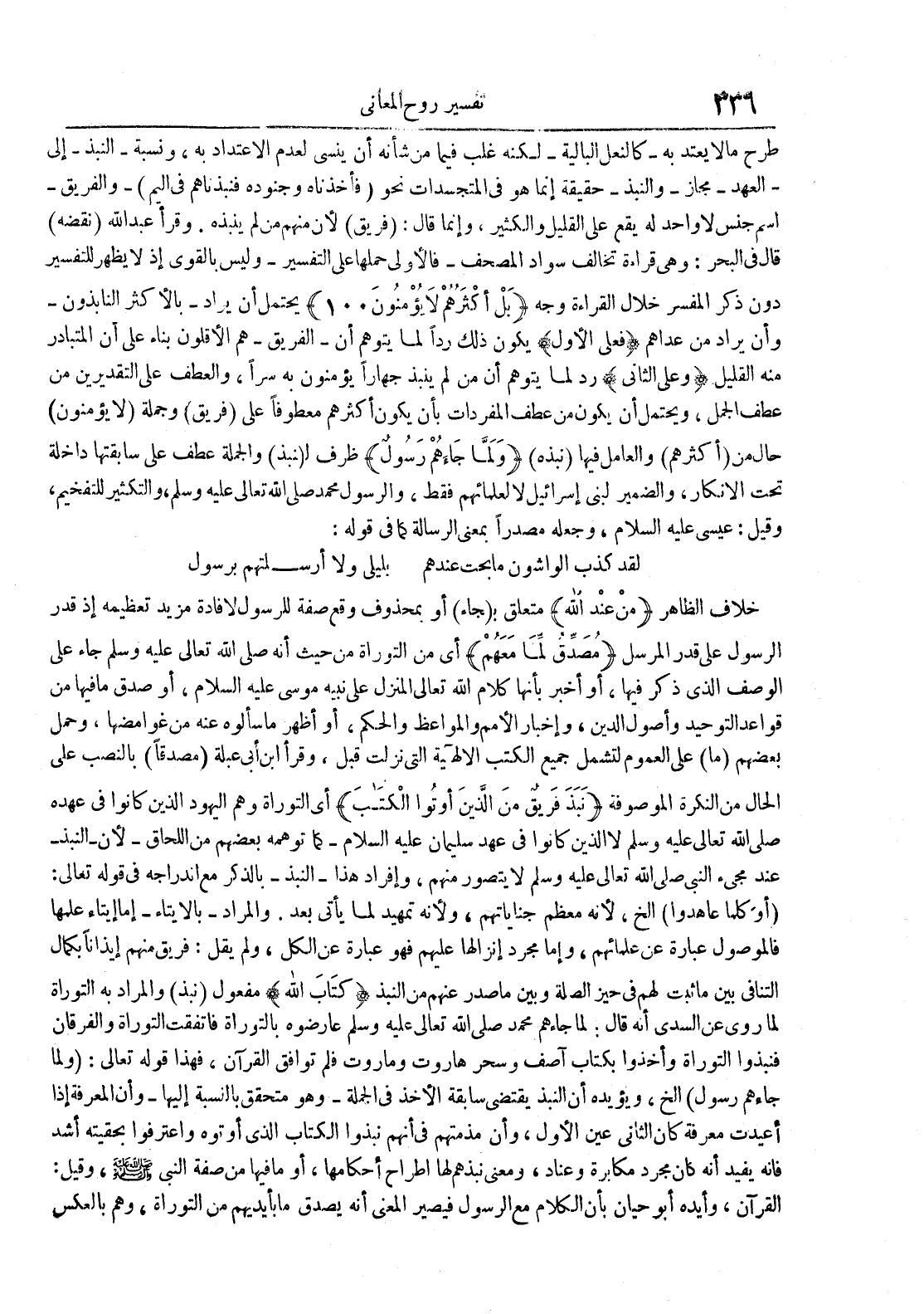 طرح ما لا يعتد به كالنعل البالية لكنه غلب فيما من شأنه أن ينسى لعدم الإعتداد به ونسبة النبذ إلىالعهد مج إنما هو في المتجسدات نحو فأخذناه وجنوده فنبذناهم في اليم والفريق أسم جنس لا واحد له يقع على القليل والكثير وإنما قال : فريق لأن منهم من لم ينبذه وقرأ عبدالله نقضه قال في البحر : وهي قراءة تخالف سواد المصحف فالأولى حملها على التفسير وليس بالقوي إذ لا يظهر للتفسير دون ذكر المفسر خلال القراءة وجه بل أكثرهم لايؤمنون 001 يحتمل أن يراد بالأكثر النابذون وأن يراد من عداهم فعلى الأول يكون ذلك ردا لما يتوهم أنا لفريقهم الأقلون بناء على أن المتبادر منه القليل وعلى الثاني رد لما يتوهم أن من لم ينبذ جهارا يؤمنون به سرا والعطف على التقديرين من عطف الجمل ويحتمل أن يكون من عطف المفردات بأن يكون أكثرهم معطوفا على فريق وجملة لا يؤمنون حال من أكثرهم والعامل فيها نبذه ولما جاءهم رسول ظرف ل نبذ والجملة عطف على سابقتها داخلة تحت الإنكاروالضمير لبني إسرائيل لا لعلمائهم فقط والرسول محمد صلى الله تعالى عليه وسلم والتكثير للتفخيم وقيل : عيسى عليه السلام وجعله مصدرا بمعنى الرسالة كما في قوله : لقد كذب الواشون ما بحت عندهم بليلى ولا أرسلتهم برسول خلاف الظاهر من عند الله متعلق ب جاء أو بمحذوف وقع صفة للرسول لإفادة مزيد تعظيمه إذ قدر الرسول على قدر المرسل مصدق لما معهم أي من التوراة من حيث أنه صلى الله تعالى عليه وسلم جاء على الوصف الذي ذكر فيها أو أخبر بأنها كلام الله تعالى المنزل على نبيه موسى عليه السلام أو صدق ما فيها من قواعد التوحيد وأصول الدين وإخبار الأمم والمواعظ والحكم أو أظهر ما سألوه عنه من غوامضها وحمل بعضهم ما على العموم لتشمل جميع الكتب الآلهية التي نزلت قبل وقرأ إبن أبي عبلة مصدقا بالنصب على الحال من النكرة الموصوفة نبذ فريق من الذين أوتوا الكتاب أي التوراة وهم اليهود الذين كانوا في عهده صلى الله تعالى عليه وسلم لا الذين كانوا في عهد سليمان عليه السلام كما توهمه بعضهم من اللحاق لأن النبذ عند مجيء النبي صلى الله تعالى عليه وسلم لا يتصور منهم وإفراد هذا النبذ بالذكر مع إندراجه في قوله تعالى : أو كلما عاهدوا إلخ لأنه معظم جناياتهم ولأنه تمهيد لما يأتي بعد والمراد بالإيتاء إما إيتاء علمها فالموصول عبارة عن علمائهم وإما مجرد إنزالها عليهم فهو عبارة عن الكل ولم يقل : فريق منهم إيذانا بكمال التنافي بين ما ثبت لهم في حيز الصلة وبين ما صدر عنهم من النبذ كتاب الله مفعول نبذ والمراد به التوراة لما روى عن السدي أنه قال : لما جاءهم محمد صلى الله تعالى عليه وسلم عارضوه بالتوراة فأتفقت التوراة والفرقان فنبذوا التوراة وأخذوا بكتاب آصف وسحر هاروت وماروت فلم توافق القرآن فهذا قوله تعالى : ولما جاءهم رسول إلخ ويؤيده أن النبذ يقتضي سابقة الأخذ في الجملةوهومتحقق بالنسبة إليهاوأن المعرفة إذا أعيدت معرفة كان الثاني عين الأولوأن مذمتهم في أنهم نبذوا الكتاب الذي أوتوه وأعترفوا بحقيته أشد فإنه يفيد أنه كان مجرد مكابرة وعناد ومعنى نبذهم لها إطراح أحكامها أو ما فيها من صفة النبي وقيل : القرآن ؤايده أبو حيان بأن الكلام مع الرسول فيصير المعنى أنه يصدق ما بأيديهم من التوراة وهم بالعكس