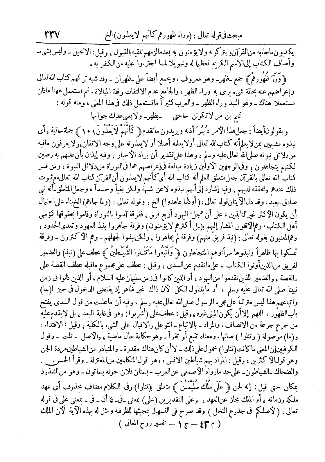 ورآ ظهورهم جمع ظهر معروف ويجمع أيضا على ظهران وقد شبه تركهم كتاب الله تعالى وإعراضهم عنه بحالة شيء يرمي به وراء الظهر والجامع عدم الإلتفات وقلة المبالاة ثم أستعمل ههنا ما كان مستعملا هناك وهو النبد وراء الظهر والعرب كثيرا ما تستعمل ذلك في هذا المعنى ومنه قوله : تميم بن مر لا تكونن حاجتي بظهر ولا يعيي عليك جوابها ويقولون أيضا : جعل هذا الأمر دبر أذنه ويريدون ما تقدم كأنهم لا يعلمون 101 جملة حالية أي نبذوه مشبهين بمن لا يعلم أنه كتاب الله تعالى أولا يعلمه أصلا أو لا يعلمونه على وجه الإتقان ولا يعرفون ما فيه من دلائل نبوته صلى الله تعالى عليه وسلم وهذا على تقدير أن يراد الأحبار وفيه إيذان بأن علمهم به رصين لكنهم يتجاهلون وفي الوجهين الأولين زيادة مبالغة في إعراضهم عما في التوراة من دلائل النبوة ومن فسر كتاب الله تعالى بالقرآن جعل متعلق العلم أنه كتاب الله أي كأنهم لا يعلمون أن القرآن كتاب الله تعالى مع ثبوت ذلك عندهم وتحقه لديهم وفيه إشارة إلى أنهم نبذوه لا عن شبهة ولكن بغيا وحسدا وجعل المتعلق أنه نبي صادق بعيد وقد دلت الآيتان قوله تعالى : أو كلما عاهدوا إلخ وقوله تعالى : ولما جاءهم إلخ بناء على إحتمال أن يكون الأكثر غير النابذين على أن جل اليهود أربع فرق ففرقة آمنوا بالتوراة وقاموا بحقوقها كمؤمني أهل الكتاب وهم الأقلون المشار إليهم ب بل أكثرهم لايؤمنون وفرقة جاهروا بنبذ العهود وتعدي الحدود وهم المعنيون بقوله تعالى : نبذ فريق منهم وفرقة لم يجاهروا ولكن نبدوا لجهلهم وهم الأكثر ونوفرقة تمسكوا بها ظاهرا ونبذوها سرا وهم المتجاهلون وأتبعوا ما تتلوا الشياطين عطف على نبذ والضمير لفريق من الذين أوتوا الكتاب على ما تقدم عن السدي وقيل : عطف على مجموع ما قبله عطف القصة على القصة والضمير للذين تقدموا من اليهود أو الذين كانوا في زمن سليمان عليه السلام أو الذين كانوا في زمن نبينا صلى الله تعالى عليه وسلم أو ما يتناول الكل لأن ذاك غير ظاهر إذ يقتضي الدخول في حيز ل ما وإتباعهم هذا ليس مترتبا على مجيء الرسول صلى الله تعالى عليه وسلم وفيه ان ما علمت من قول السدي يفتح باب الظهور اللهم إلا أن يكون المبني غيره وقيل : عطف على أشربوا وهو في غاية البعد بل لا يقدم عليه من جرع جرعة من الإنصاف والمراد بالإتباع التوغل والإقبال على الشيء بالكلية وقيل : الإقتداء و ما موصولة وتتلوا صلتها ومعناه تتبع أو تقرأ وهو حكاية حال ماضية والأصل تلت وقول الكوفيين إن المعنى ما كانت تتلوا محمول على ذلك لا أن كان هناك مقدرة والمتبادر من الشياطين مردة الجن وهو قول الأكثرين وقيل : المراد بهم شياطين الإنس وهو قول المتكلمين من المعتزلة وقرأ الحسن والضحاك الشياطون على حد ما رواه الأصمعي عن العرب بستان فلان حوله بساتون وهو من الشذوذ بمكان حتى قيل : إنه لحن على ملك سليمان متعلق ب تتلوا وفي الكلام مضاف محذوف أي عهد ملكه وزمانه أو الملك مجاز عن العهد وعلى التقديرين على بمعنى فيكما أنفيبمعنى على في قوله تعالى : لأصلبكم في جذوع النخل وقد صرح في التسهيل بمجيئها للظرفية ومثل له بهذه الآية لأن الملك