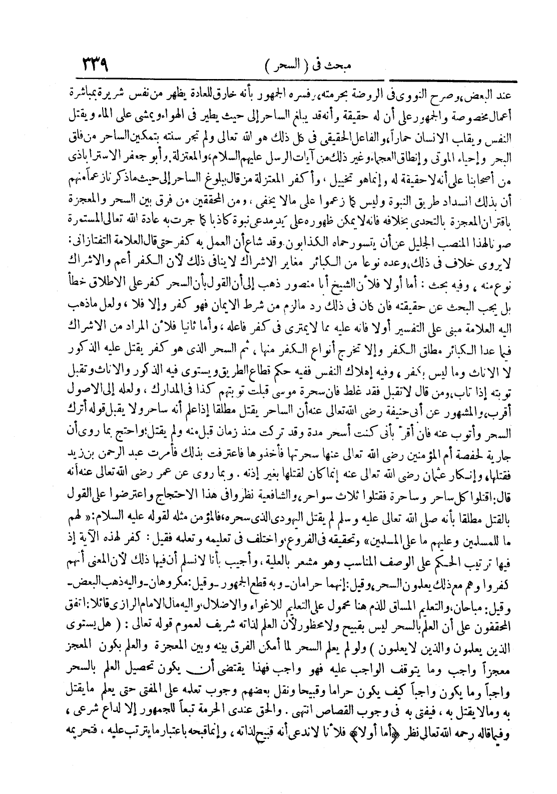 عند البعض وصرح النووي في الروضة بحرمته فسره الجمهور بأنه خارق العادة يظهر من نفس شريرة بمباشرة أعمال مخصوصة والجمهور على أن له حقيقة وأنه قد يبلغ الساحر إلى حيث يطير في الهواء ويمشي على الماء ويقتل النفس ويقلب الإنسان حمارا والفاعل الحقيقي في كل ذلك هو الله تعالى ولم تجر سنته بتمكين الساحر من فلق البحر وإحياء الموتى وإنطاق العجماء وغير ذلك من آيات الرسل عليهم السلام والمعتزلة وأبو جعفر الإستراباذي من أصحابنا على أنه لا حقيقة له وإنما هو تخييل وأكفر المعتزلة من قال ببلوغ الساحر إلى حيث ما ذكرنا زعما منهم أن بذلك إنسداد طريق النبوة وليس كما زعموا على ما لا يخفىومن المحققين من فرق بين السحر والمعجزة بإقتران المعجزة بالتحدي بخلافه فإنه لا يمكن ظهوره على يد مدعي نبوة كاذبا كما جرت به عادة الله تعالى المستمرة صونا لهذا المنصب الجليل عن أن يتسور حماه الكذابون وقد شاع أن العمل به كفر حتى قال العلامة التفتازاني : لا يروى خلاف في ذلك وعده نوعا من الكبائر مغاير الإشراك لا ينافي ذلك لأن الكفر أعم والإشراك نوع منهوفيه بحث : أما أولا فلأن الشيخ أبا منصور ذهب إلى أن القول بأن السحر كفر على الإطلاق خطأ بل يجب البحث عن حقيقته فإن كان في ذلك رد ما لزم من شرط الإيمان فهو كفر وإلا فلا ولعل ما ذهب إليه العلامة مبني على التفسير أولا فإنه عليه مما لايمتري في كفر فاعله وأما ثانيا فلأن المراد من الإشراك فيما عدا الكبائر مطلق الكفر وإلا تخرج أنواع الكفر منها ثم السحر الذي هو كفر يقتل عليه الذكور لا الإناث وما ليس بكفر وفيه إهلاك النفس ففيه حكم قطاع الطريق ويستوي فيه الذكور والإناث وتقبل توبته إذا تاب ومن قال لا تقبل فقد غلط فإن سحرة موسى قبلت توبتهم كذا في المدارك ولعله إلى الأصول أقرب والمشهور عن أبي حنيفة رضي الله تعالى عنه أن الساحر يقتل مطلقا إذا علم أنه ساحر ولا يقبل قوله أترك السحر وأتوب عنه فإن أقر بأني كنت أسحر مدة وقد تركت منذ زمان قبل منه ولم يقتل : وأحتج بما روى أن جارية لحفصة أم المؤمنين رضي الله تعالى عنها سحرتها فأخذوها فأعترفت بذلك فأمرت عبدالرحمن بن زيد فقتلها وإنكار عثمان رضي الله تعالى عنه إنما كان لقتلها بغير إذنه وبما روى عن عمر رضي الله تعالى عنه أنه قال : أقتلوا كل ساحر وساحرة فقتلوا ثلاث سواحر والشافعية نظروا في هذا الإحتجاج وأعترضوا على القول بالقتل مطلقا بأنه صلى الله تعالى عليه وسلم لم يقتل اليهودي الذي سحره فالمؤمن مثله لقوله عليه السلام : لهم ما للمسلمين وعليهم ما على المسلمين وتحقيقه في الفروع وأختلف في تعليمه وتعلمه فقيل : كفر لهذه الآية إذ فيها ترتيب الحكم على الوصف المناسب وهو مشعر بالعلية وأجيب بأنا لا نسلم أن فيها ذلك لأن المعنى أنهم كفروا وهم مع ذلك يعلمون السحر وقيل : إنهما حراما نوبه قطع الجمهور وقيل : مكروهان وإليه ذهب البعض وقيل : مباحان والتعليم المساق للذم هنا محمول على التعليم للإغواء والإضلال وإليه مال الإمام الرازي قائلا : أتفق المحققون على أن العلم بالسحر ليس بقبيح ولا محظور لأن العلم لذاته شريف لعموم قوله تعالى : هل يستوي الذين يعلمون والذين لا يعلمون ولو لم يعلم السحر لما أمكن الفرق بينه وبين المعجزة والعلم بكون المعجز معجزا واجب وما يتوقف الواجب عليه فهو واجب فهذا يقتضي أن يكون تحصيل العلم بالسحر واجبا وما يكون واجبا كيف يكون حراما وقبيحا ونقل بعضهم وجوب تعلمه على المفتي حتى يعلم ما يقتل به وما لايقتل به فيفتي به في وجوب القصاص إنتهى والحق عندي الحرمة تبعا للجمهور إلا لداع شرعي وفيما قاله رحمه الله تعالى نظر أما أولا فلأنا لا ندعي أنه قبيح لذاته وإنما قبحه بإعتبار ما يترتب عليه فتحريمه