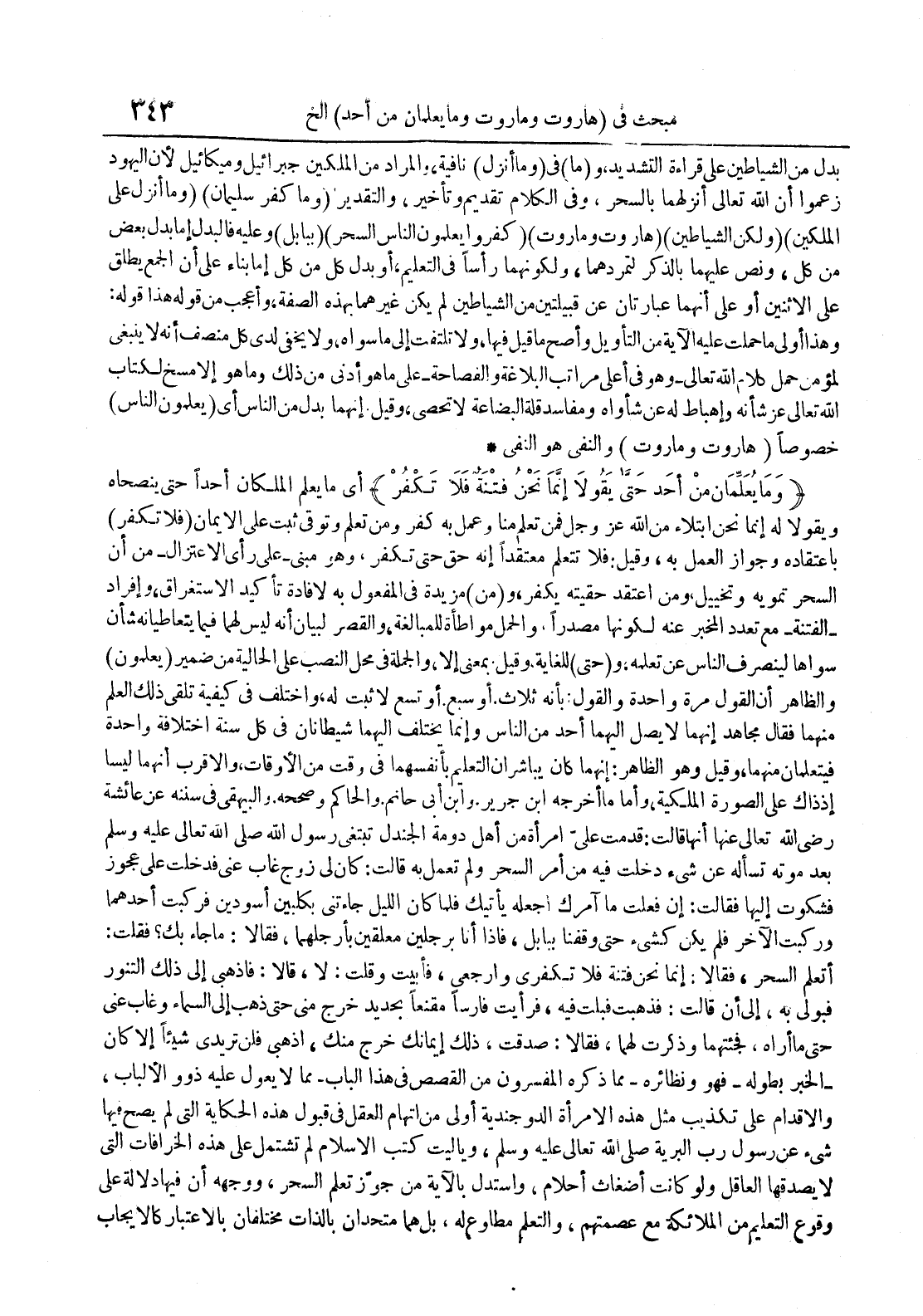 وما يعلمان منأحد حتى يقولا إنما نحن فتنة فلا تكفر أي ما يعلم الملكان أحدا حتى ينصحاه ويقولا له إنما نحن إبتلاء من الله عزوجل فمن تعلم منا وعمل به كفر ومن تعلم وتوقى ثبت على الإيمان فلا تكفر بإعتقاده وجواز العمل به وقيل : فلا تتعلم معتقدا إنه حق حتى تكفر وهو مبنيعلى رأي الإعتزالمن أن السحر تمويه وتخييل ومنأعتقد حقيته يكفر و من مزيدة في المفعول به لإفادة تأكيد الإستغراق وإفرادالفتنةمع تعدد المخبر عنه لكونها مصدرا والحمل مواطأة للمبالغة والقصر لبيان أنه ليس لهما فيما يتعاطيانه شأن سواها لينصرف الناس عن تعلمه و حتى للغاية وقيل : بمعنى إلا والجملة في محل النصب على الحالية من ضمير يعلمون والظاهر أن القول مرة واحدة والقول : بأنه ثلاث أو سبع أو تسع لأثبت له وأختلف في كيفية تلقي ذلك العلم منهما فقال مجاهد إنهما لا يصل إليهما أحد من الناس وإنما يختلف إليهما شيطانان في كل سنة إختلافة واحدة فيتعلمان منهما وقيل وهو الظاهر : إنهما كان يباشران التعليم بأنفسهما في وقت من الأوقات والأقرب أنهما ليسا إذ ذاك على الصورة الملكية وأما ماأخرجه إبن جرير وإبن أبي حاتم والحاكم وصححه والبيهقي في سننه عن عائشة رضي الله تعالى عنها أنها قالت : قدمت علي أمرأة من أهل دومة الجندل تبتغي رسول الله صلى الله تعالى عليه وسلم بعد موته تسأله عن شيء دخلت فيه من أمر السحر ولم تعمل به قالت : كان لي زوج غاب عني فدخلت على عجوز فشكوت إليها فقالت : إن فعلت ما آمرك أجعله يأتيك فلما كان الليل جاءتني بكلبين أسودين فركبت أحدهما وركبت الآخر فلم يكن كشيء حتى وقفنا ببابل فإذا أنا برجلين معلقين بأرجلهما فقالا : ما جاء بك فقلت : أتعلم السحر فقالا : إنما نحن فتنة فلا تكفري وأرجعي فأبيت وقلت : لا قالا : فأذهبي إلى ذلك التنور فبولي به إلى أن قالت : فذهبت فبلت فيه فرأيت فارسا مقنعا بحديد خرج مني حتى ذهب إلى السماء وغاب عني حتى ما أراه فجئتهما ودكرت لهما فقالا : صدقتذلك إيمانك خرج منك أذهبي فلن تريدي شيئا إلا كان الخبر بطولهفهو ونظائرهمما ذكره المفسرون من القصص في هذا البابمما لايعول عليه ذوو الألباب والإقدام على تكذيب مثل هذه الأمرأة الدوجندية أولى من إتهام العقل في قبول هذه الحكاية التي لم يصح فيها شيء عن رسول رب البرية صلى الله تعالى عليه وسلم وياليت كتب الإسلام لم تشتمل على هذه الخرافات التي لا يصدقها العاقل ولو كانت أضغاث أحلام وأستدل بالآية من جوز تعلم السحر ووجهه أن فيها دلالة على وقوع التعليم من الملائكة مع عصمتهم والتعلم مطاوع له بل هما متحدان بالذات مختلفان بالإعتبار كالإيجاب