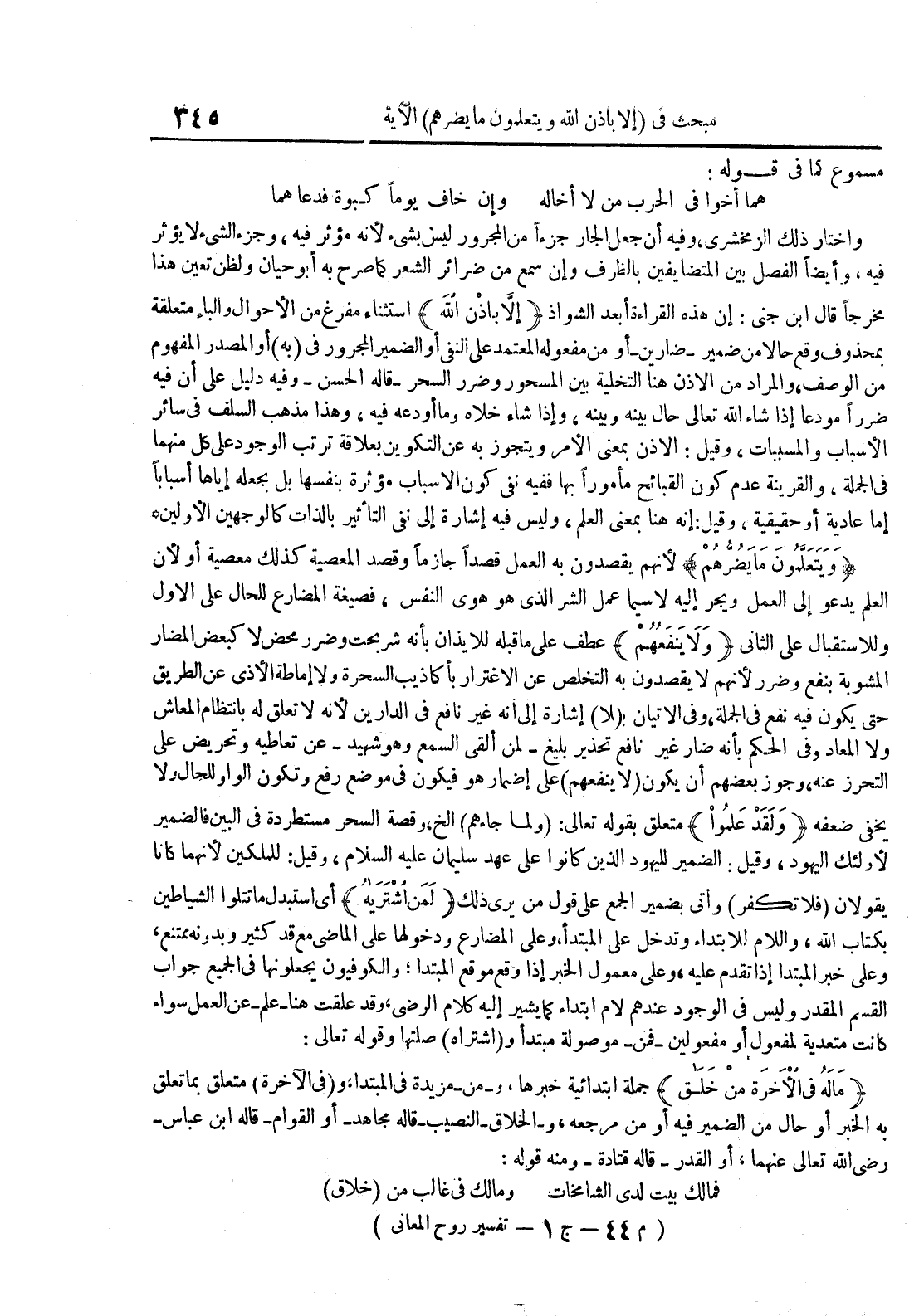 مسموع كما في قوله : هما أخوا في الحرب من لا أخاله وإن خاف يوما كبوة فدعا هما وأختار ذلك الزمخشري وفيه أن جعل الجار جزءا من المجرور ليس بشيء لأنه مؤثر فيه وجزء الشيء لا يؤثر فيه وأيضا الفصل بين المتضايفين بالظرف وإن سمع من ضرائر الشعر كما صرح به أبو حيان ولظن تعين هذا مخرجا قال إبن جني : إن هذه القراءة أبعد الشواذ إلا بإذن الله إستثناء مفرغ من الأحوال والباء متعلقة بمحذوف وقع حالا من ضميرضارينأؤ من مفعوله المعتمد على النفي أو الضمير المحذوف في به أو المصدر المفهوم من الوصف والمراد من الأذن هنا التخلية بين المسحور وضرر السحرقاله الحسنوفيه دليل على أن فيه ضررا مودعا إذا شاء الله تعالى حال بينه وبينه وإذا شاء خلاه وما أودعه فيه وهذا مذهب السلف في سائر الأسباب والمسببات وقيل : الأذن بمعنى الأمر ويتجوز به عن التكوين بعلاقة ترتب الوجود على كل منهما في الجملة والقرينة عدم كون القبائح مأمورا بها ففيه نفي كون الأسباب مؤثرة بنفسها بل بجعله إياها أسبابا إما عادية أو حقيقية وقيل : إنه هنا بمعنى العلم وليس فيه إشارة إلى نفي التأثير بالذات كالوجهين الأولين