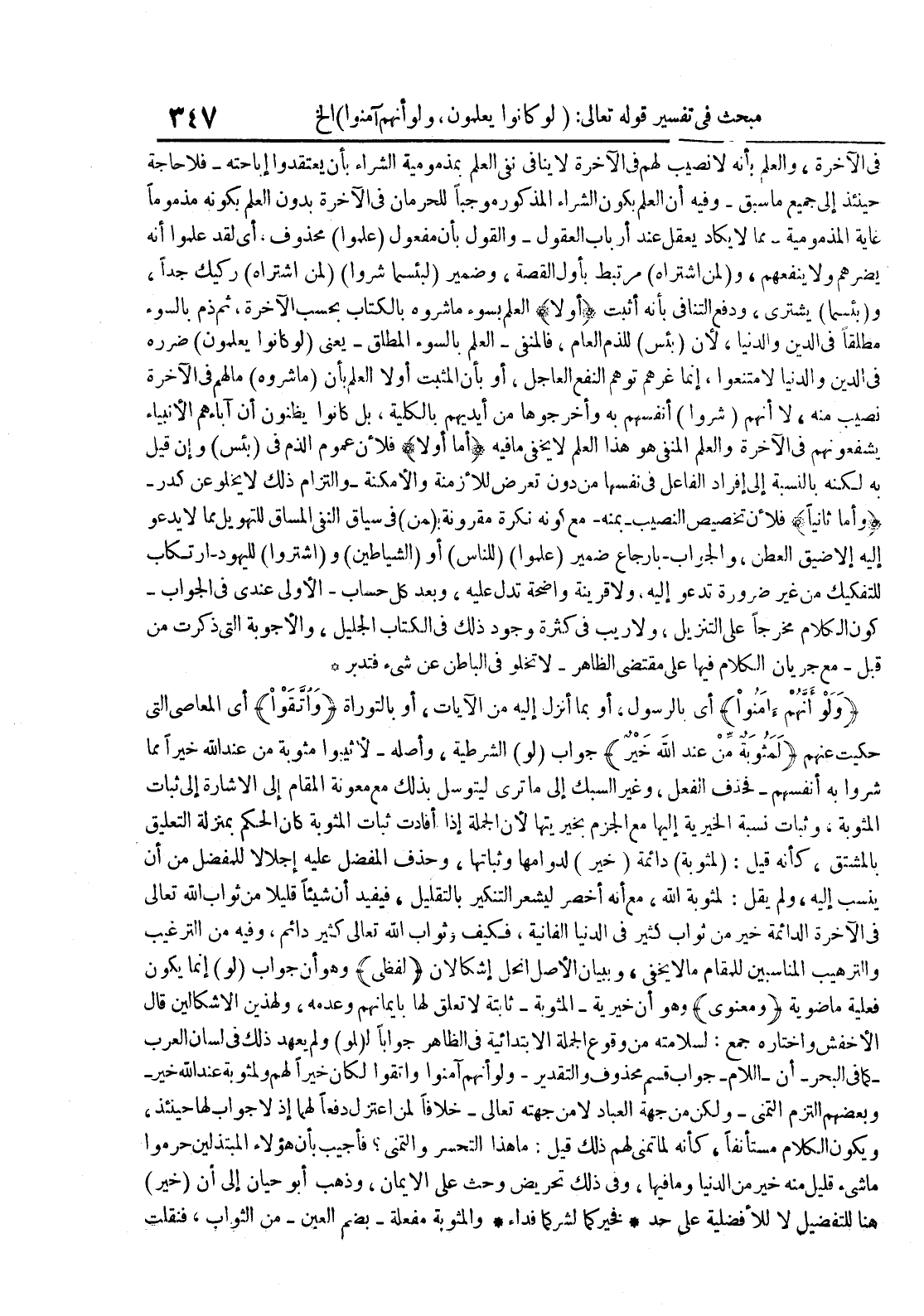 في الآخرة والعلم بأنه لا نصيب لهم في الآخرة لا ينافي نفي العلم بمذمومية الشراء بأن يعتقدوا إباحتهفلا حاجة حينئذ إلى جميع ما سبقوفيه أن العلم بكون الشراء المذكور موجبا للحرمان في الآخرة بدون العلم بكونه مذموما غاية المذموميةمما لا يكاد يعقل عند أرباب العقول والقول بأن مفعول علموا محدوف أي لقد علموا أنه يضرهم ولا ينفعهم و لمن أشتراه مرتبط بأول القصة وضمير لبئسما شروا لمن أشتراه ركيك جدا و بئسما يشتري ودفع التنافي بأنه أثبت أولا العلم بسوء ما شروه بالكتاب بحسب الآخرة ثم ذم بالسوء مطلقا في الدين والدنيا لأن بئس للذم العام فالمنفي العلم بالسوء المطلقيعني لو كانوا يعلمون ضرره في الدين والدنيا لأمتنعوا إنما غرهم توهم النفع العاجل أو بأن المثبت أولا العلم بأن ما شروه ما لهم في الآخرة نصيب منه لا أنهم شروا أنفسهم به وأخرجوها من أيديهم بالكلية بل كانوا يظنون أن آباءهم الأنبياء يشفعونهم في الآخرة والعلم المنفي هو هذا العلم لا يخفى ما فيه أما أولا فلأن عموم الذم في بئس وإن قيل به لكنه بالنسبة إلى إفراد الفاعل في نفسها من دون تعرض للأزمنة والأمكنةوإلتزام ذلك لا يخلو عن كدروأما ثانيا فلأن تخصيص النصيب بمنه مع كونه نكرة مقرونة ب من في سياق النفي المساق للتهويل مما لا يدعو إليه إلا ضيق العطن والجواببإرجاع ضمير علموا للناس أؤ الشياطين و أشتروا لليهود إرتكاب للتفكيك من غير ضرورة تدعو إليه ولا قرينة واضحة تدل عليه وبعد كل حسابالأولى عندي في الجواب كون الكلام مخرجا على التنزيل ولا ريب في كثرة وجود ذلك في الكتاب الجليل والأجوبة التي ذكرت من قبلمع جريان الكلام فيها على مقتضى الظاهرلا تخلو في الباطن عن شيء فتدبر