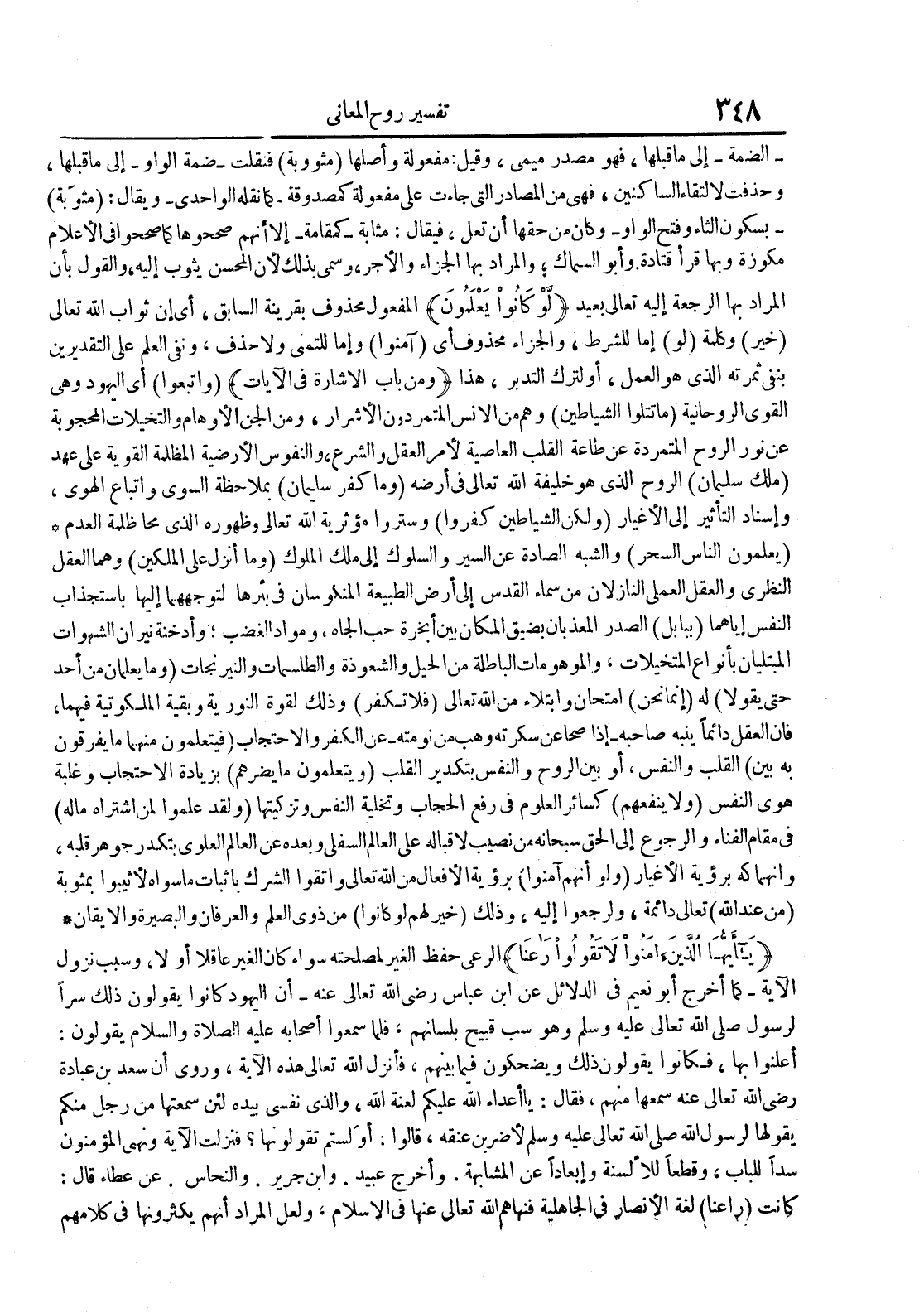 الضمةإلى ما قبلها فهو مصدر ميمي وقيل : مفعولة وأصلها مثووية فنقلتضمة الواوإلى ما قبلها وحذفت لإلتقاء الساكنين فهي من المصادر التي جاءت على مفعولة كمصدوقةكما نقله الواحديويقال : مثوبة بسكون الثاء وفتح الواووكان من حقها أن تعل فيقال : مثابةكمقامةإلا أنهم صححوها كما صححوا في الأعلام مكوزة وبها قرأ قتادة وأبو السماك والمراد بها الجزاء والأجر وسمى بذلك لأن المحسن يثوب إليه والقول بأن المراد بها الرجعة إليه تعالى بعيد لو كانوا يعلمون المفعول محذوف بقرينة السابق أي إن ثواب الله تعالى خير وكلمة لو إما للشرط والجزاء محذوفا أي آمنوا وإما للتمني ولا حذف ونفي العلم على التقديرين بنفي ثمرته الذي هو العمل أؤ لترك التدبر هذا ومن باب الإشارة في الآيات وأتبعوا أي اليهود وهي القوى الروحانية ما تتلوا الشياطين وهم من الإنس المتمردون الأشرار ومن الجن الأوهام والتخيلات المحجوبة عن نور الروح المتمردة عن طاعة القلب العاصية لأمر العقل والشرع والنفوس الارضية المظلمة القوية على عهد ملك سليمان الروح الذي هو خليفة الله تعالى في أرضه وما كفر سليمان بملاحظة السوى وإتباع الهوى وإسناد التأثير إلى الأغيار ولكن الشياطين كفروا وستروا مؤثرية الله تعالى وظهوره الذي محا ظلمة العدم