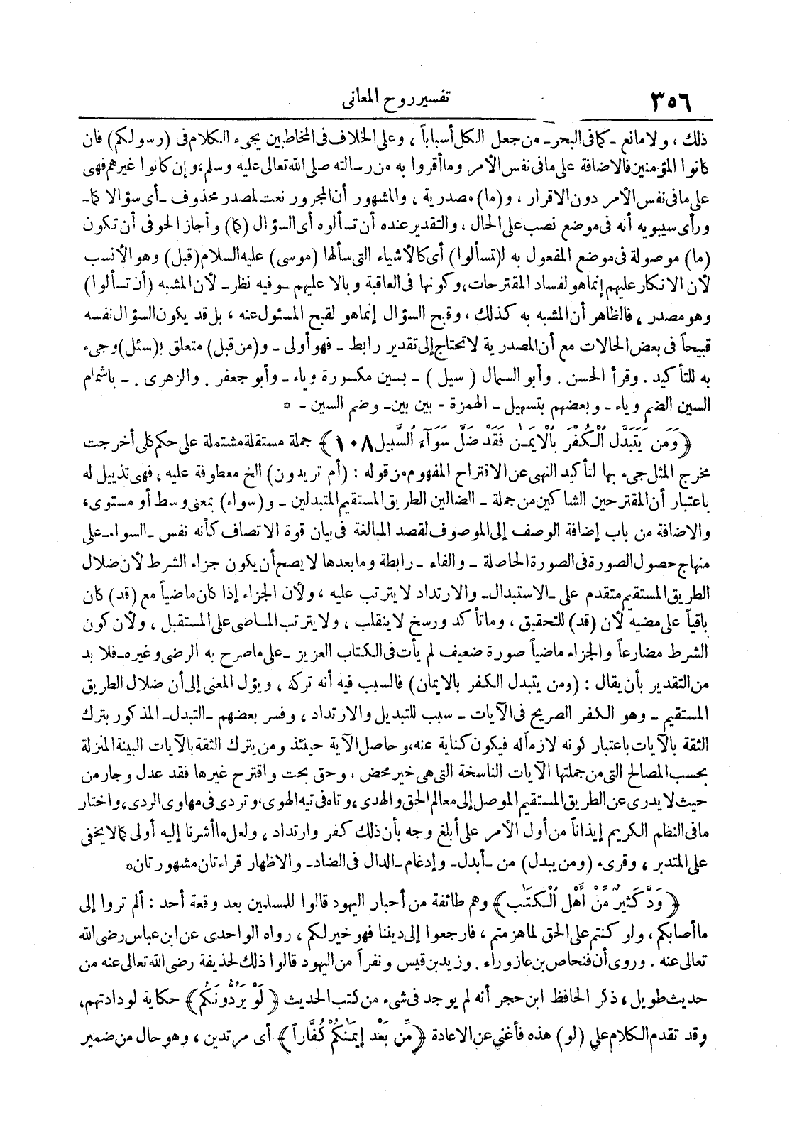 ومن يتبدل الكفر بالإيمان فقد ضل سواء السبيل 801 جملة مستقلة مشتملة على حكم كلي أخرجت مخرج المثل جيء بها لتأكيد النهي عن الإقتراح المفهوم من قوله : أم تريدون إلخ معطوفة عليه فهي تذييل له بإعتبار أن المقترحين الشاكين من جملة الضالين الطريق المستقيم المتبدلين و سواء بمعنى وسط أو مستوى والإضافة من باب إضافة الوصف إلى الموصوف لقصد المبالغة في بيان قوة الإتصاف كأنه نفس السواء على منهاج حصول الصورة في الصورة الحاصلةوالفاء رابطة وما بعدها لا يصح أن يكون جزاء الشرط لأن ضلال الطريق المستقيم متقدم علىالإستبدالوالإرتداد لا يترتب عليه ولأن الجزاء إذا كان ماضيا مع قد كان باقيا على مضيه لأن قد للتحقيق وما تأكد ورسخ لا ينقلب ولا يترتب الماضي على المستقبل ولأن كون الشرط مضارعا والجزاء ماضيا صورة ضعيف لم يأت في الكتاب العزيزعلى ما صرح به الرضى وغيرهفلا بد من التقدير بأن يقال : ومن يتبدل الكفر بالإيمان فالسبب فيه أنه تركه ويؤل المعنى إلى أن ضلال الطريق المستقيموهوالكفر الصريح في الآيات سبب للتبديل والإرتداد وفسر بعضهم التبدل المذكور بترك الثقة بالآيات بإعتبار كونه لازما له فيكون كناية عنه وحاصل الآية حينئذ ومن يترك الثقة بالآيات البينة المنزلة بحسب المصالح التي من جملتها الآيات الناسخة التي هي خير محض وحق بحت وأقترح غيرها فقد عدل وجار من حيث لا يدري عن الطريق المستقيم الموصل إلى معالم الحق والهدى وتاه في تيه الهوى وتردى في مهاوي الردى وأختار ما في النظم الكريم إيذانا من أول الأمر على أبلغ وجه بأن ذلك كفر وإرتدادولعل ما أشرنا إليه أولى كما لايخفى على المتدبر وقريء ومن يتبدل منأبدلوإدغامالدال في الضاد والإظهار قراءتان مشهورتان