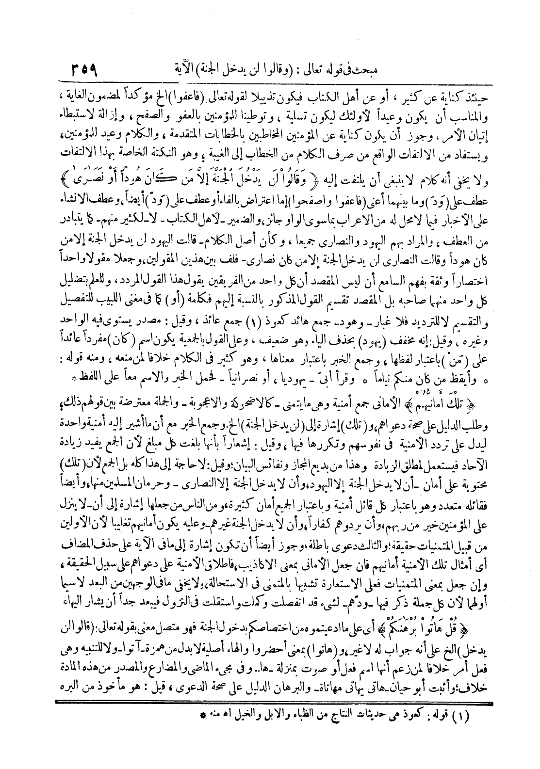 حينئذ كناية عن كثير أو عن أهل الكتاب فيكون تذييلا لقوله تعالى فأعفوا إلخ مؤكدا لمضمون الغاية والمناسب أن يكون وعيدا لأولئك ليكون تسلية وتوطينا للمؤمنين بالعفو والصفح وإزالة لإستبطاء إتيان الأمر وجوز أن يكون كناية عن المؤمنين المخاطبين بالخطابات المتقدمة والكلام وعيد للمؤمنين ويستفاد من الإلتفات الواقع من صرف من الخطاب إلى الغيبة وهو النكتة الخاصة بهذا الإلتفات ولايخفى أنه كلام لا ينبغي أن يلتفت إليه وقالوا لن يدخل الجنة إلا من كان هودا أو نصارى عطف على ود وما بينهما أنى فأعفوا وأصفحوا إما إعتراض بالفاء أو عطف على ود أيضا وعطف الإنشاء على الأخبار فيما لا محل له من الإعراب بما سوى الواو جائز والضميرلأهل الكتاب لا لكثيرمنهم كما يتبادر من العطف والمراد بهم اليهود والنصارى جميعا وكأن أصل الكلام قالت اليهود لن يدخل الجنة إلا من كان هودا وقالت النصارى لن يدخل الجنة إلا من كان نصارىفلف بين هذين المقولين وجعلا مقولا واحدا إختصارا وثقة يفهم السامع أن ليس المقصد أن كل واحد من الفريقين يقول هذا القول المردد وللعلم بتضليل كل واحد منهما صاحبه بل المقصد تقسيم القول المذكور بالنسبة إليهم فكلمة أو كما في معنى اللبيب للتفصيل والتقسيم لا للترديد فلا غباروهودجمع هائد كعوذ جمع عائذ وقيل : مصدر يستوي فيه الواحد وغيره وقيل : إنه مخفف يهود بحذف الياء وهو ضعيف وعلى القول بالجمعية يكون أسم كان مفردا عائدا على من بإعتبار لفظها وجمع الخبر بإعتبار معناها وهو كثير في الكلام خلافا لمن منعه ومنه قوله : وأيقظ من كان منكم نياما
