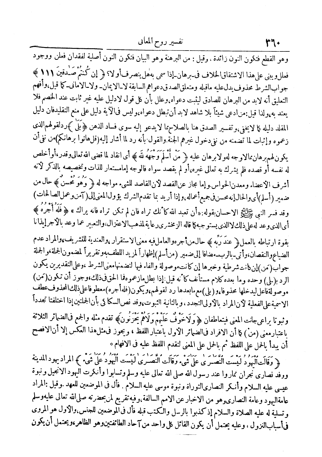 وهو القطع فتكون النون زائدة وقيل : من البرهنة وهو البيان فتكون النون أصلية لفقدان فعلن ووجود فعلل ويبني على هذا الإشتقاق الخلاف فيبرهان إذا سمى به هل ينصرف أو لا إن كنتم صادقين 111 جواب الشرط محذوف يدل عليه ما قبله ومتعلق الصدق دعواهم السابقة لاالإيمان ولا الأمانيكم قيل وأفهم التعليق أنه لا بد من البرهان للصادق ليثبت دعواه وعلل بأن كل قول لا دليل عليه غير ثابت عند الخصم فلا يعتد به ولذا قيل : من أدعى شيئا بلا شاهد لا بد أن تبطل دعواه وليس في الآية دليل على منع التقليد فإن دليل المقلد دليله كما لايخفىوتفسير الصادق هنا بلصلاح مما لا يدعو إليه سوى فساد الذهن بلى رد لقولهم الذي زعموه وإثبات لما تضمنه من نفي دخول غيرهم الجنة والقول بأنه رد لما أشار إليه قل هاتوا برهانكم من نفي أن يكون لهم برهان مما لا وجه له ولا برهان عليه من أسلم وجهه لله أي إنقاد لما قضى الله تعالى وقدر او أخلص له نفسه أو قصده فلم يشرك به تعالى غيره أو لم يقصد سواه فالوجه إما مستعار للذات وتخصيصه بالذكر لأنه أشرف الأعضاء ومعدن الحواس وإما مجاز عن القصد لأن القاصد للشيء مواجه له وهو محسن حال من ضمير أسلم أي والحال إنه محسن في جميع أعماله وإذا أريد بما تقدم الشرك يؤول المعنى إلى آمن وعمل الصالحات وقد فسر النبي الإحسان بقوله : أن تعبد الله كأنك تراه فإن لم تكن تراه فإنه يراك فله أجره أي الذي وعد له على ذلك لا الذي يستوجبه كما قاله الزمخشري رعاية لمدهب الإعتزال والتعبير عما وعد بالأجر إيذانا بقوة إرتباطه بالعمل عند ربه حال منأجره والعامل فيه معنى الإستقرار والعندية للتشريف والمراد عدم الضياع والنقصان وأتىبالربمضافا إلى ضمير من أسلم إظهارا لمزيد اللطف به وتقريرا لمضمون الجملة والجملة جواب من إن كانت شرطية وخبرها إن كانت موصولة والفاء فيها لتضمنها معنى الشرط وعلى التقديرين يكون الرد ب على وحده وما بعده كلام مستأنف كأنه قيل إذا بطل ما زموه فما الحق في ذلك وجوز أن تكون من موصولة فاعل ليدخلها محذوفا و بلى مع ما بعدها رد لقولهم ويكون فله أجره معطوفا على ذلك المحذوف عطف الأسمية على الفعلية لأن المراد بالأولى التجدد وبالثانية الثبوت وقد نص السكاكي بأن الجملتين إذا أختلفتا تجددا وثبوتا يراعى جانت المعنى فيتعاطفان ولا خوف عليهم ولا هم يحزنون تقدم مثله والجمع في الضمائر الثلاثة بإعتبار معنى من كما أن الإفراد في الضمائر الأول بإعتبار اللفظ ويجوز في مثل هذا العكس إلا أن الأفصح أن يبدأ بالحمل على اللفظ ثم بالحمل على المنى لتقدم اللفظ عليه في الإفهام