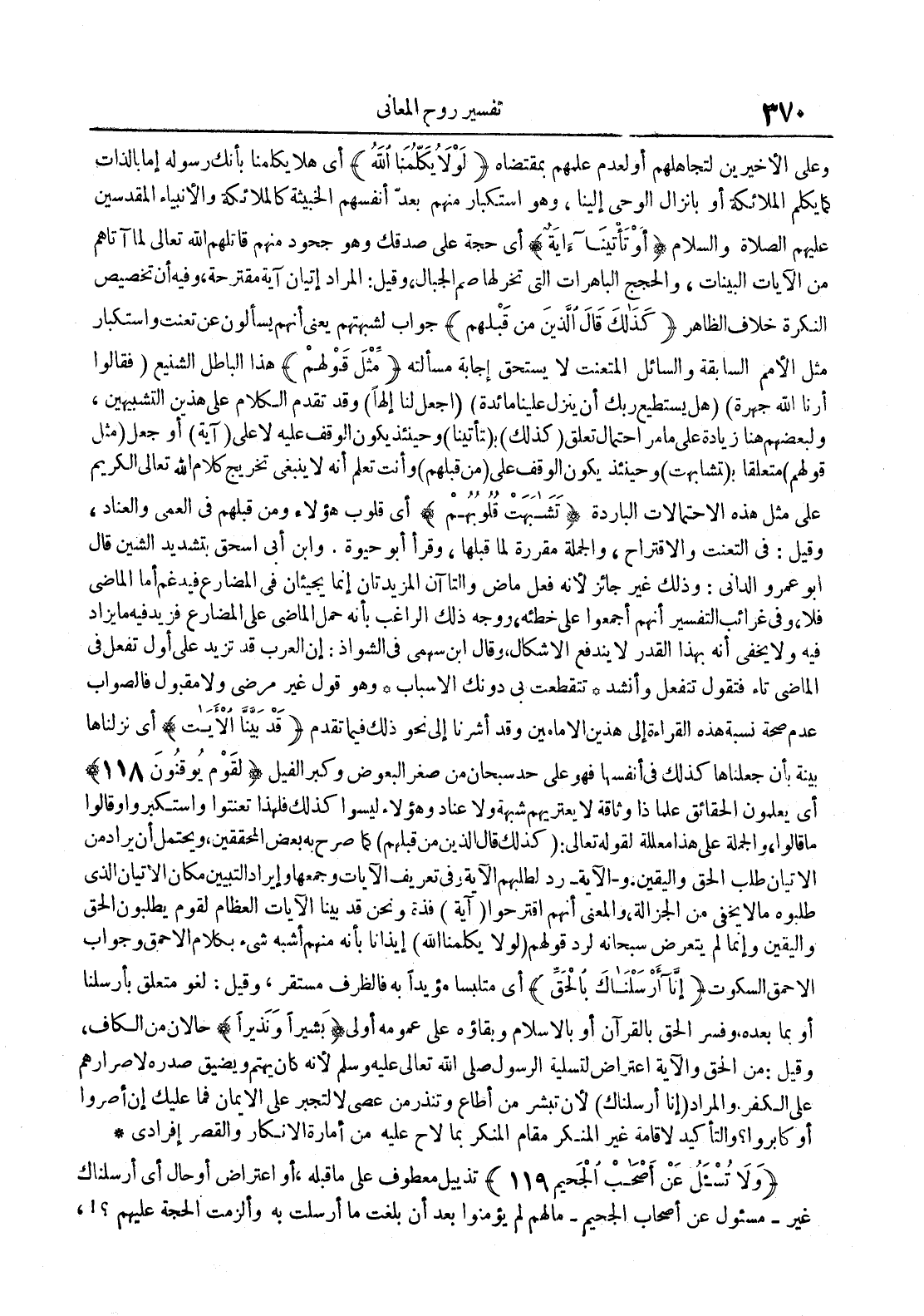 وعلى الأخيرين لتجاهلهم أو لعدم علمهم بمقتضاه لولا يكلمنا الله أي هلا يكلمنا بأنك رسوله إما بالذات كما يكلم الملائكة أو بإنزال الوحي إلينا وهو إستكبار منهم بعد أنفسهم الخبيثة كالملائكة والأنبياء المقدسين عليهم الصلاة والسلام أو تأتينا أية أي حجة على صدقك وهو جحود منهم قاتلهم الله تعالى لما آتاهم من الآيات البينات والحجج الباهرات التي تخر لها صم الجبال وقيل : المراد إتيان آية مقترحة وفيه أن تخصيص النكرة خلاف الظاهر كذلك قال الذين من قبلهم جواب لشبهتهم يعني أنهم يسألون عن تعنت وإستكبار مثل الأمم السابقة والسائل المتعنت لا يستحق إجابة مسألته مثل قولهم هذا الباطل الشنيع فقالوا أرنا الله جهرة هل يستطيع ربك أن ينزل علينا مائدة أجعل لنا إلها وقد تقدم الكلام على هذين التشبيهين ولبعضهم هنا زيادة على ما مر إحتمال تعلق كذلك ب تأتينا وحينئذ يكون الوقف عليه لا على آية أو جعل مثل قولهم متعلقا ب تشابهت وحينئذ يكون الوقف على من قبلهم وأنت تعلم أنه لاينبغي تخريج كلام الله تعالى الكريم على مثل هذه الإحتمالات الباردة تشابهت قلوبهم أي قلوب هؤلاء ومن قبلهم في العمى والعناد وقيل : في التعنت والإقتراح والجملة مقررة لما قبلها وقرأ أبو حيوة وإبن أبي إسحاق تشديد الشين قال أبو عمرو الداني : وذلك غير جائز لأنه ماض والتآن المزيدتان إنما يجيئان في المضارع فيدغم أما الماضي فلا وفي غرائب التفسير أنهم أجمعوا على خطئه ووجه ذلك الراغب بانه حمل الماضي على المضارع فزيد فيه ما يزاد فيه ولا يخفى أنه بهذا القدر لا يندفع الإشكال وقال إبن سهمي في الشواذ : إن العرب قد تزيد على أول تفعل في الماضي تاء فتقول تنفعل وأنشد تتقطعت بي دونك الأسباب وهو قول غير مرضي ولا مقبول فالصواب عدم صحة نسبة هذه القراءة إلى هذين الإمامين وقد أشرنا إلى نحو ذلك فيما تقدم قد بينا الآيات أي نزلناها بينة بأن جعلناها كذلك في أنفسها فهو على حد سبحان من صغر البعوض وكبر الفيل لقوم يوقنون 811 أي يعلمون الحقائق علما ذا وثاقه لا يعتريهم شبهة ولا عناد وهؤلاء ليسوا كذلك فلهذا تعنتوا وأستكبروا وقالوا ما قالوا والجملة على هذا معللة لقوله تعالى : كذلك قال الذين من قبلهم كما صرح به بعض المحققين ويحتمل أن يراد من الإتيان طلب الحق واليقين والآيةرد لطلبهم الآية وفي تعريف الآيات وجمعها وإيراد التبيين مكان الإتيان الذي طلبوه ما لايخفى من الجزالة والمعنى أنهم أقترحوا آية فذة ونحن قد بينا الآيات العظام لقوم يطلبون الحق واليقين وإنما لم يتعرض سبحانه لرد قولهم لولا يكلمنا الله إيذانا بأنه منهم أشبه شيء بكلام الأحمق وجواب الأحمق السكوت إنا أرسلناك بالحق أي متلبسا مؤيدا به فالظرف مستقر وقيل : لغو متعلق بأرسلنا أو بما بعده وفسر الحق بالقرآن أو بالإسلام وبقاؤه على عمومه أولى بشيرا ونذيرا حالان من الكاف وقيل : من الحق والآية إعتراض لتسلية الرسول صلى الله تعالى عليه وسلم لأنه كان يهتم ويضيق صدره لإصرارهم على الكفر والمراد إنا أرسلناك لأن تبشر من أطاع وتنذر من عصى لا لتجبر على الإيمان فما عليك إن أصروا أو كابروا والتأكيد لإقامة غير المنكر مقام المنكر بما لاح عليه من أمارة الإنكار والقصر إفرادى