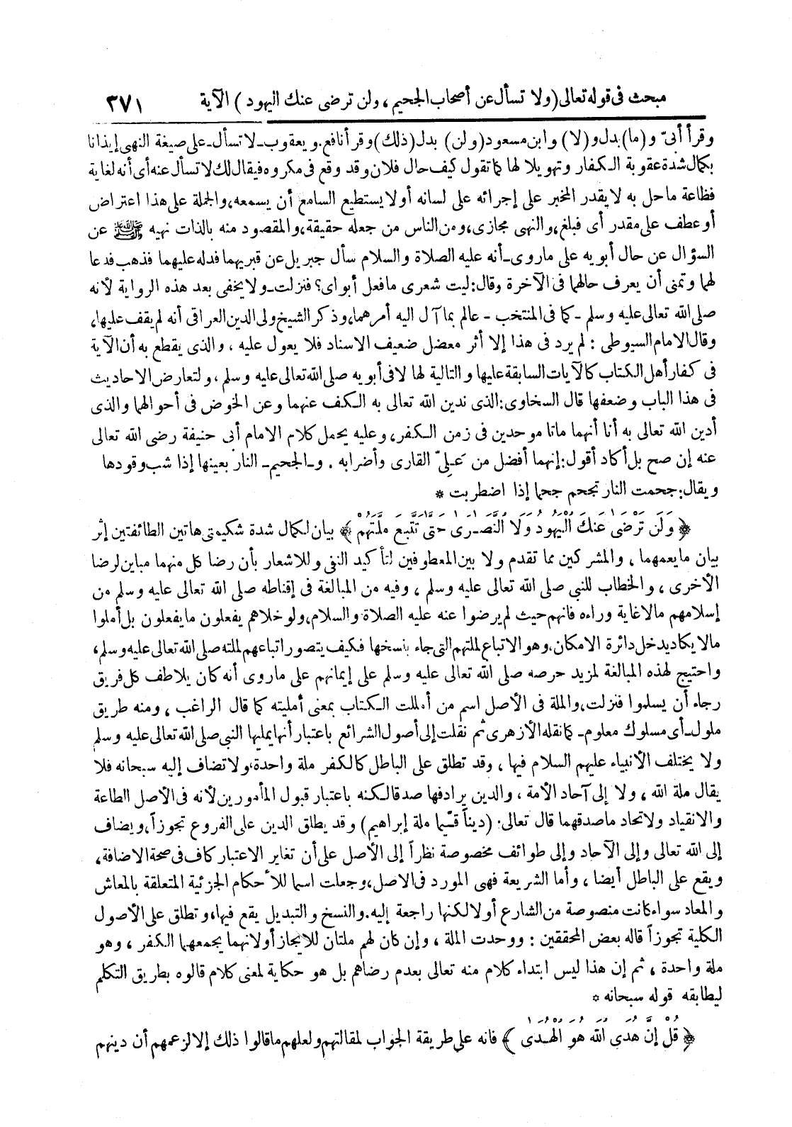 ولن ترضى عنك اليهود ولا النصارى حتى تتبع ملتهم بيان لكمال شدة شكيمتي هاتين الطائفتين إثر بيان ما يعمهما والمشركين مما تقدم ولا بين المعطوفين لتأكيد النفي وللأشعار بأن رضا كل منهما مباين لرضا الأخرى والخطاب للنبي صلى الله تعالى عليه وسلم وفيه من المبالغة في إقناطه صلى الله تعالى عليه وسلم من إسلامهم ما لا غاية وراءه فإنهم حيث لم يرضوا عنه عليه الصلاة و السلام ولو خلاهم يفعلون ما يفعلون بل أملوا ما لا يكاد يدخل دائرة الإمكان وهو الإتباع لملتهم التي جاء بنسخها فكيف يتصور إتباعهم لملته صلى الله تعالى عليه وسلم وأحتيج لهذه المبالغة لمزيد حرصه صلى الله تعالى عليه وسلم على إيمانهم على ما روى أنه كان يلاطف كل فريق رجاء أن يسلموا فنزلت والملة في الأصل أسم من أمللت الكتاب بمعنى أمليته كما قال الراغب ومنه طريق ملولأي مسلوك معلومكما نقله الأزهري ثم نقلت إلى أصول الشرائع بإعتبار أنها يمليها النبي صلى الله تعالى عليه وسلم ولا يختلف الأنبياء عليهم السلام فيها وقد تطلق على الباطل كالفكر ملة واحدة ولا تضاف إليه سبحانه فلا يقال ملة الله ولا إلى آحاد الأمة والدين يرادفها صدقا لكنه بإعتبار قبول المأمورين لأنه في الأصل الطاعة والإنقياد ولإتحاد ما صدقهما قال تعالى دينا قيما ملة إبراهيم وقد يطلق الدين على الفروع تجوزا ويضاف إلى الله تعالى وإلى الآحاد وإلى طوائف مخصوصة نظرا إلى الأصل على أن تغاير الإعتبار كاف في صحة الإضافة ويقع على الباطل أيضا وأما الشريعة فهي المورد في الأصل وجعلت أسما للأحكام الجزئية المتعلقة بالمعاش والمعاد سواء كانت منصوصة من الشارع أو لا لكنها راجعة إليه والنسخ والتبديل يقع فيها وتطلق على الأصول الكلية تجوزا قاله بعض المحققين : ووحدت الملة وإن كان لهم ملتان للإيجاز أو لأنهما يجمعهما الكفر وهو ملة واحدة ثم إن هذا ليس إبتداء كلام منه تعالى بعدم رضاهم بل هو حكاية لمعنى كلام قالوه بطريق التكلم ليطابقه قوله سبحانه