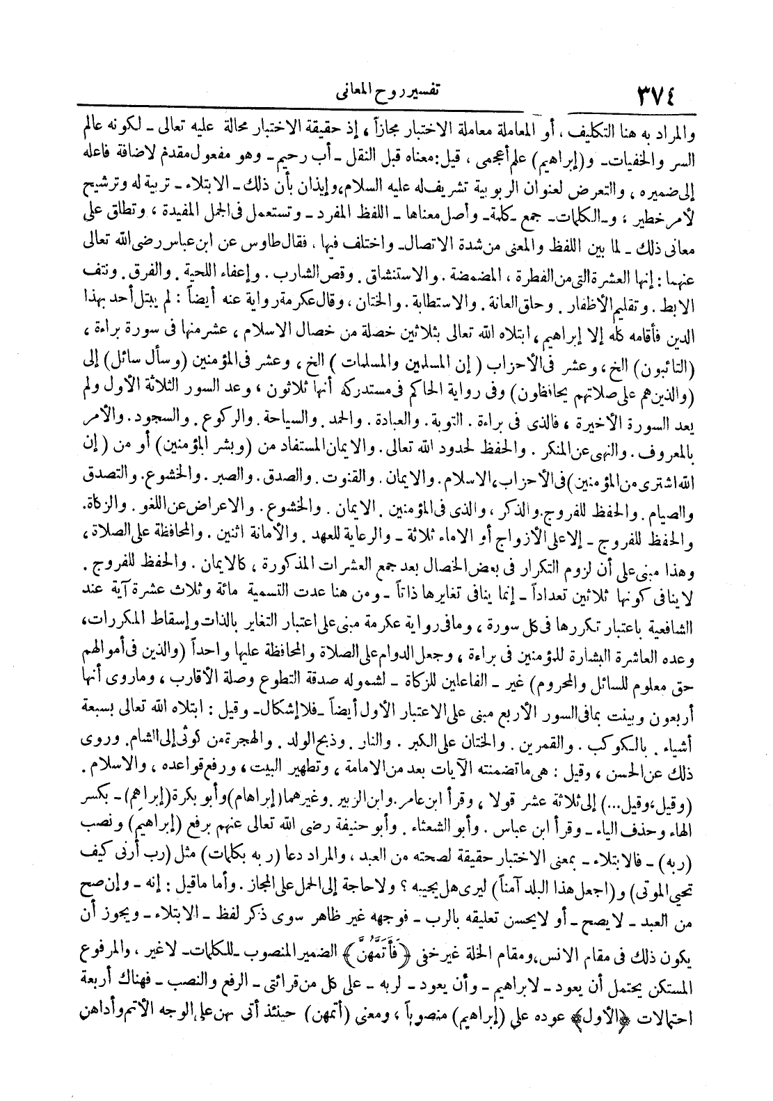 والمراد به هنا التكليف أو المعاملة معاملة الإختبار مجازا إذ حقيقة الختبار محالة عليه تعالى لكونه عالم السر والخفيات و إبراهيم علم أعجمي قيل : معناه قبل النقل أب رحيموهو مفعول مقدم لإضافة فاعله إلى ضميره والتعرض لعنوان الربوبية تشريف له عليه السلام وإيذان بأن ذلك البتلاء تربية له وترشيح لأمر خطير والكلمات جمع كلمةوأصل معناها اللفظ المفرد وتستعمل في الجمل المفيدة وتطلق على معاني ذلك لما بين اللفظ والمعنى من شدة الإتصال وأختلف فيها فقال طاوس عن إبن عباس رضي الله تعالى عنهما : إنها العشرة التي من الفطرة المضمضة والإستنشاق وقص الشارب وإعفاء اللحية والفرق ونتف الأبط وتقليم الأظفار وحلق العانة والإستطابة والختان وقال عكرمة رواية عنه أيضا : لم يبتل أحد بهذا الدين فأقامه كله إلا إبراهيم إبتلاه الله تعالى بثلاثين خصلة من خصال الإسلام عشر منها في سورة براءة التائبون إلخ وعشر في الأحزاب إن المسلمين والمسلمات إلخ وعشر في المؤمنين وسأل سائل إلى والذين هم على صلاتهم يحافظون وفي رواية الحاكم في مستدركه أنها ثلاثون وعد السور الثلاثة الأول ولم يعد السورة الأخيرة فالذي في براءة التوبة والعبادة والحمد والسياحة والركوع والسجود والأمر بالمعروف والنهي عن المنكر والحفظ لحدود الله تعالى والإيمان المستفاد من وبشر المؤمنين أو من إن الله أشترى من المؤمنين في الأحزاب الإسلام والإيمان والقنوت والصدق والصبر والخشوع والتصدق والصيام والحفظ للفروج والذكر والذي في المؤمنين الإيمان والخشوع والإعراض عن اللغو والزكاة والحفظ للفروج إلا على الأزواج أو الإماء ثلاثةوالرعاية للعهد والأمانة أثنين والمحافظة على الصلاة وهذا مبني على أن لزوم التكرار في بعض الخصال بعد جمع العشرات المذكورة كالإيمان والحفظ للفروج لا ينافي كونها ثلاثين تعدادا إنما ينافي تغايرها ذاتا ومن هنا عدت التسمية مائة وثلاث عشرة آية عند الشافعية بإعتبار تكررها في كل سورة وما في رواية عكرمة مبني على إعتبار التغاير بالذات وإسقاط المكررات وعده العاشرة البشارة للمؤمنين في براءة وجعل الدوام على الصلاة والمحافظة عليها واحدا والذين في أموالهم حق معلوم للسائل والمحروم غير الفاعلين للركاة لشموله صدقة التطوع وصلة الأقارب وما روى أنها أربعون وبينت بما في السور الأربع مبني على الإعتبار الأول أيضافلا إشكال وقيل : إبتلاه الله تعالى أشياء بالكواكب والقمرين والختان على الكبر والنار وذبح الولد والهجرة من كوثي إلى الشام وروى ذلك عن الحسن وقيل : هي ما تضمنته الآيات بعد من الأمامة وتطهير البيت ورفع قواعده والإسلام وقيل وقيل إلى ثلاثة عشر قولا وقرأ إبن عامر وإبن الزبير وغيرهما إبراهام وأبو بكرة إبراهم بكسر الهاء وحذف الياء وقرأ إبن عباس وأبو الشعثاء وأبو حنيفة رضي الله تعالى عنهم برفع إبراهيم ونصب ربه فالإبتلاء بمعنى الإختبار حقيقة لصحته من العبد والمراد دعا ربه بكلمات مثل رب أرني كيف تحيي الموتى و أجعل هذا البلد آمنا ليرى هل يجيبه ولا حاجة إلى الحمل على المجاز وأما ما قيل : إنه وإن صح من العبد لا يصح أو لا يحسن تعليقه بالرب فوجهه غير ظاهر سوى ذكر لفظ الإبتلاء ويجوز أن يكون ذلك في مقام الإنس ومقام الخلة غير خفي فأتهمن الضمير المنصوب للكلمات لا غير والمرفوع المستكن يحتمل أن يعود لإبراهيم وأن يعود لربه على كل من قرئتي الرفع والنصب فهناك أربعة إحتمالات الأول عدده على إبراهيم منصوبا ومعنى أتمهن حينئذ أتى بهن على الوجه الأتم وأداهن