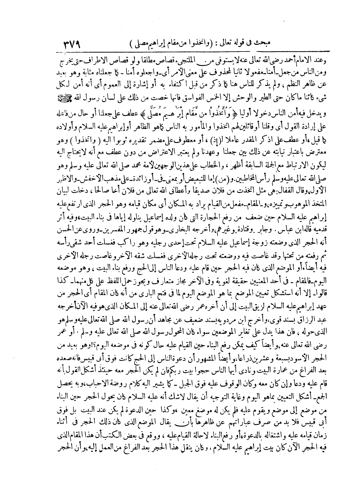 وعند الإمام أحمد رضي الله تعالى عنه لا يستوفي من الملتجيء قصاص مطلقا ولو قصاص الأطراف حتى يخرج ومن الناس من جعل أمنا مفعولا ثانيا لمحذوف على معنى الأمر أيوأ جعلوه أمنا كما جعلناه مثابة وهو بعيد عن ظاهر النظم ولم يذكر للناس هنا كما ذكر من قبل إكتفاء به أو إشارة إلى العموم أي أنه أمن لكل شيء كائنا ما كان حتى الطير والوحش إلا الخمس الفواسق فإنها خصت من ذلك على لسان رسول الله ويدخل فيه أمن الناس دخولا أوليا واتخذوا من مقام إبراهيم مصلى عطف على جعلنا أو حال من فاعله على إرادة القول أي وقلنا أو قائلين لهم إتخذوا والمأمور به الناس كما هو الظاهر أو إبراهيم عليه السلام وأولاده كما قيل أؤ عطف على أذكر المقدر عاملا ل إذ أو معطوف على مضمر تقديره ثوبوا إليه وأتخذوا وهو معترض بإعتبار نيابته عن ذلك بين جعلنا وعهدنا ولم يعتبر الإعتراض من دون عطف مع أنه لا يحتاج إليه ليكون الإرتباط مع الجملة السابقة أظهر والخطاب على هذين الوجهين لأمة محمد صلى الله تعالى عليه وسلم وهو صلى الله تعالى عليه وسلم رأس المخاطبين و من إما للتبعيض أو بمعنى في أو زائدةعلى مذهب الأخفشوالأظهر الأول وقال القفال : هي مثل أتخذت من فلان صديقا وأعطاني الله تعالى من فلان أخا صالحا دخلت لبيان المتخذ الموهوب وتمييزه والمقام مفعل من القيام يراد به المكان أي مكان قيامه وهو الحجر الذي أرتفع عليه إبراهيم عليه السلام حين ضعف من رفع الحجارة التي كان ولده إسماعيل يناوله إياها في بناء البيت وفيه آثر قدميه قاله إبن عباس وجابر وقتادة وغيرهم وأخرجه البخاري وهو قول جمهور المفسرين وروى عن الحسن أنه الحجر الذي وضعته زوجة إسماعيل عليه السلام تحت إحدى رجليه وهو راكب فغسلت أحد شقي رأسه ثم رفعته من تحتها وقد غاصت فيه ووضعته تحت رجله الأخرى فغسلت شقه الآخر وغاصت رجله الأخرى فيه أيضا أو الموضع الذي كان فيه الحجر حين قام عليه ودعا الناس إلى الحج ورفع بناء البيت وهو موضعه اليوم فالمقام في أحد المعنيين حقيقة لغوية وفي الآخر مجاز متعارف ويجوز حمل اللفظ على كل منهما كذا قالوا إلا أنه أستشكل تعيين الموضع بما هو الموضع اليوم لما في فتح الباري من أنه كان المقام أي الحجر من عهد إبراهيم عليه السلام لزيق البيت إلى أن أخره عمر رضي الله تعالى عنه إلى المكان الذي هو فيه الآن أخرجه عبدالرزاق بسند قوي وأخرج إبن مردويه بسند ضعيف عن مجاهد أن رسول الله صلى الله تعالى عليه وسلم هو الذي حوله فإن هذا يدل على تغاير الموضعين سواء كان المحول رسول الله صلى الله تعالى عليه وسلم أو عمر رضي الله تعالى عنه وأيضا كيف يمكن رفع البناء حين القيام عليه حال كونه في موضعه اليوم ! وهو بعيد من الحجر الأسود بسبعة وعشرين ذراعا وأيضا المشهور أن دعوة الناس إلى الحج كانت فوق أبي قبيس فأنه صعده بعد الفراغ من عمارة البيت ونادى أيها الناس حجوا بيت ربكم فإن لم يكن الحجر معه حينئذ أشكل القول بأنه قام عليه ودعا وإن كان معه وكان الوقوف عليه فوق الجبلكما يشير إليه كلام روضة الأحباب وبه يحصل الجمع أشكل التعيين بما هو اليوم وغاية التوجيه أن يقال لا شك أنه عليه السلام كان يحول الحجر حين البناء من موضع إلى موضع ويقوم عليه فلم يكن له موضع معين وكذا حين الدعوة لم يكن عند البيت بل فوق أبي قبيس فلا بد من صرف عباراتهم عن ظاهرها بأن يقال الموضع الذي كان ذلك الحجر في أثناء زمان قيامه عليه وإشتغاله بالدعوة أو رفع البناء لإحالة القيام عليه ووقع في بعض الكتب أن هذا المقام الذي فيه الحجر الآن كان بيت إبراهيم عليه السلام وكان ينقل هذا الحجر بعد الفراغ من العمل إليه وأن الحجر