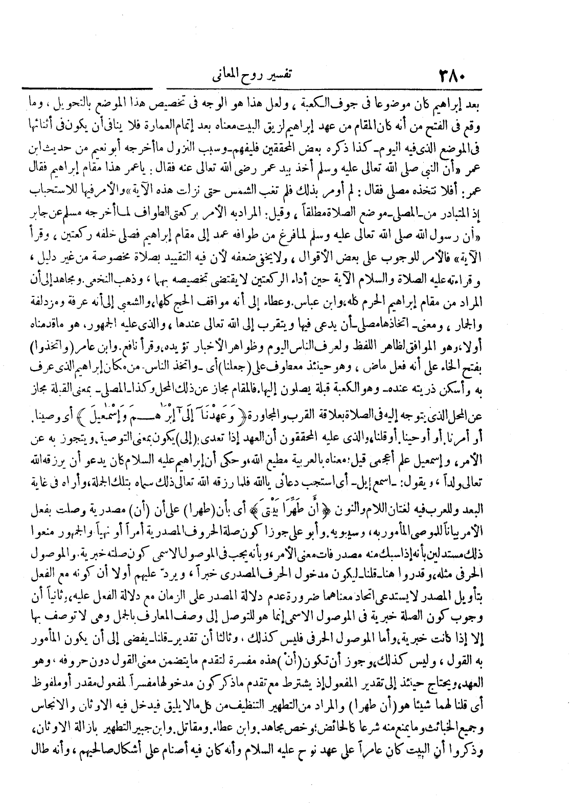 بعد إبراهيم كان موضوعا في جوف الكعبة ولعل هذا هو الوجه في تخصيص هذا الموضع بالتحويل وما وقع في الفتح من أنه كان المقام من عهد إبراهيم لزيق البيت معناه بعد إتمام العمارة فلا ينافي أن يكون في أثنائها في الموضع الذي فيه اليوم كذا ذكره بعض المحقيين فليفهم وسبب النزول ما أخرجه أبو نعيم من حديث إبن عمر أن النبي صلى الله تعالى عليه وسلم أخذ بيد عمر رضي الله تعالى عنه فقال : يا عمر هذا مقام إبراهيم فقال عمر : أفلا نتخذه مصلى فقال : لم أومر بذلك فلم تغب الشمس حتى نزلت هذه الآية والأمر فيها للإستحباب إذ المتبادر من المصلى موضع الصلاة مطلقا وقيل : المراد به الأمر بركعتي الطواف لما أخرجه مسلم عن جابر أن رسول الله صلى الله تعالى عليه وسلم لما فرغ من طوافه عمد إلى مقام إبراهيم فصلى خلفه ركعتين وقرأ الآية فالأمر للوجوب على بعض الأقوال ولا يخفى ضعفه لأن فيه التقييد بصلاة مخصوصة من غير دليل وقراءته عليه الصلاة و السلام الآية حين أداء الركعتين لا يقتضي تخصيصه بهما وذهب النخعي ومجاهد إلى أن المراد من مقام إبراهيم الحرم كله وإبن عباس وعطاء إلى أنه مواقف الحج كلها والشعبي إلى أنه عرفة ومزدلفة والجمار ومعنى إتخاذها مصلى أن يدعى فيها ويتقرب إلى الله تعالى عندها والذي عليه الجمهور وهو ما قدمناه أولا وهو الموافق لظاهر اللفظ ولعرف الناس اليوم وظواهر الأخبار تؤيده وقرأ نافع وإبن عامر وأتخذوا بفتح الخاء على أنه فعل ماض وهو حينئذ معطوف على جعلنا أيواتخذ الناس من مكان إبراهيم الذي عرف به وأسكن ذريته عنده وهو الكعبة قبلة يصلون إليها فالمقام مجاز عن ذلك المحل وكذا المصلى بمعنى القبلة مجاز عن المحل الذي يتوجه إليه في الصلاة بعلاقة القرب والمجاورة وعهدنا إلى إبراهيم وإسماعيل أي وصينا أو أمرنا أو أوحينا أو قلنا والذي عليه المحققون أن العهد إذا تعدى ب إلى يكون بمعنى التوصية ويتجوز به عن الأمر وإسماعيل علم أعجمي قيل : معناه بالعربية مطيع الله وحكى أن إبراهيم عليه السلام كان يدعو أن يرزقه الله تعالى ولدا ويقول : أسمع إي لأي أستجب دعائي ياالله فلما رزقه الله تعالى ذلك سماه بتلك الجملة وأراه في غاية البعد وللعرب فيه لغتان اللام والنون أن طهرا بيتي أي بأن ظهرا على أن أن مصدرية وصلت بفعل الأمر بيانا للموصى المأمور به وسيبويه وأبو علي جوزا كون صلة الحروف المصدرية أمرا أو نهيا والجمهور منعوا ذلك مستدلين بأنه إذا سبك منه مصدر فات معنى الأمر وبأنه يجب في الموصول الأسمى كون صلته خبرية والموصول الحرفي مثله وقدروا هنا قلنا ليكون مدخول الحرف المصدري خبرا ويرد عليهم أولا أن كونه مع الفعل بتأويل المصدر لا يستدعي إتحاد معناهما ضرورة عدم دلالة المصدر على الزمان مع دلالة الفعل عليه وثانيا أن وجوب كون الصلة خبرية في الموصول الأسمي إنما هو للتوصل إلى وصف المعارف بالجمل وهي لا توصف بها إلا إذا كانت خبرية وأما الموصول الحرفي فليس كذلك وثالثا أن تقدير قلنا يفضي إلى أن يكون المأمور به القول وليس كذلك وجوز أن تكون أن هذه مفسرة لتقدم ما يتضمن معنى القول دون حروفه وهو العهد ويحتاج حينئذ إلى تقدير المفعول إذ يشترط مع تقدم ما ذكر كون مدخولها مفسرا لمفعول مقدر أو ملفوظ أي قلنالهما شيئا هو أن طهرا والمراد من التطهير التنظيف من كل ما لا يطيق فيدخل فيه الأوثان والأنجاس وجميع الخبائث وما يمنع منه شرعا كالحائض وخص مجاهد وإبن عطاء ومقاتل وإبن جبير التطهير بإزالة الأوثان وذكروا أن البيت كان عامرا على عهد نوح عليه السلام وأنه كان فيه أصنام على أشكال صالحيهموأنه طال