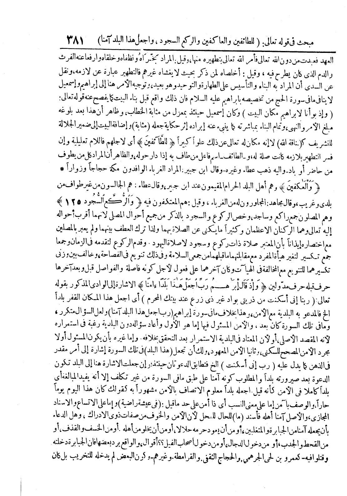 والعاكفين وهم أهل البلد الحرام المقيمون عند إبن جبير وقال عطاء : هم الجالسون من غير طواف من بلدي وغريب وقال مجاهد : المجاورون له من الغرباء وقيل : هم المعتكفون فيه والركع السجود 521 وهم المصلون جمع راكع وساجد وخص الركوع والسجود بالذكر من جميع أحوال المصلى لأنهما أقرب أحواله إليه تعالى وهما الركنان الأعظمان وكثيرا ما يكنى عن الصلاة بهما ولذا ترك العطف بينهما ولم يعبر بالمصلين مع إختصاره إيذانا بأن المعتبر صلاة ذات ركوع وسجود لا صلاة اليهود وقدم الركوع لتقدمه في الزمان وجمعا جمع تكسير لتغير هيأة المفرد مع مقابلتهما ما قبلهما من جمعي السلامة وفي ذلك تنويع في الفصاحة وخالف بين وزني تكسيرهما للتنويع مع المخالفة في الهيآت وكان آخرهما على فعول لأجل كونه فاصلة والفواصل قبل وبعد آخرها حرف قبله حرف مدولين وإذ قال إبراهيم رب أجعل هذا بلدا آمنا الإشارة إلى الوادي المذكور بقوله تعالى ربنا إني أسكنت من ذريتي بواد غير ذي زرع عند بيتك المحرم أي أجعل هدا المكان القفر بلدا إلخ فالمدعو به البلدية مع الأمن وهذا بخلاف ما في سورة إبراهيم رب أجعل هذا البلد آمنا ولعل السؤال متكرر وما في تلك السورة كان بعد والأمن المسئول فيها إما هو الأول وأعاد سؤاله دون البلدية رغبة في إستمراره لأنه المقصد الأصلي أو لأن المعتاد في البلدية الإستمرار بعد التحقق بخلافه وإما غيره بأن يكون المسئول أولا مجرد الأمن المصحح للسكنى وثانيا الأمن المعهود ولك أن تجعل هذا البلد في تلك السورة إشارة إلى أمر مقدر في الذهن كما يدل عليه رب إني أسكنت إلخ فتطابق الدعوتان حينئذ وإن جعلت الإشارة هنا إلى البلد تكون الدعوة بعد صيرورته بلدا والمطلوب كونه آمنا على طبق ما في السورة من غير تكلف إلا أنه يفيد المبالغة أي بلدا كاملا في الأمن كأنه قيل أجعله بلدا معلوم الإتصاف بالأمن مشهورا به كقولك كان هذا اليوم يوما حارا والوصف بآمن إما على معنى النسب أي ذا أمن على حد ما قيل : في عيشة راضية وإما على الإتساع والإسناد المجازي والأصل آمنا أهله فأسند ما للحال للمحل لأن الأمن والخوف من صفات ذوي الإدراك وهل الدعاء بأن يجعله آمنا من الجبابرة والمتغلبين أو من أن يعود حرمه حلالا أو من أن يخلو من أهله أو من الخسف والقذف أو من القحط والجدب أو من دخول الدجال أو من دخول أصحاب الفيل أقوال والواقع يرد بعضها فإن الجبابرة دخلته وقتلوا فيه كعمرو بن لحمي الحرهمي والحجاج القفي والقرامطة وغيرهم وكون البعض لم يدخله للتخريب بل كان