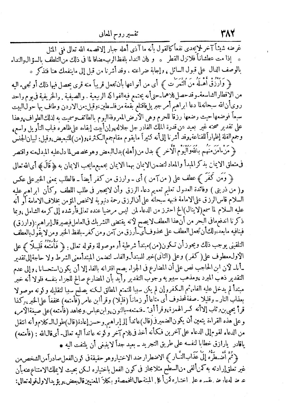 وأرزق أهله من الثمرات أي من أنواعها بأن تجعل قريبا منه قرى يحصل فيها ذلك أو تجيء إليه من الأقطار الشاسعةوقد حصل كلاهما حتى أنه يجتمع فيه الفواكه الربيعية والصيفية والخريفية في يوم واحد روى أن الله سبحانه لما دعا إبراهيم أمر جبريل فأقتلع بقعة من فلسطين وقيل : من الأردن وطاف بها حول البيت سبعا فوضعها حيث وضعها رزقا للحرم وهي الأرض المعروفة اليوم بالطائف وسميت به لذلك الطواف وهذا على تقدير صحته غير بعيد عن قدرة الملك القادر جل جلاله وإن أبيت إبقاءه على ظاهره فباب التأويل واسع وجمع القلة إظهارا للقناعة وقد اشرنا إلى أنه كثيرا ما يقوم مقام جمع الكثرة و من للتبعيض وقيل : لبيان الجنس من آمن منهم بالله واليوم تلآخر بدل من أهله بدل البعض وهو مخصص لما دل عليه المبدل منه وأقتصر في متعلق الإيمان بذكر المبدأ والمعاد لتضمن الإيمان بهما الإيمان بجميع ما يجب الإيمان به قال أي الله تعالى ومن كفر عطف على من آمن ايوأرزق من كفر أيضا فالطلب بمعنى الخبر على عكس و من ذريتي وفائدة العدول تعليم تعميم دعاء الرزق وأن لا يحجر في طلب اللطف وكان إبراهيم عليه السلام قاس الرزق على الأمامة فنبهه سبحانه على أن الرزق رحمة دنيوية لا تخص المؤمن بخلاف الأمامة أو أنه عليه السلام لما سمع لا ينال إلخ أحترز من الدعاء لمن ليس مرضيا عنده تعالى فأرشده إلى كرمه الشامل وبما ذكرنا أندفع ما في البحر من أن هذا العطف لا يصح لأنه يقتضي التشريك في العامل فيصير قال إبراهيم : وأرزق فينا فيه ما بعد ولك أن تجعل العطف على محذوف أيأرزق من آمن ومن كفر بلفظ الخبر ومن لا يقول بالعطف التلقيني يوجب ذلك ويجوز أن تكون من مبتدأ شرطية أو موصولة وقوله تعالى : فأمتعه قليلا على الأول معطوف على كفر وعلى الثاني خبر للمبتد أو الفاء لتضمن المبتدأ معنى الشرط ولا حاجة إلى تقدير أنا لأن إبن الحاجب نص على أن المضارع في لجزاء يصح إقترانه بالفاء إلا أن يكون إستحسانا وإلى عدم التقدير ذهب المبرد ومذهب سيبويه وجوب التقدير وأيد بأن المضارع صالح للجزاء بنفسه فلولا أنه خبر مبتدأ لم يدخل عليه الفاء ثم الكفر وإن لم يكن سببا للتمتع المطلق لكنه يصلح سببا لتقليله وكونه موصولا بعذاب النار وقليلا صفة لمحذوف أي متاعا أو زمانا قليلا وقرأ إبن عامر فأمتعه مخففا على الخبر وكذا قرأ يحيى بن وثاب إلا أنه كسر الهمزة وقرأ أبي فنمتعه بالنون وإبن عباس ومجاهد فأمتعه على صيغة الأمر وعلى هذه القراءة يتعين أن يكون الضمير في قال عائدا إلى إبراهيم وحسن إعادة قال طول الكلام وأنه أنتقل من الدعاء لقوم إلى الدعاء على آخرين فكأنه أخذ في كلام آخر وكونه عائدا إليه تعالىأي قال الله : فأمتعه ياقادر يارزاق خطابا لنفسه على طريق التجريدبعيد جدا لا ينبغي أن يلتفت إليه