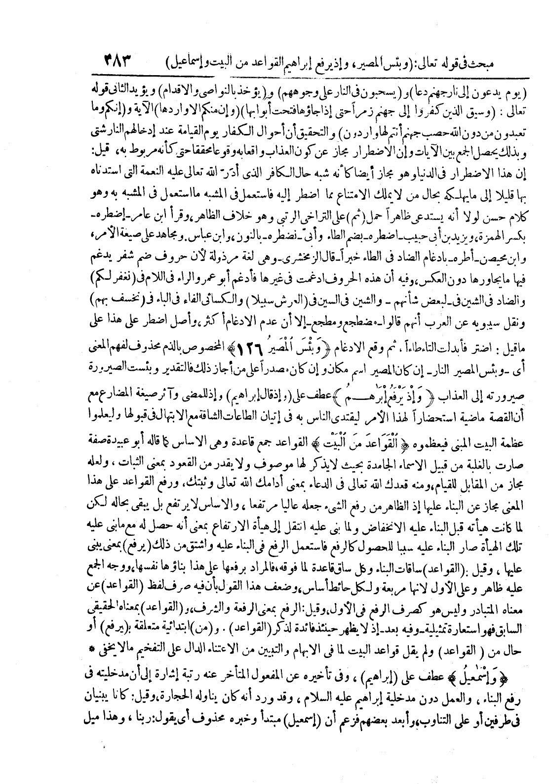 يوم يدعون إلى نار جهنم دعا و يسحبون في النار على وجوههم و يؤخذ بالنواصي والأقدام ويؤيد الثاني قوله تعالى : وسيق الذين كفروا إلى جهنم زمرا حتى إذا جاؤها فتحت أبوابها وإن منكم إلا واردها الآية و إنكم وما تعبدون من دون الله حصب جهنم أنتم لها واردون والتحقيق أن أحوال الكفار يوم القيامة عند إدخالهم النار شتى وبذلك يحصل الجمع بين الآيات وإن الإضطرار مجاز عن كون العذاب واقعا به وقوعا محقا حتى كأنه مربوط به قيل : إن هذا ألإضطرار في الدنيا وهو مجاز أيضا كأنه شبه حال الكافر الذي أدر الله تعالى عليه النعمة التي أستدناه بها قليلا إلى ما يهلكه بحال من لا يملك الإمتناع مما أضطر إليه فأستعمل في المشبه ماأستعمل في المشبه به وهو كلام حسن لولا أنه يستدعي ظاهرا حمل ثم على التراخي الرتبي وهو خلاف الظاهر وقرأ إبن عامرإضطرهبكسر الهمزة ويزيد بن أبي حبيب أضطره بضم الطاء وأبي نضطره بالنون وإبن عباس ومجاهد على صيغة الأمر وإبن محيصن أطره بإدغام الضاد في الطاء خبرا قال الزمخشري وهي لغة مرذولة لأن حروف ضم شفر يدغم فيها ما يجاورها دون العكس وفيه أن هذه الحروف أذغمت في غيرها فأدغم أبو عمرو الراء في اللام في نغفر لكم والضاد في الشين فيلبعض شأنهم والشين في السين في العرش سبيلا والكسائي الفاء في الباء في نخسف بهم ونقل سيبويه عن العرب أنهم قالوا مضطجع ومطجعإلا أن عدم الإدغام أكثر واصل أضطر على هذا على ما قيل : أصتر فأبدلت التاء طاءا ثم وقع الإدغام وبئس المصير 621 المخصوص بالذم محذوف لفهم المعنى أي وبئس المصير النار إن كان المصير أسم مكان وإن كان مصدرا على من أجاز ذلك فالتقدير وبئست الصيرورة صيرورته إلى العذاب وإذ يرفع إبراهيم عطف على وإذ قال إبراهيم وإذ للمضى وآثر صيغة المضارع مع أن القصة ماضية إستحضارا لهذا الأمر ليقتدي الناس به في إتيان الطاعات الشاقة مع الإبتهال في قبولها وليعلموا عظمة البيت المبني فيعظموه القواعد من البيت القواعد جمع قاعدة وهي الأساس كما قاله أبو عبيدة صفة صارت بالغلبة من قبيل الأسماء الجامدة بحيث لا يذكر لها موصوف ولا يقدر من القعود بمعنى الثبات ولعله مجاز من المقابل للقيام ومنه قعدك الله تعالى في الدعاء بمعنى أدامك الله تعالى وثبتك ورفع القواعد على هذا المعنى مجاز عن البناء عليها إذ الظاهر من رفع الشيء جعله عاليا مرتفعا والأساس لا يرتفع بل يبقى بحاله لكن ما كانت هيأته قبل البناء عليه الإنخفاض ولما بنى عليه إنتقل إلى هيأة الأرتفاع بمعنى أنه حصل له مع ما بنى عليه تلك الهيأة صار البناء عليه سببا للحصول كالرفع فأستعمل الرفع في البناء عليه وأشتق من ذلك يرفع بمعنى يبني عليها وقيل : القواعد ساقات البناء وكل ساق قاعدة لما فوقه فالمراد برفعها على هذا بناؤها نفسها ووجه الجمع عليه ظاهر وعلى الأول لأنها مربعة ولكل حائط أساس وضعف هذا القول بأن فيه صرف لفظ القواعد عن معناه المتبادر وليس هو كصرف الرفع في الأول وقيل : الرفع بمعنى الرفعة والشرف و القواعد بمعناه الحقيقي السابق فهو إستعارة تمثيلية وفيه بعدإذ لا يظهر حينئذ فائدة لذكر القواعد و من إبتدائية متعلقة ب يرفع أو حال من القواعد ولم يقل قواعد البيت لما في الإبهام والتبيين من الإعتناء الدال على التفخيم ما لا يخفى