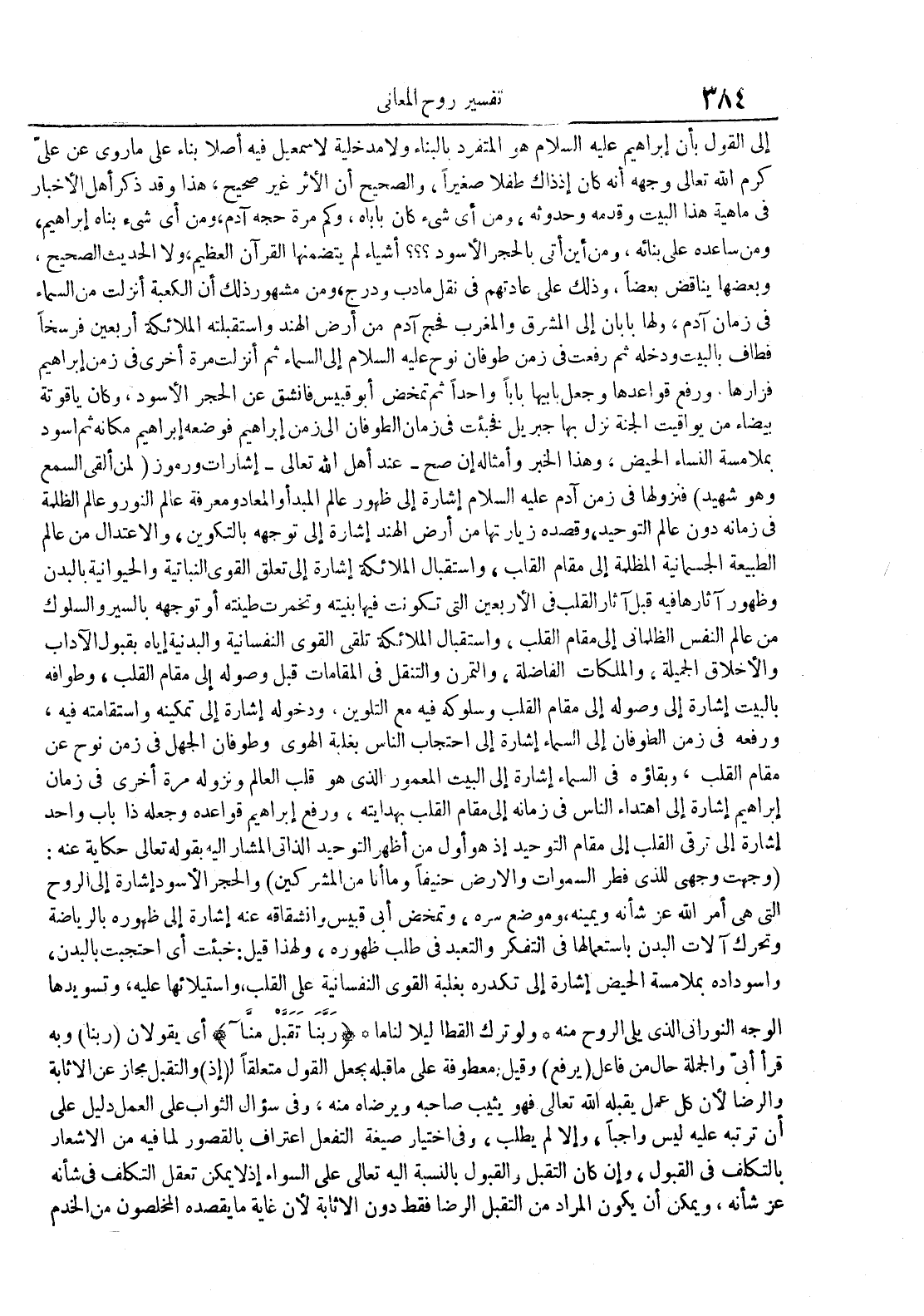 إلى القول بأن إبراهيم عليه السلام هو المتفرد بالبناء ولا مدخلية لإسمعيل فيه أصلا بناء على ما روى عن علي كرم الله تعالى وجهه أنه كان إذ ذاك طفلا صغيرا والصحيح أن الأثر غير صحيح هذا وقد ذكر أهل الأخبار في ماهية هذا البيت وقدمه وحدوثه ومن أي شيء كان باباه وكم مرة حجه آدم ومن أي شيء بناه إبراهيم ومن ساعده على بنائه ومن أين أتى بالحجر الأسود أشياء لم يتضمنها القرآن العظيم ولا الحديث الصحيح وبعضها يناقض بعضا وذلك على عادتهم في نقل مأدب ودرج ومن مشهور ذلك أن الكعبة أنزلت من السماء في زمان آدم ولها بابان إلى المشرق والمغرب فحج آدم من أرض الهند وأستقبلته الملائكة أربعين فرسخا فطاف بالبيت ودخله ثم رفعت في زمن طوفان نوح عليه السلام إلى السماء ثم أنزلت مرة أخرى في زمن إبراهيم فزارها ورفع قواعدها وجعل بابيها بابا واحدا ثم تمخض أبو قبيس فأنشق عن الحجر الأسود وكان ياقوتة بيضاء من يواقيت الجنة نزل بها جبريل فخبئت في زمان الطوفان إلى زمن إبراهيم فوضعه إبراهيم مكانه ثم أسود بملامسة النساء الحيض وهذا الخبر وأمثاله إن صحعند أهل الله تعالىإشارات ورموز لمن ألقى السمع وهو شهيد فنزولها في زمن آدم عليه السلام إشارة إلى ظهور عالم المبدأ والمعاد ومعرفة عالم النور وعالم الظلمة في زمانه دون عالم التوحيد وقصده زيارتها من أرض الهند إشارة إلى توجهه بالتكوين والإعتدال من عالم الطبيعة الجسمانية المظلمة إلى مقام القلب وإستقبال الملائكة إشارة إلى تعلق القوى النباتية والحيوانية بالبدن وظهور آثارها فيه قبل آثار القلب في الأربعين التي تكونت فيها إبنتيه وتخمرت طينته أو توجهه بالسير والسلوك من عالم النفس الظلمائي إلى مقام القلب وإستقبال الملائكة تلقى القوى النفسانية والبدنية إياه بقبول الآداب والأخلاق الجميلة والملكات الفاضلة والتمرن والتنقل في المقامات قبل وصوله إلى مقام القلب وطوافه بالبيت إشارة إلى وصوله إلى مقام القلب وسلوكه فيه مع التلوين ودخوله إشارة إلى تمكينه وإستقامته فيه ورفعه في زمن الطوفان إلى السماء إشارة إلى إحتجاب الناس بغلبة الهوى وطوفان الجهل في زمن نوح عن مقام القلب وبقاؤه في السماء إلى البيت المعمور الذي هو قلب العالم ونزوله مرة أخرى في زمان إبراهيم إشارة إلى إهتداء الناس في زمانه إلى مقام القلب بهدايته ورفع إبراهيم قواعده وجعله ذا باب واحد إشارة إلى ترقي القلب إلى مقام التوحيد إذ هو أول من أظهر التوحيد الذاتي المشار إليه بقوله تعالى حكاية عنه : وجهت وجهي للذي فطر السموات والأرض حنيفا وما أنا من المشركين والحجر الأسود إشارة إلى الروح التي هي أمر الله عز شأنه ويمينه وموضع سره وتمخض أبي قبيس وإنشقاقه عنه إشارة إلى ظهوره بالرياضة وتحرك آلات البدن بإستعمالها في التفكر والتعبد في طلب ظهوره ولهذا قيل : خبئت أي أحتجبت بالبدن وأسوداده بملامسة الحيض إشارة إلى تكدره بغلبة القوى النفسانية على القلب وإستيلائها عليه وتسويدها الوجه النوراني الذي يلي الروح منه