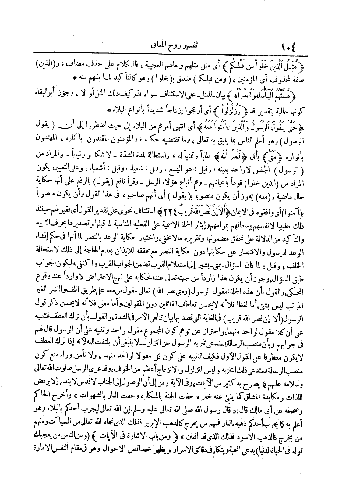 حتى يقول الرسول والذين آمنوا معه أي إنتهى أمرهم من البلاء إلى حيث أضطروا إلى أن يقول الرسول وهو أعلم الناس بما يليق به تعالى وما تقتضيه حكمته والمؤمنون المقتدون بآثاره المهتدون بأنواره متى يأتي نصر الله طلبا وتمنيا له وأستطالة لمدة الشدةلا شكا وإرتياباوالمراد من الرسول الجنس لا واحد بعينه وقيل : هو اليسع وقيل : شعياء وقيل : أشعياء وعلى التعيين يكون المراد من الذين خلوا قوما بأعيانهموهم أتباع هؤلاء الرسلوقرأ نافع يقول بالرفع على أنها حكاية حال ماضية و معه يجوز أن يكون منصوبا ب يقول أي أنهم صاحبوه في هذا القول وأن يكون منصوبا ب آمنوا أي وافقوه في الإيمان إلاأن نصر الله قريب 412 إستئناف نحوي على تقدير القول أي فقيل لهم حينئذ ذلك تطييبا لأنفسهم بإسعافهم بمرامهم وإيثار الجملة الأسمية على الفعلية المناسبة لما قبلها وتصديرها بحرف التنبيه والتأكيد من الدلالة على تحقق مضمونها وتقريره ما لا يخفى وإختيار حكاية الوعد بالنصر لما أنها في حكم إنشاء الوعد للرسول والإقتصار على حكايتها دون حكاية النصر مع تحققه للإيذان بعدم الحاجة إلى ذلك لإستحالة الخلف وقيل : لما كان السؤالبمتىيشير إلى إستعلام القرب تضمن الجواب القرب وأكتفى به ليكون الجواب طبق السؤال وجوز أن يكون هذا واردا من جهته تعالى عند الحكاية على نهج الإعتراض لا واردا عند وقوع المحكي والقول بأن هذه الجملة : مقول الرسول ومتى نصر الله تعالى مقول من معه على طريق اللف والنشر الغير المرتب ليس بشيء أما لفظا فلأنه لا يحسن تعاطف القائلين دون المقولين وأما معنى فلأنه لا يحسن ذكر قول الرسول ألا إن نصر الله قريب في الغاية التي قصد بها بيان تناهي الأمر في الشدة والقولبأن ترك العطف للتنبيه على أن كلا مقول لواحد منهما وإحتراز عن توهم كون المجموع مقول واحد وتنبيه على أن الرسول قال لهم في جوابهم وبأن منصب الرسالة يستدعي تنزيه الرسول عن التزلزللا ينبغي أن يلتفت إليه لأنه إذا ترك العطف لا يكون معطوفا على القول الأول فكيف التنبيه على كون كل مقولا لواحد منهما ولا نأمن وراء منع كون منصب الرسالة يستدعي ذلك التنزيه وليس التزلزل والإنزعاج أعظم من الخوف وقد عرى الرسل صلوات الله تعالى وسلامه عليهم كما يصرح به كثير من الآيات وفي الآية رمز إلى أن الوصول إلى الجناب الأقدس لايتيسر إلا برفض اللذات ومكابدة المشاق كما ينبيء عنه خبر حفت الجنة بالمكاره وحفت النار بالشهوات وأخرج الحاكم وصححه عن أبي مالك قال : قال رسول الله صلى الله تعالى عليه وسلم إن الله تعالى ليجرب أحدكم بالبلاء وهو أعلم به كما يجرب أحدكم ذهبه بالنار فمنهم من يخرج كالذهب الإبريز فذلك الذي نجاه الله تعالى من السيآت ومنهم من يخرج كالذهب الأسود فذلك الذي قد أفتتن ومن باب الإشارة في الآيات ومن الناس من يعجبك قوله في الحياة الدنيا يدعى المحبة ويتكلم في دقائق الأسرار ويظهر خصائص الأحوال وهو في مقام النفس الأمارة
