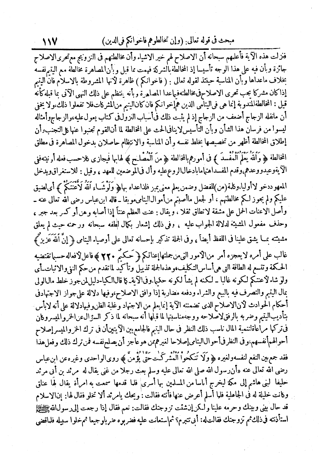 فنزلت هذه الآية فأعلمهم سبحانه أن الإصلاح لهم خير الأشياء وأن مخالطتهم في التزويج مع تحري الإصلاح جائزة وبأن فيه على هذا الوجه تأسيسا إذ المخالطة بالشركة فهمت مما قبل وبأن المصاهرة مخالطة مع اليتيم نفسه بخلاف ما عداها وبأن المناسبة حينئذ لقوله تعالى : فإخوانكم ظاهرة لأنها المشروطة بالإسلام فإن اليتيم إذا كان مشركا يجب تحري الإصلاح في مخالطته فيما عدا المصاهرة وبأنه ينتظم على ذلك النهي الآتي بما قبله كأنه قيل : المخالطة المندوبة إنما هي في اليتامى الذين هم إخوانكم فإن كان اليتيم من المشركات فلا تفعلوا ذلك ولا يخفى أن ما نقله الزجاج أضعف من الزجاج إذ لم يثبت ذلك في أسباب النزول في كتاب يعول عليه والزجاج وأمثاله ليسوا من فرسان هذا الشأن وبأن التأسيس لا ينافي الحث على المخالطة لما أن القوم تجنبوا عنها كل التجنب وأن إطلاق المخالطة أظهر من تخصيصها بخلط نفسه وأن المناسبة والإنتظام حاصلان بدخول المصاهرة في مطلق المخالطة والله يعلم المفسد في أمورهم بالمخالطة من المصلح لها بها فيجازي كلا حسب فعله أو نيته ففي الآية وعيد ووعدهم وقدم المفسد إهتماما بإدخال الروع عليه وأل في الموضعين للعهد وقيل : للإستغراق ويدخل المعهود دخولا أوليا وكلمة من للفضل وضمن يعلم معنى يميز فلذا عداه بها ولو شاء الله لأعنتكم أي لضيق عليكم ولم يجوز لكم مخالطتهم أو لجعل ما أصبتم من أموال اليتامى موبقاقاله إبن عباس رضي الله تعالى عنهوأصل الأعنات الحمل على مشقة لا تطلق ثقلا ويقال : عنت العظم عنتا إذا أصابه وهن أو كسر بعد جبر وحذف مفعول المشيئة لدلالة الجواب عليه وفي ذلك إشعار بكمال لطفه سبحانه ورحمته حيث لم يعلق مشيئته بما يشق علينا في اللفظ أيضا وفي الجملة تذكير بإحسانه تعالى على أوصياء اليتامى إن الله عزيز غالب على أمره لا يعجزه أمر من الأمور التي من جملتها إعناتكم حكيم 022 فاعل لأفعاله حسبما تقتضيه الحكمة وتتسع له الطاقة التي هي أساس التكليف وهذه الجملة تذييل وتأكيد لما تقدم من حكم النفي والإثبات أي ولو شاء لأعنتكم لكونه غالبالكنه لم يشأ لكونه حكيما وفي الآيةكما قال الكيادليل لمن جوز خلط مال الولي بمال اليتيم والتصرف فيه بالبيع والشراء ودفعه مضاربة إذا وافق الإصلاح وفيها دلالة على جواز الإجتهاد في أحكام الحوادث لأن الإصلاح الذي تضمنته الآية إنما يعلم من الإجتهاد وغلبة الظن وفيها دلالة على أنه لا بأس بتأديب اليتيم وضربه بالرفق لإصلاحه ووجه مناسبتها لما قبلها أنه سبحانه لما ذكر السؤال عن الخمر والميسر وكان في تركها مراعاة لتنمية المال ناسب ذلك النظر في حال اليتيم فالجامع بين الآيتين أن في ترك الخمر والميسر إصلاح أحوالهم أنفسهم وفي النظر في أحوال اليتامى إصلاحا لغيرهم ممن هو عاجز أن يصلح نفسه فمن ترك ذلك وفعل هذا فقد جمع بين النفع لنفسه ولغيره ولا تنكحوا المشركات حتى يؤمن روى الواحدي وغيره عن إبن عباس رضي الله تعالى عنه أن رسول الله صلى الله تعالى عليه وسلم بعث رجلا من غنى يقال له مرثد بن أبي مرثد حليفا لبني هاشم إلى مكة ليخرج أناسا من المسلمين بها أسرى فلما قدمها سمعت به أمرأة يقال لها عناق وكانت خليلة له في الجاهلية فلما أسلم أعرض عنها فأتته فقالت : ويحك يامرثد ألا تخلو فقال لها : إن الإسلام قد حال بيني وبينك وحرمه علينا ولكن إن شئت تزوجتك فقالت : نعم فقال إذا رجعت إلى رسول الله أستأذنته في ذلك ثم تزوجتك فقالت له : أبي تتبرم ثم أستعانت عليه فضربوه ضربا وجيعا ثم خلوا سبيله فلما قضى