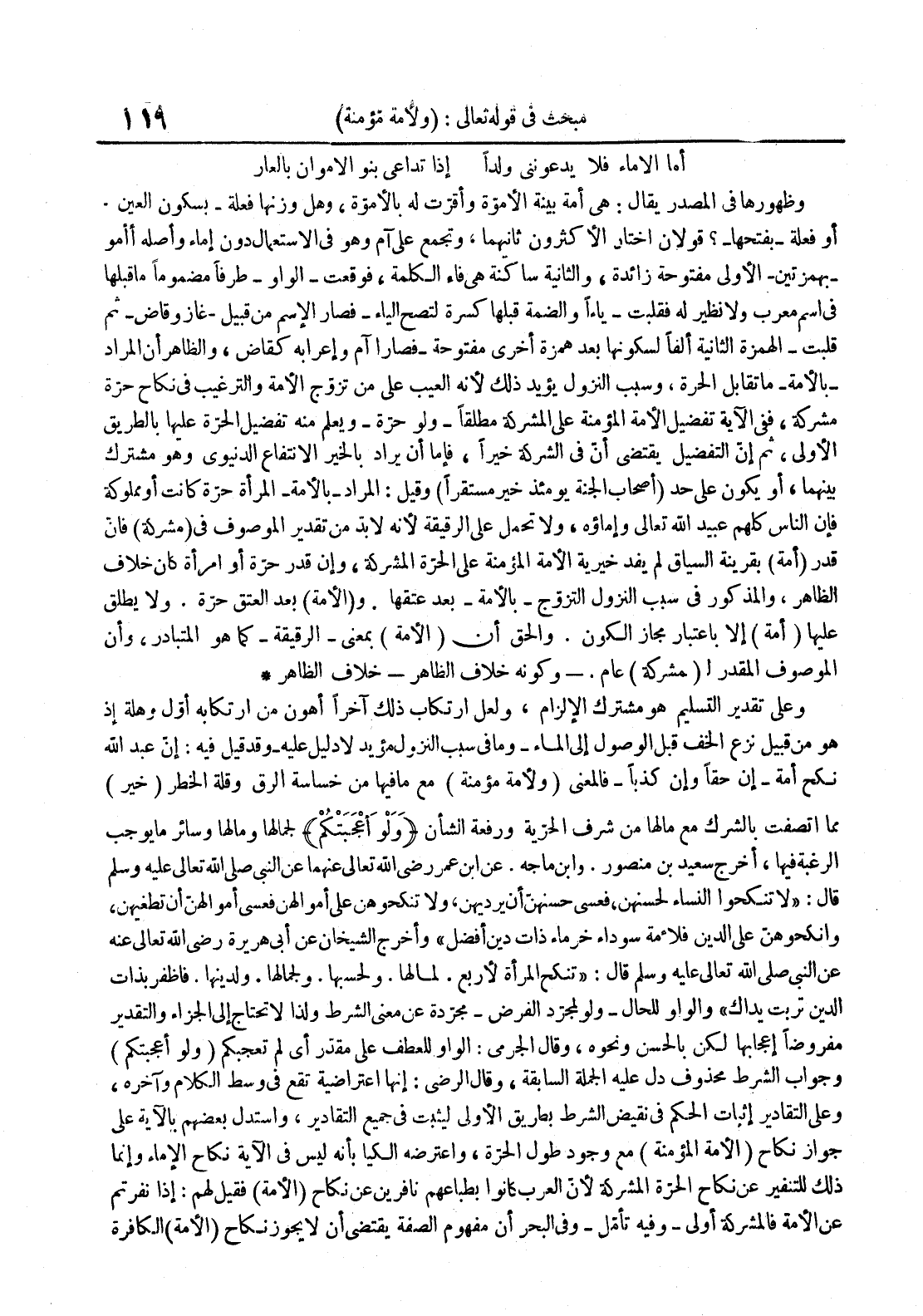 أما الإماء فلا يدعونني ولدا إذا تداعى بنو الأموان بالعار وظهورها في المصدر يقال : هي أمة بينة الأموة وأقرت له بالأموة وهل وزنها فعلةبسكون العينأو فعلةبفتحا قولان أختار الأكثرون ثانيهما وتجمع على آم وهو في الإستعمال دون إماء وأصله أأمو بهمزتينالأولى مفتوحة زائدة والثانية ساكنة هي فاء الكلمة فوقعتالواوطرفا مضموما ما قبلها في أسم معرب ولا نظير له فقلبت ياءا والضمة قبلها كسرة لتصح الياءفصار الإسم من قبيلغاز وقاضثم ثبتالهمزة الثانية ألفا لسكونها بعد همزة أخرى مفتوحة فصارأ آم وإعرابه كقاض والظاهر أن المراد بالأمةما تقابل الحرة وسبب النزول يؤيد ذلك لأنه العيب على من تزوج الأمة والترغيب في نكاح حرة مشركة ففي الآية تفضيل الأمة المؤمنة عل المشركة مطلقاولو حرةويعلم منه تفضيل الحرة عليها بالطريق الأولىثم إن التفضيل يقتضي أن في الشركة خيرا فإما أن يراد بالخير الإنتفاع الدنيوي وهو مشترك بينهما أؤ يكون على حد أصحاب الجنة يومئذ خير مستقرا وقيل : المرادبالأمةالمر حرة كانت أو مملوكة فإن الناس كلهم عبيداله تعالى وإماؤه ولا تحمل على الرقيقة لأنه لا بد من تقدير الموصوف في مشركة فإن قدر أمة بقرينة السياق لم يفد خيرية الأمة المؤمنة على الحرة المشركة وإن قدر حرة أو أمرأة كان خلاف الظاهر والمذكور في سبب النزول التزوجبالأمةبعد عتقها و الأمة بعد العتق حرة ولا يطلق عليها أمة بإعتبار مجاز الكون والحق أن الأمة بمعنىالرقيقةكما هو المتبادر وأن الموصوف المقدر ل مشركة عاموكونه خلاف الظاهرخلاف الظاهر