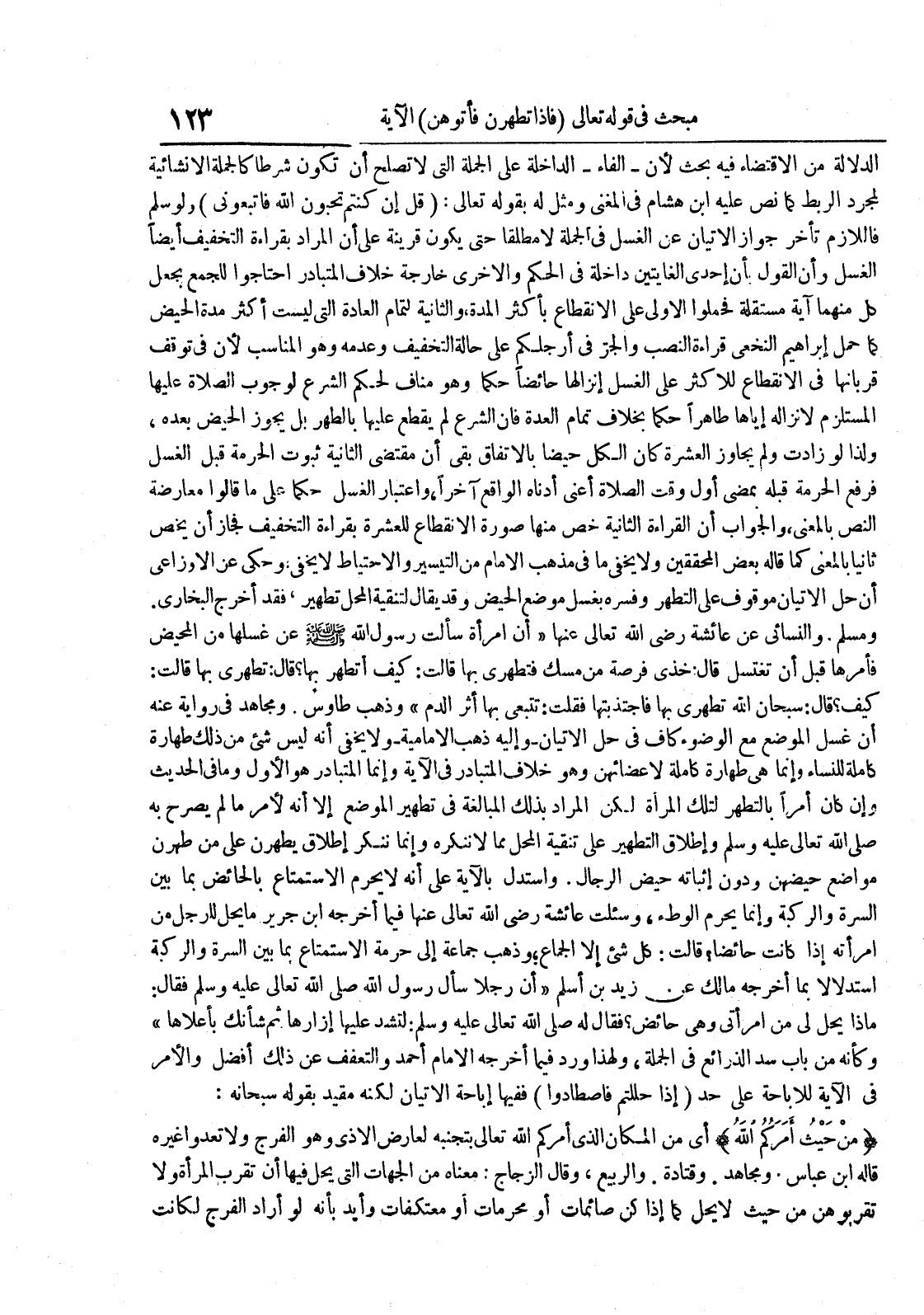 الدلالة من الإقتضاء فيه بحث لأنالفاءالداخلة على الجملة التي لا تصلح أن تكون شرطا كالجملة الإنشائية لمجرد الربط كما نص عليه إبن هشام في المعنى ومثل له بقوله تعالى : قل إن كنتم تحبون الله فأتبعوني ولو سلم فاللازم تأخر جواز الإتيان عن الغسل في الجملة لا مطلقا حتى يكون قرينة على أن المراد بقراءة التخفيف أيضا الغسل وأن القول بأن إحدى الغايتين داخلة في الحكم والأخرى خارجة خلاف المتبادر أحتاجوا للجمع بجعل كل منهما آية مستقلة فحملوا الأولى على الإنقطاع بأكثر المدة والثانية لتمام العادة التي ليست أكثر مدة الحيض كما حمل إبراهيم النخعي قراءة النصب والجر في أرجلكم على حالة التخفيف وعدمه وهو المناسب لأن في توقف قربانها في الإنقطاع للأكثر على الغسل إنزالها حائضا حكما وهو مناف لحكم الشرع لوجوب الصلاة عليها المستلزم لإنزاله إياها طاهرا حكما بخلاف تمام العدة فإن الشرع لم يقطع عليها بالطهر بل يجوز الحيض بعده ولذا لو زادت ولم يجاوز العشرة كان الكل حيضا بالإتفاق بقى أن مقتضى الثانية ثبوت الحرمة قبل الغسل فرفع الحرمة قبله بمضى أول وقت الصلاة أعني أدناه الواقع آخرا وإعتبار الغسل حكما على ما قالوا معارضة النص بالمعنى والجواب أن القراءة الثانية خص منها صورة الإنقطاع للعشرة بقراءة التخفيف فجاز أن يخص ثانيا بالمعنى كما قاله بعض المحققين ولا يخفى ما في مذهب الإمام من التيسير والإحتياط لا يخفى وحكى عن الأوزاعي أن حل الإتيان موقوف على التطهر وفسره بغسل موضع الحيض وقد يقال لتنقية المحل تطهير فقد أخرج البخاري ومسلم والنسائي عن عائشة رضي الله تعالى عنها أن أمرأة سألت رسول الله عن غسلها من المحيض فأمرها قبل أن تغتسل قال : خذي فرصة من مسك فتطهري بها قالت : كيف أتطهر بها قال : تطهري بها قالت : كيف قال : سبحان الله تطهري بها فأجتذبتها فقلت : تتبعي بها أثر الدم وذهب طاوس ومجاهد في رواية عنه أن غسل الموضع مع الوضوء كاف في حل الإتيانوإليه ذهب الإماميةولا يخفى أنه ليس شيء من ذلك طهارة كاملة للنساء وإنما هي طهارة كاملة لأعضائهن وهو خلاف المتبادر في الآية وإنما المتبادر هو الأول وما في الحديث وإن كان أمرا بالتطهر لتلك المرأة لكن المراد بذلك المبالغة في تطهير الموضع إلا أنه لأمر ما لم يصرح به صلى الله تعالى عليه وسلم وإطلاق التطهير على تنقية المحل مما لا ننكره وإنما ننكر إطلاق يطهرن على من طهرن مواضع حيضهن ودون إثباته حيض الرجال وأستدل بالآية على أنه لا يحرم الإستمتاع بالحائض بما بين السرة والركبة وإنما يحرم الوطء وسئلت عائشة رضي الله تعالى عنها فيما أخرجه إبن جرير ما يحل للرجل من أمرأته إذا كانت حائضا قالت : كل شيء إلا الجماع وذهب جماعة إلى حرمة الإستمتاع بما بين السرة والركبة إستدلالا بما أخرجه مالك عن زيد بن أسلم أن رجلا سأل رسول الله صلى الله تعالى عليه وسلم فقال : ماذا يحل لي من أمرأتي وهي حائض فقال له صلى الله تعالى عليه وسلم : لتشد عليها إزارها ثم شأنك بأعلاها وكأنه من باب سد الذرائع في الجملة ولهذا ورد فيما أخرجه الإمام أحمد والتعفف عن ذلك أفضل والأمر في الآية للإباحة على حد إذا حللتم فأصطادوا ففيها إباحة الإتيان لكنه مقيد بقوله سبحانه : من حيث أمركم الله أي من المكان الذي أمركم الله تعالى بتجنبه لعارض الأذى وهو الفرج ولا تعدوا غيره قاله إبن عباس ومجاهد وقتادة والربيع وقال الزجاج : معناه من الجهات التي يحل فيها أن تقرب المرأة ولا تقربوهن من حيث لا يحل كما إذا كن صائمات أو محرمات أو معتكفات وأيد بأنه لو أراد الفرج لكانت