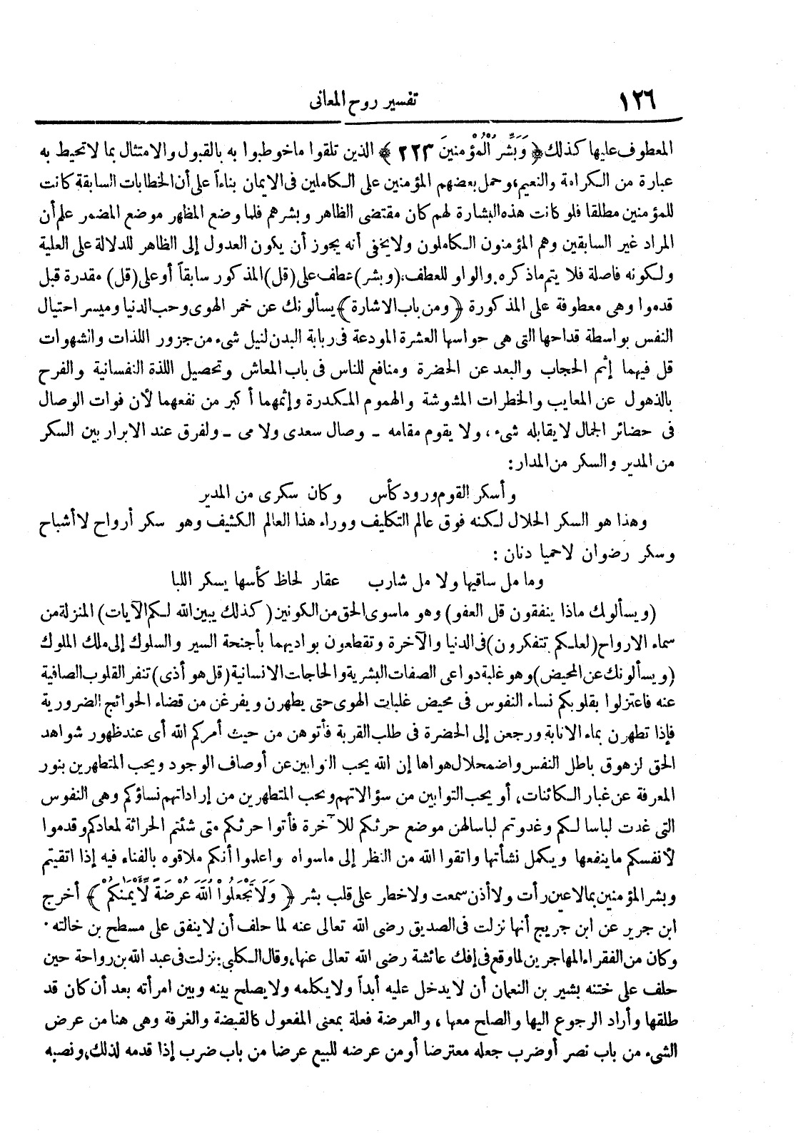 المعطوف عليها كذلك وبشر المؤمنين 322 الذين تلقوا ما خوطبوا به بالقبول والإمتثال بما لا تحيط به عبارة من الكرامة والنعيم وحمل بعضهم المؤمنين على الكاملين في الإيمان بناءا على أن الخطابات السابقة كانت للمؤمنين مطلقا فلو كانت هذه البشارة لهم كان مقتضى الظاهر وبشرهم فلما وضع المظهر موضع المضمر علم أن المراد غير السابقين وهم المؤمنون الكاملون ولا يخفى أنه يجوز أن يكون العدول إلى الظاهر للدلالة على العلية ولكونه فاصلة فلا يتم ما ذكره والواو للعطف وبشر عطف على قل المذكور سابقا أو على قل مقدرة قبل قدموا وهي معطوفة على المذكورة ومن باب الإشارة يسألونك عن خمر الهوى وحب الدنيا وميسر إحتيال النفس بواسطة قداحها التي هي حواسها العشرة المودعة في ربابة البدن لنيل شيء من جزور اللذات والشهوات قل فيهما إثم الحجاب والبعد عن الحضرة ومنافع للناس في باب المعاش وتحصيل اللذة النفسانية والفرح بالذهول عن المعايب والخطرات المشوشة والهموم المكدرة وإثمهما أكبر من نفعهما لأن فوات الوصال في حضائر الجمال لا يقابله شيء ولا يقوم مقامهوصال سعدي ولا ميولفرق عند الأبرار بين السكر من المدير والسكر من المدار : وأسكر القوم ورود كأس وكان سكرى من المدير وهذا هو السكر الحلال لكنه فوق عالم التكليف ووراء هذا العالم الكثيف وهو سكر أرواح لا أشباح وسكر رضوان لا حميا دنان : وما مل ساقيها ولا مل شارب عقار لحاظ كأسها يسكر اللبا ويسألونك ماذا بنفقون قل العفو وهو ما سوى الحق من الكونين كذلك يبين الله لكم الآيات المنزلة من سماء الأرواح لعلكم تتفكرون في الدنيا والآخرة وتقطعون بواديهما بأجنحة السير والسلوك إلى ملك الملوك ويسألونك عن المحيض وهو غلبة دواعي الصفات البشرية والحاجات الإنسانية قل هو أذى تنفر القلوب الصافية عنه فأعتزلوا بقلوبكم نساء النفوس في محيض غلبات الهوى حتى يطهرن ويفرغن من قضاء الحوائج الضرورية فإذا تطهرن بماء الإنابة ورجعن إلى الحضرة في طلب القربة فأتوهن من حيث أمركم الله أي عند ظهور شواهد الحق لزهوق باطل النفس وإضمحلال هواها إن الله يحب التوابين عن أوصاف الوجود ويحب المتطهرين بنور المعرفة عن غبار الكائنات أو يحب التوابين من سؤالاتهم ويحب المتطهرين من إرادتهم نساؤكم وهي النفوس التي غدت لباسا لكم وغدوتم لباسا لهن موضع حرثكم للآخرة فأتوا حرثكم متى شئتم الحراثة لمعادكم وقدموا لأنفسكم ما ينفعها ويكمل نشأتها وأتقوا الله من النظر إلى ما سواه وأعلموا أنكم ملاقوه بالفناء فيه إذا أتقيتم وبشر المؤمنين بما لا عين رأت ولا أذن سمعت ولا خطر على قلب بشر ولا تجعلوا الله عرضة لأيمانكم أخرج إبن جرير عن إبن جريج أنها نزلت في الصديق رضي الله تعالى عنه لما حلف أن لا ينفق على مسطح بن خالته وكان من الفقراء المهاجرين لما وقع في إفك عائشة رضي الله تعالى عنها وقال الكلبي : نزلت في عبدالله بمن رواحة حين حلف على ختنه بشير بن النعمان أن لا يدخل عليه أبدا ولا يكلمه ولا يصلح بينه وبين أمرأته بعد ان كان قد طلقها وأراد الرجوع إليها والصلح معها والعرضة فعلة بمعنى المفعول كالقبضة والغرفة وهي هنا من عرض الشيء من باب نصر أو ضرب جعله معترضا أو من عرضه للبيع عرضا من باب ضرب إذا قدمه لذلك ونصبه