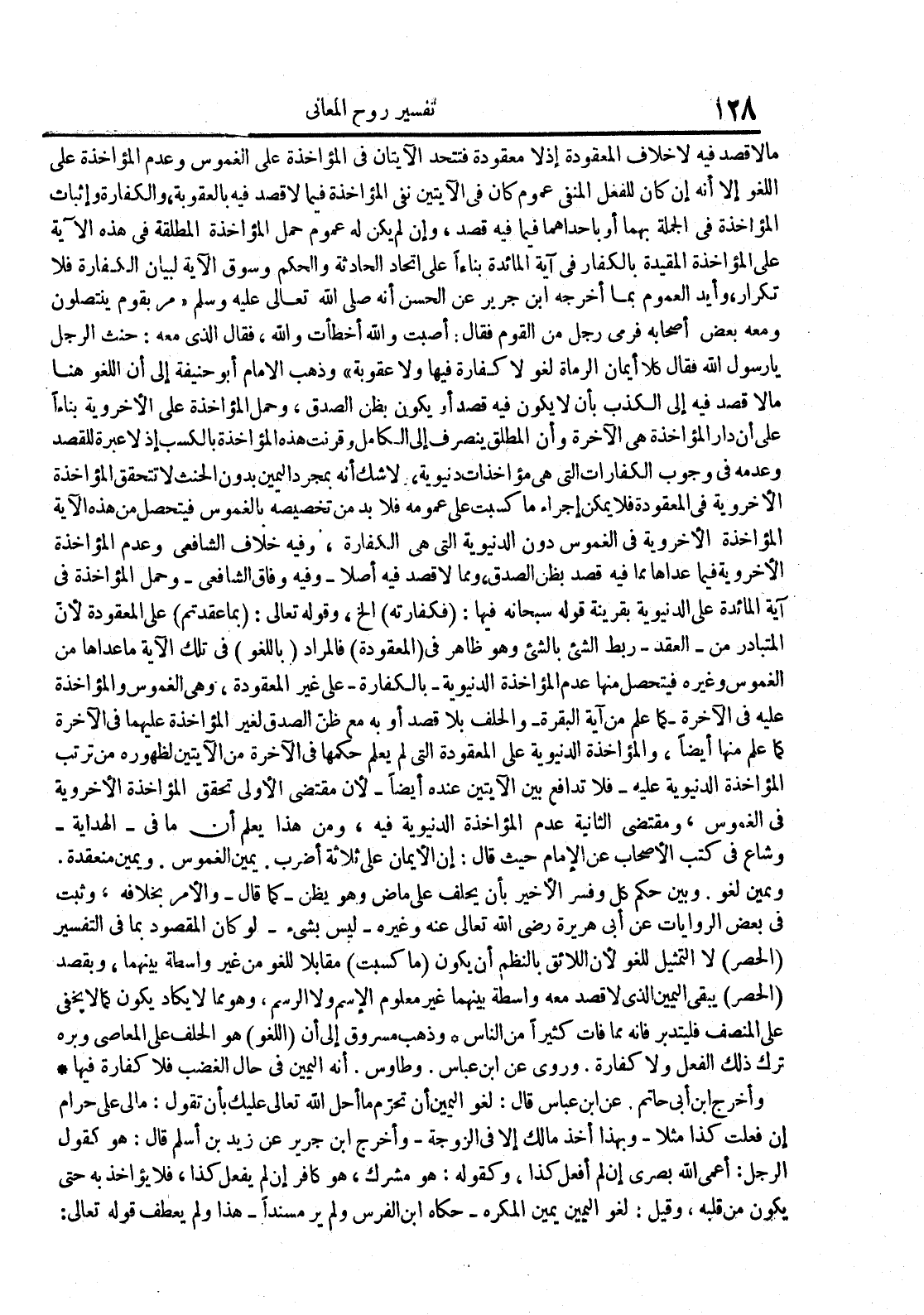 ما لا قصد فيه لا خلاف المعقودة إذ لا معقودة فتتحد الآيتان في المؤاخذة على الغموس وعدم المؤاخذة على اللغو إلا أنه إن كان للفعل المنفي عموم كان في الآيتين نفي المؤاخذة فيما لا قصد فيه بالعقوبة والكفارة وإثبات المؤاخذة في الجملة بهما أو بإحداهما فيما فيه قصد وإن لم يكن له عموم حمل المؤاخذة المطلقة في هذه الآية على المؤاخذة المقيدة بالكفار في آية المائدة بناءا على إتحاد الحادثة والحكم وسوق الآية لبيان الكفارة فلا تكرار وأيد العموم بما أخرجه إبن جرير عن الحسن أنه صلى الله تعالى عليه وسلم مر بقوم ينتصلون ومعه بعض أصحابه فرمى رجل من القوم فقال : أصبت والله أخطأت والله فقال الذي معه : حنث الرجل يارسول الله فقال كلا أيمان الرماة لغو لا كفارة فيها ولا عقوبة وذهب الإمام أبو حنيفة إلى أن اللغو هنا ما لا قصد فيه إلى الكذب بأن لا يكون فيه قصد أو يكون بظن الصدق وحمل المؤاخذة على الأخروية بناءا على أن دار المؤاخذة هي الآخرة وأن المطلق ينصرف إلى الكامل وقرنت هذه المؤاخذة بالكسب إذ لا عبرة للقصد وعدمه في وجوب الكفارات التي هي مؤاخذات دنيوية لا شك أنه بمجرد اليمين بدون الحنث لا تتحقق المؤاخذة الأخروية في المعقودة فلا يمكن إجراء ما كسبت على عمومه فلا بد من تخصيصه بالغموس فيتحصل من هذه الآية المؤاخذة الأخروية في الغموس دون الدنيوية التي هي الكفارة وفيه خلاف الشافعي وعدم المؤاخذة الأخروية فيما عداها مما فيه قصد بظن الصدق ومما لا قصد فيه أصلاوفيه وفاق الشافعيوحمل المؤاخذة في آية المائدة على الدنيوية بقرينة قوله سبحانه فيها : فكفارته إلخ وقوله تعالى : بما عقدتم على المعقودة لأن المتبادر منالعقدربط الشيء بالشيء وهو ظاهر في المعقودة فالمراد باللغو في تلك الآية ما عداها من الغموس وغيره فيتحصل منها عدم المؤاخذة الدنيويةبالكفارةعلى غير المعقودة وهي الغموس والمؤاخذة عليه في الآخرةكما علم من آية البقرةوالحلف بلا قصد أو به مع ظن الصدق لغير المؤاخذة عليهما في الآخرة كما علم منها أيضا والمؤاخذة الدنيوية على المعقودة التي لم يعلم حكمها في الآخرة من الآيتين لظهوره من ترتب المؤاخذة الدنيوية عليهفلا تدافع بين الآيتين عنده أيضالأن مقتضى الأولى تحقق المؤاخدة الأخروية في الغموس ومقتضى الثانية عدم المؤاخذة الدنيوية فيه ومن هذا يعلم أن ما فيالهدايةوشاع في كتب الأصحاب عن الإمام حيث قال : إن الأيمان على ثلاثة أضرب يمين الغموس ويمين منعقدة ويمين لغو وبين حكم كل وفسر الأخير بأن يحلف على ماض وهو يظنكما قالوالأمر بخلافه وثبت في بعض الروايات عن أبي هريرة رضي الله تعالى عنه وغيرهليس بشيءلو كان المقصود بما في التفسير الحصر لا التمثيل للغو لأن اللائق بالنظم أن يكون ما كسبت مقابلا للغو من غير واسطة بينهما وبقصد الحصر يبقى اليمين الذي لا قصد معه واسطة بينهما غير معلوم الإسم ولا الرسم وهو مما لا يكاد يكون كما لا يخفى على المنصف فليتدبر فإنه مما فات كثيرا من الناس