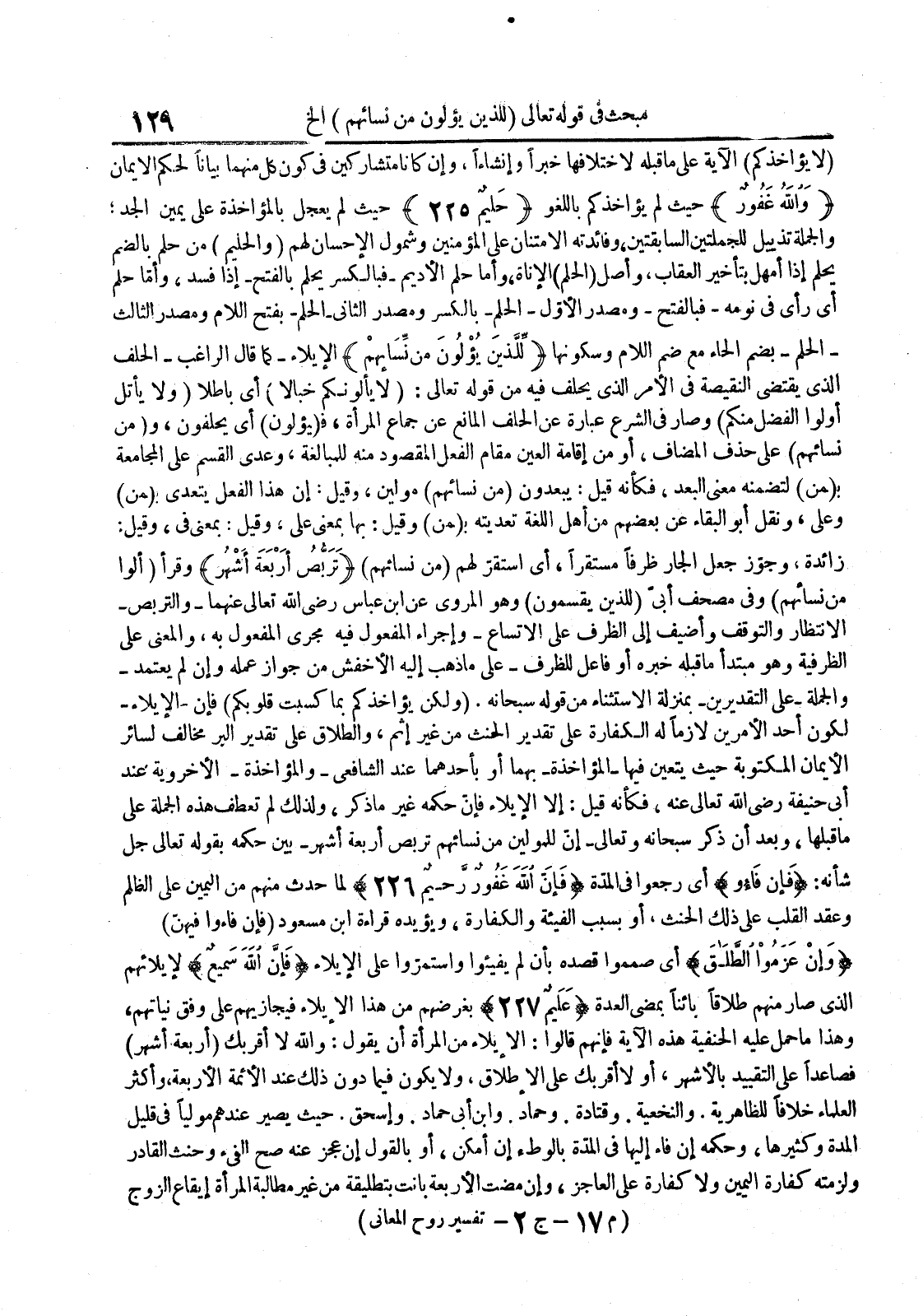 لا يؤاخذكم الآية على ما قبله لإختلافها خبرا وإنشاءا وإن كانا متشاركين في كون كل منهما بيانا لحكم الإيمان والله غفور حث لم يؤاخذكم باللغو حليم 522 حيث لم يجعل بالمؤاخذة على يمين الجد والجملة تذييل للجملتين السابقتين وفائدته الإمتنان على المؤمنين وشمول الإحسان لهم والحليم من حلم بالضم يحلم إذا أمهل بتأخير العقاب وأصل الحلم الإناة وأما حلم الأديمفبالكسر يحلم بالفتحإذا فسد وأما حلم أي رأى في نومهفبالفتحومصدر الأولالحلمبالكسر ومصدر الثانيالحلم بفتح اللارم ومصدر الثالث الحلم بضم الحاء مع ضم اللام وسكونها للذين يؤلون من نسائهم الإيلاءكما قال الراغبالحلف الذي يقتضي النقيصة في الأمر الذي يحلف فيه من قوله تعالى : لا يألونكم خبالا أي باطلا ولا يأتل أولوا الفضل منكم وصار في الشرع عبارة عن الحلف المانع عن جماع المرأة ف يؤلون أي يحلفون و من نسائهم على حذف المضاف أو من إقامة العين مقام الفعل المقصود منه للمبالغة وعدى القسم على المجامعة ب من لتضمنه معنى البعد فكأنه قيل : يبعدون من نسائهم مولين وقيل : إن هذا الفعل يتعدى م من وعلى ونقل أبو البقاء عن بعضهم من أهل اللغة تعديته ب من وقيل : بها بمعنى على وقيل : بمعنى في وقيل : زائدة وجوز جعل الجار ظرفا مستقرا أي أستقر لهم من نسائهم تربص أربعة أشهر وقرأ ألوا من نسائهم وفي مصحف أبي للذين يقسمون وهو المروى عن إبن عباس رضي الله تعالى عنهماوالتربص الإنتظار والتوقف وأضيف إلى الظرف على الإتساعوإجراء المفعول فيه مجرى المفعول به والمعنى على الظرفية وهو مبتدأ ما قبله خبره أو فاعل للظرفعلى ما ذهب إليه الأخفش من جواز عمله وإن لم يعتمد والجملةعلى التقديرينبمنزلة الإستثناء من قوله سبحانه ولكن يؤاخذكم بما كسبت قلوبكم فإنالإيلاءلكون أحد الأمرين لازما له الكفارة على تقدير الحنث من غير إثم والطلاق على تقدير البر مخالف لسائر الأيمان المكتوبة حيث يتعين فيهاالمؤاخذةبهما أو بأحذهما عند الشافعيوالمؤاخذةالأخروي عند أبي حنيفة رضي الله تعالى عنه فكأنه قيل : إلا الإيلاء فإن حكمه غير ما ذكر ولذلك لم تعطف هذه الجملة على ما قبلها وبعد أن ذكر سبحانه وتعالىإن للمولين من نسائهم تربص أربعة أشهربين حكمه بقوله تعالى جل شأنه : فإن فاؤا أي رجعوا في المدة فإن الله غفور رحيم 622 لما حدث منهم من اليمين على الظلم وعقد القلب على ذلك الحنث أو بسبب الفيئة والكفارة ويؤيده قراىة إبن مسعود فإن فاؤا فيهن وإن عزموا الطلاق أي صمموا قصده بأن لم يفيئوا وأستمروا على الإيلاء فإن الله سميع لإيلائهم الذي صار منهم طلاقا بائنا بمضى العدة عليم 722 بغرضهم من هذا الإيلاء فيجازيهم على وفق نياتهم وهذا ما حمل علي الحنفية هذه الآية فإنهم قالوا : الإيلاء من المرأة أن يقول : والله لا أقربك أربعة أشهر فصاعدا عل ىالتقييد بالأشهر أو لا أقربك على الإطلاق ولا يكون فيما دون ذلك عند الأئمة الأربعة وأكثر العلماء خلافا للظاهرية والنخعية وقتادة وحماد وإبن أبي حماد وإسحاق حيث يصير عندهم موليا في قليل المدة وكثيرها وحكمه إن فاء إليها في المدة بالوطء إن أمكن أو بالقول إن عجز عنه صح الفيء وحنث القادر ولزمته كفارة اليمين ولا كفارة على العاجز وإن مضت الأربعة بانت بتطليقة من غير مطالبة المرأة إيقاع الزوج