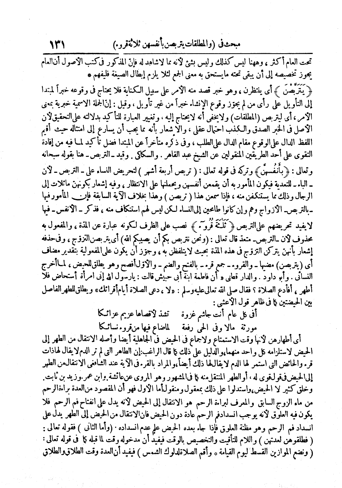 يتربصن أي ينتظرن وهو خبر قصد منه الأمر على سبيل الكناية فلا يحتاج في وقوعه خبرا لمبتدأ إلى التأويل على رأي من لم يجوز وقوع الإنشاء خبرا من غير تأويل وقيل : إن الجملة الأسمية خبرية بمعنى الأمر أي ليتربص المطلقات ولا يخفى أنه لا يحتاج إليه وتغيير العبارة للتأكيد بدلالته على التحقيق لأن الأصل في الخبر الصدق والكذب إحتمال عقلي والإشعار بأنه مما يجب أن يسارع إلى إمتثاله حيث أقيم اللفظ الدال على الوقوع مقام الدال على الطلب وفي ذكره متأخرا عن المبتدأ فضل تأكيد لما فيه من إفادة التقوى على أحد الطريقين المنقولين عن الشيخ عبدالقاهر والسكاكي وقيدالتربص هنا بقوله سبحانه وتعالى : بأنفسهن وتركه في قوله تعالى : تربص أربعة أشهر لتحريض النساء علىالتربصلأن الباءللتعدية فيكون المأمور به أن يقمعن أنفسهن ويحملنها على الإنتظار وفيه إشعار بكونهن ماثلات إلى الرجال وذلك مما يستنكفن منه فإذا سمعن هذا تربصن وهذا بخلاف الآية السابقة فإن المأمور فيها بالتربصالأزواج وهم وإن كانوا طامحين إلى النساء لكن ليس لهم إستنكاف منه فذكرالأنفسفيها لا يفيد تحريضهم على التربص ثلاثة قروء نصب على الظرف لكونه عبارة عن المدة والمفعول به محذوف لأنالتربصمتعد قال تعالى : ونحن نتربص بكم أن يصيبكم الله أي يتربصن التزوج وفي حذفه إشعار بأنهن يتركن التزوج في هذه المدة بحيث لا يتلفظن بهوجوز أن يكون على المفعولية بتقدير مضاف أي يتربصن مضيهاوالقرؤجمع قرءبالفتح والضموالأول أفصح وهو يطلق للحيض لما أخرج النسائي وأبو داؤد والدار قطني أن فاطمة إبنة أبي حبيش قالت : يا رسول الله إني إمرأة أستحاض فلا أطهر أفأدع الصلاة فقال صلى الله تعالى عليه وسلم : لا دعي الصلاة أيام أقرائك ويطلق للطهر الفاصل بين الحيضتين كما في ظاهر قول الأعشى : أفي كل عام أنت جاشم غزوة تشد لأقصاها عزيم عزائكا مورثة مالا وفي الحي رفعة لما ضاع فيها من قرؤ نسائكا أي أطهارهن لأنها وقت الإستمتاع ولا جماع في الحيض في الجاهلية أيضا وأصله الإنتقال من الطهر إلى الحيض لإستلزامه كل واحد منهما والدليل على ذلك كما قال الراغب : إن الطاهر التي لم تر الدم لا يقال لها ذات قرء والحائض التي أستمر لها الدم لا يقال لها ذلك أضا والمراد بالقرء في الآية عند الشافعي الإنتقال من الطهر إلى الحيض في قول قوي له أو الطهر المنتقل منه كما في المشهور وهو المروي عن عائشة وإبن عمر وريد بن ثابت وخلق كثير لا الحيض وأستدلوا على ذلك بمعقول ومنقول أما الأول فهو أن المقصود من العدة براءة الرحم من ماء الزوج السابق والمعروف لبراءة الرحم هو الإنتقال إلى الحيض لأنه يدل على إنفتاح فم الرحم فلا يكون فيه العلوق لأنه يوجب إنسداد فم الرحم عادة دون الحيض فإن الإنتقال من الحيض إلى الطهر يدل على إنسداد فم الرحم وهو مظنة العلوق فإذا جاء بعده الحيض علم عدم إنسداده وأما الثاني فقوله تعالى : فطلقوهن لعدتهن واللام للتأقيت والتخصيص بالوقت فيفيد أن مدخوله وقت لما قبله كما في قوله تعالى : ونضع الموازين القسط ليوم القيامة