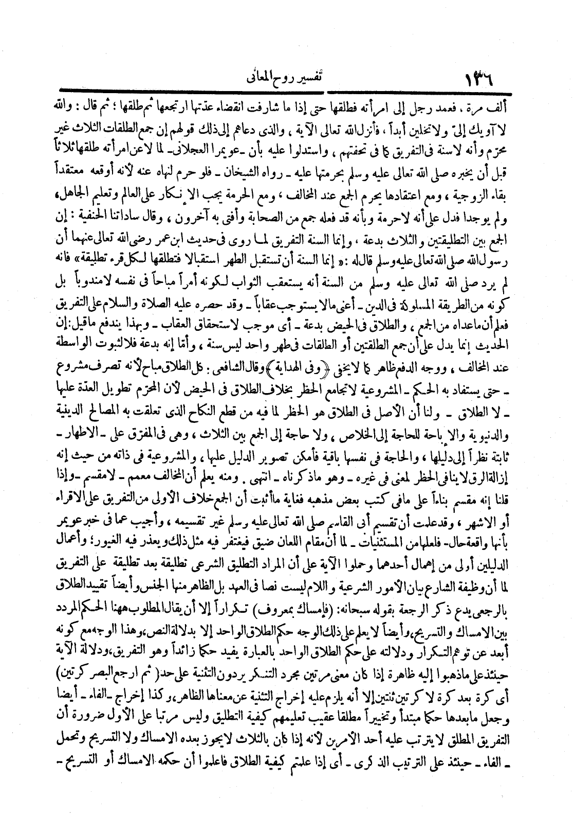 ألف مرة فعمد رجل إلى أمرأته فطلقها حتى إذا ما شارفت إنقضاء عدتها أرتجعها ثم طلقها ثم قال : والله لا آويك إلي ولا تخلين أبدا فأنزل الله تعالى الآية والذي دعاهم إلى ذلك قولهم إن جمع الطلقات الثلاث غير محرم وأنه لا سنة في التفريق كما في تحفتهم وأستدلوا عليه بأنعويمرا العجلانيلما لاعن أمرأته طلقها ثلاثا قبل أن يخبره صلى الله تعالى عليه وسلم بحرمتها عليهرواه الشيخانفلو حرم لنهاه عنه لأنه أوقعه معتقدا بقاء الزوجية ومع إعتقادها يحرم الجمع عند المخالف ومع الحرمة يجب الإنكار على العالم وتعليم الجاهل ولم يوجدا فدل على أنه لا حرمة وبأنه قد فعله جمع من الصحابة وأفتى به آخرون وقال ساداتنا الحنفية : إن الجمع بين التطليقتين والثلاث بدعة وإنما السنة التفريق لما روى في حديث إبن عمر رضي الله تعالى عنهما أن رسول الله صلى الله تعالى عليه وسلم قال له : إنما السنة أن تستقبل الطهر إستقبالا فتطلقها لكل قرء تطليقة فإنه لم يرد صلى الله تعالى عليه وسلم من السنة أنه يستعقب الثواب لكونه أمرا مباحا في نفسه لا مندوبا بل كونه من الطريقة المسلوكة في الدينأعني ما لا يستوجب عقاباوقد حصره عليه الصلاة و السلام على التفريق فعلم أن ما عداه من الجمع والطلاق في الحيض بدعةأي موجب لإستحقاق العقابوبهذا يندفع ما قيل : إن الحديث إنما يدل على أن جمع الطلقتين أو الطلقات في طهر واحد ليس سنة وأما إنه بدعة فلا لثبوت الواسطة عند المخالف ووجه الدفع ظاهر كما لا يخفى وفي الهداية وقال الشافعي : كل الطلاق مباح لأنه تصرف مشروع حتى يستفاد به الحكمالمشروعية لا تجامع الحظر بخلاف الطلاق في الحيض لأن المحرم تطويل العدة عليها لا الطلاقولنا أن الأصل في الطلاق هو الحظر لما فيه من قطع النكاح الذي تعلقت به المصالح الدينية والدنيوية والإباحة للحاجة إلى الخلاص ولا حاجة إلى الجمع بين الثلاث وهي في المفرق علىالإطهارثابتة نظرا إلى دليلها والحاجة في نفسها باقية فأمكن تصوير الدليل عليها والمشروعية في ذاته من حيث إنه إزالة الرق لا ينافي الحظر لمعنى في غيرهوهو ما ذكرناهإنتهى ومنه يعلم أن المخالف معمملا مقسموإذا قلنا إنه مقسم بناءا على ما في كتب بعض مذهبه فغاية ما أثبت أن الجمع خلاف الأولى من التفريق على الإقراء أو الأشهر وقد علمت أن تقسيم أبي القاسم صلى الله تعالى عليه وسلم غير تقسيمه وأجيب عما في خبر عويمر بأنها واقعة حالفلعلها من المستثنياتلما أن مقام اللعان ضيق فيغتفر فيه مثل ذلك ويعذر فيه الغيور وأعمال الدليلين أولى من إهمال أحدهما وحملوا الآية على أن المراد التطليق الشرعي تطليقة بعد تطليقة على التفريق لما أن وظيفة الشارع بيان الأمور الشرعية واللام ليست نصا في العهد بل الظاهر منها الجنس وأيضا تقييد الطلاق بالرجعي يدع ذكر الرجعة بقوله سبحانه : فإمساك بمعروف تكرارا إلا أن يقال المطلوب ههنا الحكم المردد بين الإمساك والتسريح وأيضا لا يعلم على ذلك الوجه حكم الطلاق الواحد إلا بدلالة النص وهذا الوجه مع كونه أبعد عن توهم التكرار ودلالته على حكم الطلاق الواحد بالعبارة يفيد حكما زائدا وهو التفريق ودلالة الآية حينئذ على ما ذهبوا إليه ظاهرة إذا كان معنى مرتين مجرد التنكر يردون التثنية على حد ثم أرجع البصر كرتين أي كرة بعد كرة لا كرتين ثنتين إلا أنه يلزم عليه إخراج التثنية عن معناها الظاهر وكذا إخراجالفاء أيضا وجعل ما بعدها حكما مبتدأ وتخييرا مطلقا عقيب تعليمهم كيفية التطليق وليس مرتبا على الأول ضرورة أن التفريق المطلق لا يترتب عليه أحد الأمرين لأنه إذا كان بالثلاث لا يجوز بعده الإمساك ولا التسريح وتحمل الفاءحينئذ على الترتيب الذكريأي إذا علمتم كيفية الطلاق فأعلموا أن حكمه الإمساك أو التسريح