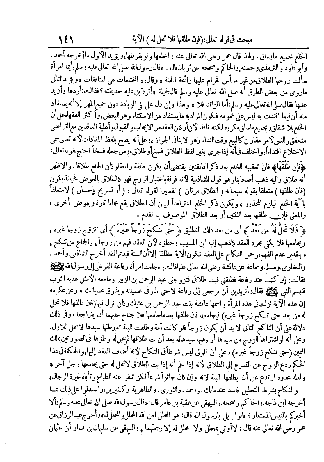 فلا تحل له من بعد أي من بعد ذلك التطليق حتى تنكح زوجا غيره أي تتزوج زوجا غيره ويجامعها فلا يكفي مجرد العقد كما ذهب إليه إبن المسيب وخطؤه لأن العقد فهم من زوجا والجماع من تنكح وبتقدير عدم الفهم وحمل النكاح على العقد تكون الآية مطلقة إلا أن السنة قيدتها فقد أخرج الشافعي وأحمد والبخاري ومسلم وجماعة عن عائشة رضي الله تعالى عنها قالت : جاءت أمرأة رفاعة القرظي إلى رسول الله فقالت : إني كنت عند رفاعة فطلقني فبت طلاقي فتزوجني عبدالرحمن بن الزبير وما معه الأمثل هدبة الثوب فتبسم النبي فقال : أتريدين أن ترجعي إلى رفاعة لا حتى تذوقي عسيلته ويذوق عسيلتك وعن عكرمة إن هذه الآية نزلت في هذه المرأة وأسمها عائشة بنت عبدالرحمن بن عيتك وكان نزل فيها فإن طلقها فلا تحل له من حتى تنكح زوجا غيره فيجامعها فإن طلقها بعد ما جامعها فلا جناح عليهما أن يتراجعا وفي ذلك دلالة على أن الناكح الثاني لا بد أن يكون زوجا فلو كانت أمة وطلقت البتة ثم وطئها سيدها لا تحل للأول وعلى أنه لو أشتراها الزوج من سيدها أو وهبها سيدها له بعد أن بت طلاقها لم يحل له وطؤها في الصورتين بملك اليمين حتى تنكح زوجا غيره وعلى أن الولي ليس شرطا في النكاح لأنه أضاف العقد عليها والحكمة في هذا الحكم ردع الزوج عن التسرع إلى الطلاق لأنه إذا علم أنه إذا بت الطلاق لا تحل له حتى يجامعها رجل آخر