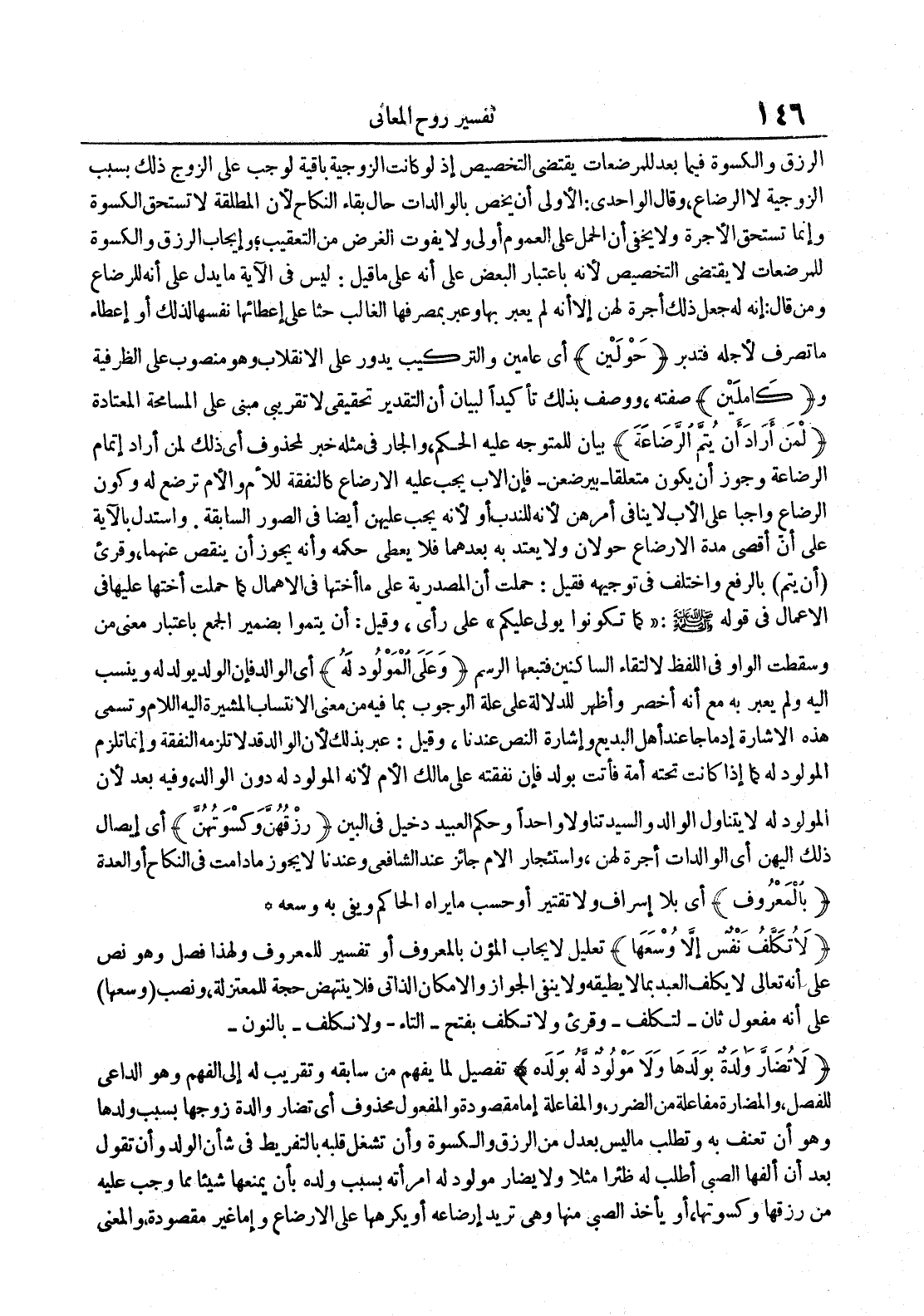 الرزق والكسوة فيما بعد للمرضعات يقتضي التخصيص إذ لو كانت الزوجية باقية لوجب على الزوج ذلك بسبب الزوجية لا الرضاع وقال الواحدي : الأولى أن يخص بالوالدات حال بقاء النكاح لأن المطلقة لا تستحق الكسوة وإنما تستحق الأجرة ولا يخفى أن الحمل على العموم أولى ولا يفوت الغرض من التعقيب وإيجاب الرزق والكسوة للمرضعات لا يقتضي التخصيص لأنه بإعتبار البعض على أنه على ما قيل : ليس في الآية ما يدل على أنه للرضاع ومن قال : إنه له جعل ذلك أجرة لهن إلا أنه لم يعبر بها وعبر بمصرفها الغالب حثا على إعطائها نفسها لذلك أو إعطاء ما تصرف لأجله فتدبر حولين أي عامين والتركيب يدور على الإنقلاب وهو منصوب على الظرفية و كاملين صفته ووصف بذلك تأكيدا لبيان أن التقدير تحقيقي لا تقريبي مبني على المسامحة المعتادة لمن أراد أن يتم الرضاعة بيان للمتوجه عليه الحكم والجار في مثله خبر لمحذوف أي ذلك لمن أراد إتمام الرضاعة وجوز أن يكون متعلقابيرضعنفإن الأب يجب عليه الإرضاع كالنفقة للأم والأم ترضع له وكون الرضاع واجبا على الأب لا ينافي أمرهن لأنه للندب أو لأنه يجب عليهن أيضا في الصور السابقة وأستدل بالآية على أن أقصى مدة الإرضاع حولان ولا يعتد به بعدهما فلا يعطى حكمه وأنه يجوز أن ينقص عنهما وقريء أن يتم بالرفع وأختلف في توجيهه فقيل : حملت أن المصدرية على ما أختها في الإهمال كما حملت أختها عليها في الأعمال في قوله : كما تكونوا يولي عليكم على رأي وقيل : أن يتموا بضمير الجمع بإعتبار معنى من وسقطت الواو في اللفظ لإلتقاء الساكنين فتبعها الرسم وعلى المولود له أي الوالد فإن الولد يولد له وينسب إليه ولم يعبر به مع أنه أخصر وأظهر للدلالة على علة الوجوب بما فيه من معنى الإنتساب المشيرة إليه اللام وتسمى هذه الإشارة إدماجا عند أهل البديع وإشارة النص عندنا وقيل : عبر بذلك لأن الوالد لا تلزمه النفقة وإنما تلزم المولود له كما إذا كانت تحته أمة فأتت بولد فإن نفقته على مالك الأم لأنه المولود له دون الوالد وفيه بعد لأن المولود له لا يتناول الوالد والسيد تناولا واحدا وحكم العبيد دخيل في البين رزقهن وكسوتهن أي إيصال ذلك إليهن أي الوالدات أجرة لهن وإستئجار الأم جائز عند الشافعي وعندنا لا يجوز ما دامت في النكاح أو العدة بالمعروف أي بلا إسراف ولا تقتير أو حسب ما يراه الحاكم ويفي به وسعه
