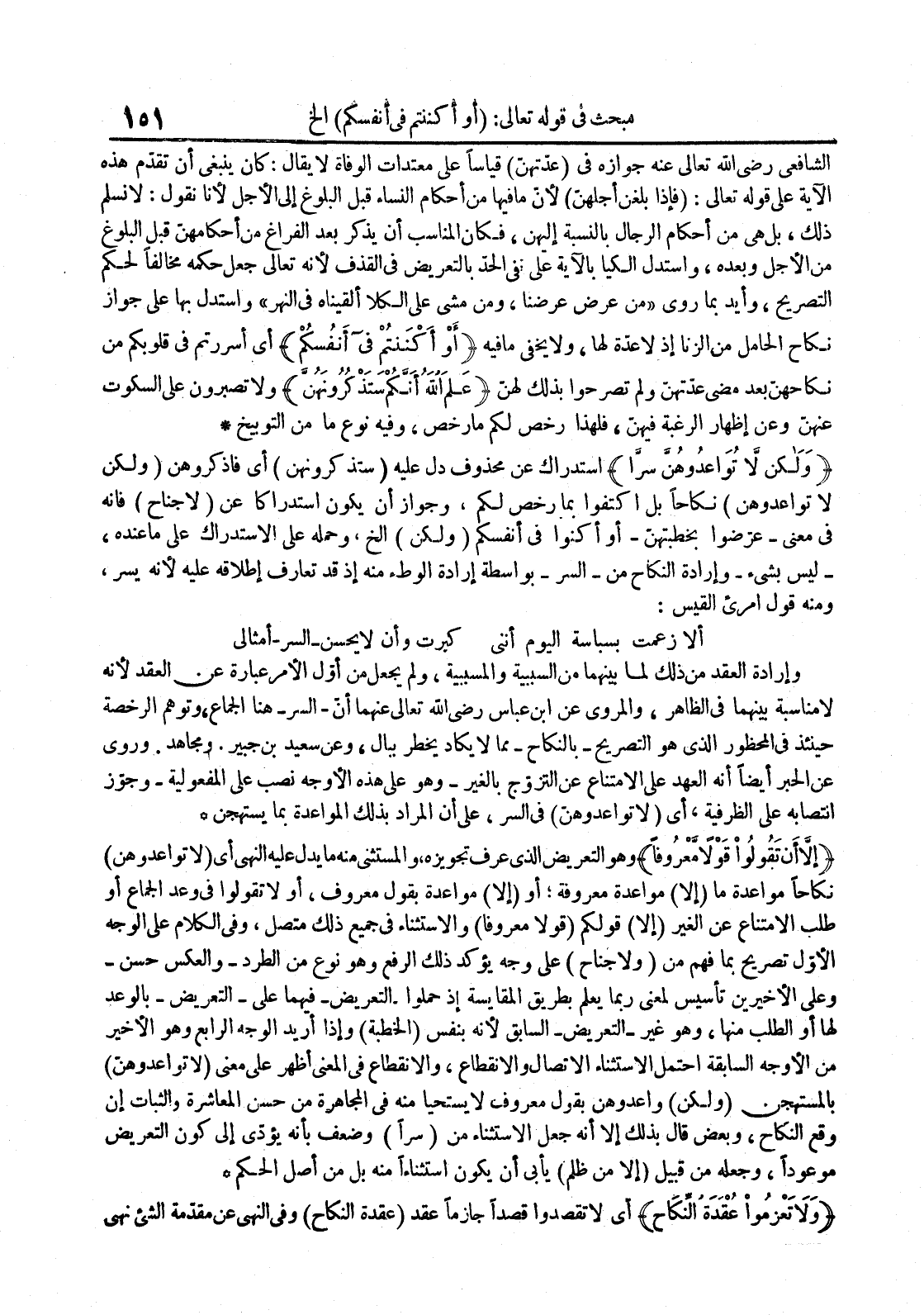 الشافعي رضي الله تعالى عنه جوازه في عدتهن قياسا على معتدات الوفاة لا يقال : كان ينبغي ان تقدم هذه الآية على قوله تعالى : فإذا بلغن أجلهن لأن ما فيها من أحكام النساء قبل البلوغ إلى الأجل لأنا نقول : لا نسلم ذلك بل هي من أحكام الرجال بالنسبة إليهن فكان المناسب أن يذكر بعد الفراغ من أحكامهن قبل البلوغ من الأجل وبعده وأستدل الكيا بالآية على نفي الحد بالتعريض في القذف لأنه تعالى جعل حكمه مخالفا لحكم التصريح وأيد بما روى من عرض عرضنا ومن مشى على الكلا ألقيناه في النهر وأستدل بها على جواز نكاح الحامل من الزنا إذ لا عدة لها ولا يخفى ما فيه أو أكننتم في أنفسكم أي أسررتم في قلوبكم من نكاحهن بعد مضي عدتهن ولم تصرحوا بذلك لهن علم الله أنكم ستذكرونهن ولا تصبرون على السكوت عنهن وعن إظهار الرغبة فيهن فلهذا رخص لكم ما رخص وفيه نوع ما من التوبيخ