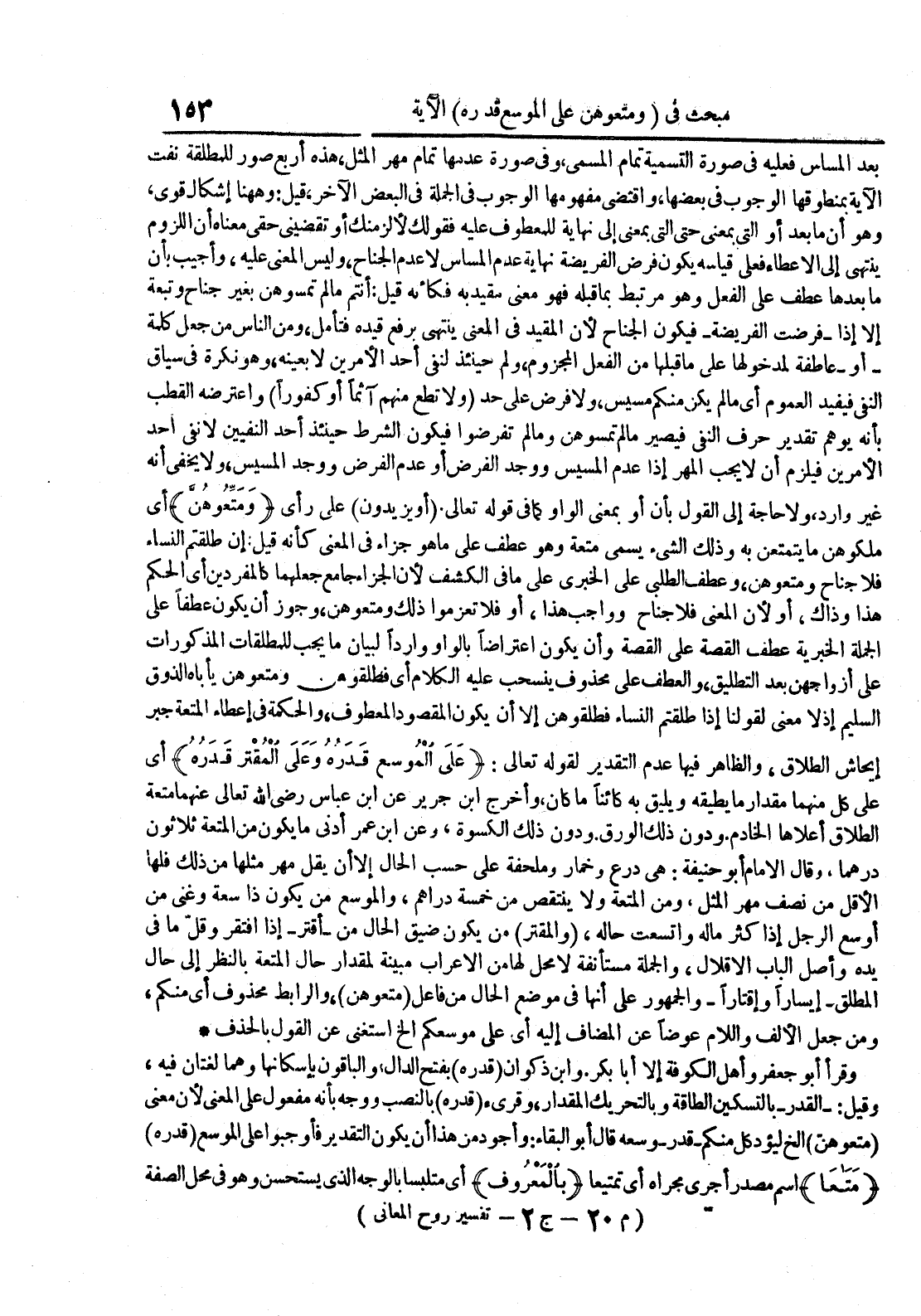 بعد المساس فعليه في صورة التسمية تمام المسمى وفي صورة عدمها تمام مهر المثل هذه أربع صور للمطلقة نفت الآية بمنطوقها الوجوب في بعضها وأقتضى مفهومها الوجوب في الجملة في البعض الآخر قيل : وههنا إشكال قوي وهو أن ما بعد أو التي بمعنى حتى التي بمعنى إلى نهاية للمعطوف عليه فقولك لالزمنك أو تقضيني حقي معناه أن اللزوم ينتهي إلى الإعطاء فعلى قياسه يكون فرض الفريضة نهاية عدم المساس لا عدم الجناح وليس المعنى عليه وأجيب بأن ما بعدها عطف على الفعل وهو مرتبط بما قبله فهو معنى مقيد به فكأنه قيل : أنتم ما لم تمسوهن بغير جناح وتبعة إلا إذافرضت الفريضةفيكون الجناح لأن المقيد في المعنى ينتهي برفع قيده فتأمل ومن الناس من جعل كلمة أوعاطفة لمدخولها على ما قبلها من الفعل المجزوم ولم حينئذ لنفي أحد الأمرين لا بعينه وهو نكرة في سياق النفي فيفيد العموم أي ما لم يكن منكم مسيس ولا فرض على حد ولا تطع منهم آثما أو كفورا وأعترضه القطب بأنه يوهم تقدير حرف النفي فيصير ما لم تمسوهن وما لم تفرضوا فيكون الشرط حينئذ أحد النفييم لا نفي أحد الأمرين فيلزم أن لا يجب المهر إذا عدم المسيس ووجد الفرض أو عدم الفرض ووجد المسيس ولا يخفى أنه غير وارد ولا حاجة إلى القول بأن أو بمعنى الواو كما في قوله تعالى : أو يزيدون على رأي ومتعوهن أي ملكوهن ما يتمتعن به وذلك الشيء يسمى متعة وهو عطف على ما هو جزاء في المعنى كأنه قيل : إن طلقتم النساء فلا جناح ومتعوهن وعطف الطلبي على الخبري على ما في الكشف لأن الجزاء جامع جعلهما كالمفردين أي الحكم هذا وذاك أو لأن المعنى فلا جناح وواجب هذا أو فلا تعزموا ذلك ومتعوهن وجوز أن يكون عطفا على الجملة الخبرية عطف القصة على القصة وأن يكون إعتراضا بالواو واردا لبيان ما يجب للمطلقات المذكورات على أزواجهن بعد التطليق والعطف على محذوف ينسحب عليه الكلام أي فطلقوهن ومتعوهن ياباه الذوق السليم إذ لا معنى لقولنا إذا طلقتم النساء فطلقوهن إلا أن يكون المقصود المعطوف والحكمة في إعطاء المتعة جبر إيحاش الطلاق والظاهر فيها عدم التقدير لقوله تعالى : على الموسع قدره وعلى المقتر قدره أي على كل منهما مقدار ما يطيقه ويليق به كائنا ما كان وأخرج إبن جرير عن إبن عباس رضي الله تعالى عنهما متعة الطلاق أعلاها الخادم ودون ذلك الورق ودون ذلك الكسوة وعن إبن عمر أدنى ما يكون من المتعة ثلاثون درهما وقال الإمام أبو حنيفة : هي درع وخمار وملحفة على حسب الحال إلا أن يقل مهر مثلها من ذلك فلها الأقل من نصف مهر المثل ومن المتعة ولا ينتقص من خمسة دراهم والموسع من يكون ذا سعة وغنى من أوسع الرجل إذا كثر ماله وأتسعت حاله والمقتر من يكون ضيق الحال منأقترإذا أفتقر وقل ما في يده وأصل الباب الإقلال والجملة مستأنفة لا محل لها من الإعراب مبينة لمقدار حال المتعة بالنظر إلى حال المطلقإيسارا وإقتاراوالجمهور على أنها في موضع الحال من فاعل متعوهن والرابط محذوف أي منكم ومن جعل الألف واللام عوضا عن المضاف إليه أي على موسعكم إلخ أستغنى عن القول بالحذف