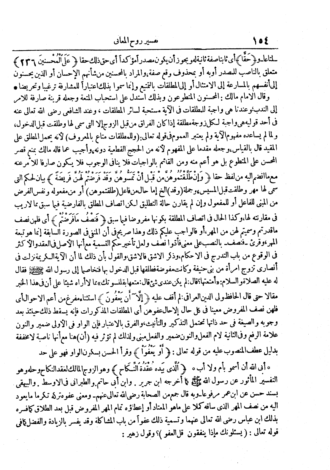 وقال الإمام مالك : المحسنون المتطوعون وبدلك أستدل على إستحباب المتعة وجعله قرينة صارفة للأمر إلى الندب وعندنا هي واجبة للمطلقات في الآية مستحبة لسائر المطلقات وعند الشافعي رضي الله تعالى عنه في أحد قوليه هي واجبة لكل زوجة مطلقة إذا كان الفراق من قبل الزوج إلا التي سمى لها وطلقت قبل الدخول ولما لم يساعده مفهوم الآية ولم يعتبر العموم في قوله تعالى : وللمطلقات متاع بالمعروف لأنه يحمل المطلق على المقيد قال بالقياس وجعله مقدما عل ىالمفهوم لأنه من الحجج القطعية دونه وأجيب عما قاله مالك بمنع قصر المحسن على المتطوع بل هو أعم منه ومن القائم بالواجبات فلا ينافي الوجوب فلا يكون صارفا للأمر عنه مع مأ أنضم من لفظ حقا وإن طلقتموهن من قبل أن تمسوهن وقد فرضتم لهن فريضة بيان لحكم التي سمى لها مهر وطلقت قبل المسيس وجملة وقد إلخ إما حال من فاعل طلقتموهن أو من مفعوله ونفس الفرض من المبني للفاعل أو للمفعول وإن لم يقارن حالة التطليق لكن إتصاف المطلق بالفارضية فيما سبق مما لا ريب في مقارنته لها وكذا الحال في إتصاف المطلقة بكونها مفروضا فيما سبق فنصف ما فرضتم أي فلهن نصف ما قدرتم وسميتم لهن من المهر أو فالواجب عليكم ذلك وهذا صريح في أن المنفي في الصورة السابقة إنما هو تبعة المهر وقريءفنصفبالنصب على معنى فأدوا نصف ولعل تأخير حكم التسمية مع أنها الأصل في العقد والأكثر في الوقوع من باب التدرج في الأحكام وذكر الأشق فالأشق والقول بأن ذلك لما أن الآية الكريمة نزلت في أنصاري تزوج أمرأة من بني حنيفة وكانت مفوضة فطلقها قبل الدخول بها فتخاصما إلى رسول الله فقال له عليه الصلاة و السلام : أمتعتها قال : لم يكن عندي شيء قال : متعها بقلنسوتك مما لا أراه شيئا على أن في هذا الخبر مقالا حتى قال الحافظ ولي الدين العراقي : لم أقف عليه إلآ أن يعفون إستثناء مفرغ من أعم الأحوال أي فلهن نصف المفروض معينا في كل حال إلا حال عفوهن أي المطلقات المذكورات فإنه يسقط ذلك حينئذ بعد وجوبه والصيغة في حد ذاتها تحتمل التذكير والتأنيث والفرق بالإعتبار فإن الواو في الأولى ضمير والنون علامة الرفع وفي الثانية لام الفعل والنون ضمير والفعل مبني ولذلك لم تؤثر فيه أن هنا مع أنها ناصبة لا مخففة بدليل عطف المنصوب عليه من قوله تعالى : أو يعفوا وقرأ الحسن بسكون الواو فهو على حد