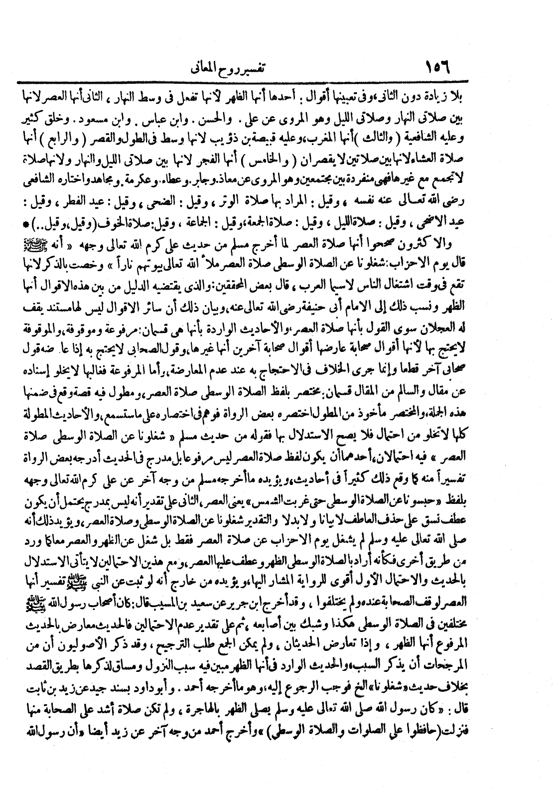 والأكثرون صححوا أنها صلاة العصر لما أخرج مسلم من حديث علي كرم الله تعالى وجهه أنه قال يوم الأحزاب : شغلونا عن الصلاة الوسطى صلاة العصر ملأ الله تعالى بيوتهم نارا وخصت بالذكر لأنها تقع في وقت إشتغال الناس لا سيما العرب قال بعض المحققين : والذي يقتضيه الدليل من بين هذه الأقوال أنها الظهر ونسب ذلك إلى الإمام أبي حنيفة رضي الله تعالى عنه وبيان ذلك أن سائر الأقوال ليس لها مستند يقف له العجلان سوى القول بأنها صلاة العصر والأحاديث الواردة بأنها هي قسمان : مرفوعة وموقوفة والموقوفة لا يحتج بها لأنها أقوال صحابة عارضها صحابة آخرين أنها غيرها وقول الصحابي لا يحتج به إذا عارضه قول صحابي آخر قطعا وإنما جرى الخلاف في الإحتجاج به عند عدم المعارضة وأما المرفوعة فغالبها لا يخلو إسناده عن مقال والسالم من المقال قسمان : مختصر بلفظ الصلاة الوسطى صلاة العصر ومطول فيه قصة وقع في ضمنها هذه الجملة والمختصر مأخوذ من المطول أختصره بعض الرواة فوهم في إختصاره على ما ستسمع والأحاديث المطولة كلها لا تخلو من إحتمال فلا يصح الإستدلال بها فقوله من حديث مسلم شغلونا عن الصلاة الوسطى صلاة العصر فيه إحتمالان أحدهما أن يكون لفظ صلاة العصر ليس مرفوعا بل مدرج في الحديث أدرجه بعض الرواة تفسيرا منه كما وقع ذلك كثيرا في أحاديث ويؤيده ما أخرجه مسلم من وجه آخر عن علي كرم الله تعالى وجهه بلفظ حبسونا عن الصلاة الوسطى حتى غربت الشمس يعني العصر الثاني على تقدير أنه ليس بمدرج يحتمل أن يكون عطف نسق على حذف العاطف لا بيانا ولا بدلا والتقدير شغلونا عن الصلاة الوسطى وصلاة العصر ويؤيد ذلك أنه صلى الله تعالى عليه وسلم لم يشغل يوم الأحزاب عن صلاة العصر فقط بل شغل عن الظهر والعصر معا كما ورد من طريق أخرى فكأنه أراد بالصلاة الوسطى الظهر وعطف عليها العصر ومع هذين الإحتمالين لا يتأتى الإستدلال بالحديث والإحتمال الأول أقوى للرواية المشار إليها ويؤيده من خارج أنه لو ثبت عن النبي تفسيرا أنها العصر لوقف الصحابة عنده ولم يختلفوا وقد أخرج إبن جرير عن سعيد بن المسيب قال : كان أصحاب رسول الله مختلفين في الصلاة الوسطى هكدا وشبك بين أصابعه ثم على تقدير عدم الإحتمالين فالحديث معارض بالحديث المرفوع أنها الظهر وإذا تعارض الحديثان ولم يمكن الجمع طلب الترجيح وقد ذكر الأصوليون أن من المرجحات أن يذكر السبب والحديث الوارد في أنها الظهر مبيبن فيه سب النزول ومساق لذكرها بطريق القصد بخلاف حديث شغلونا إلخ فوجب الرجوع إليه وهو ما أخرجه أحمد وأبو داؤد بسند جيد عن زيد بن ثابت قال : كان رسول الله صلى الله تعالى عليه وسلم يصلي الظهر بالهاجرة ولم تكن صلاة أشد على الصحابة منها فنزلت حافظوا على الصلوات والصلاة الوسطى وأخرج أحمد من وجه آخر عن زيد أيضا أن رسول الله