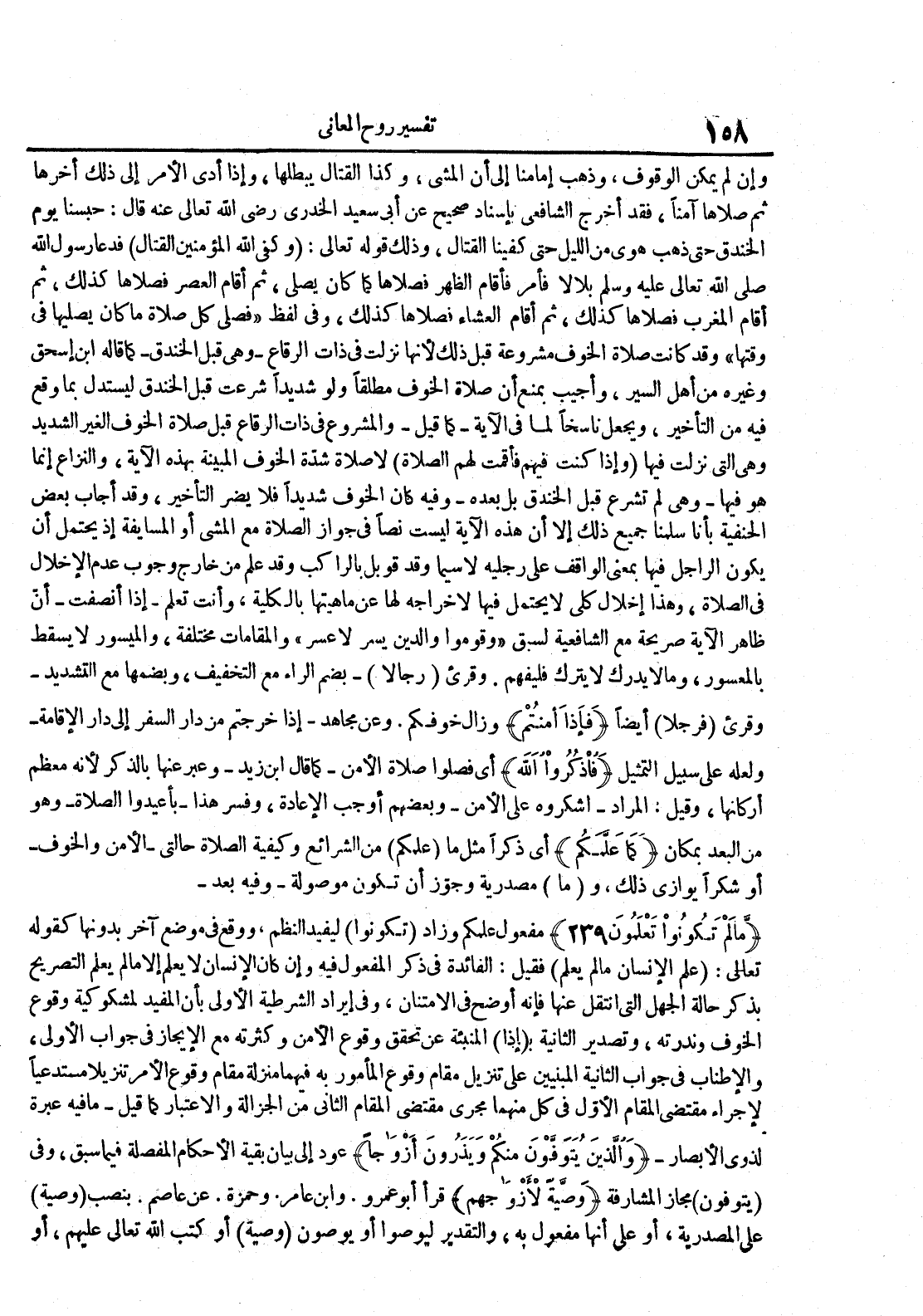 وإن لم يكن الوقوف وذهب إمامنا إلى أن المشي وكذا القتال يبطلها وإذا أدى الأمر إلى ذلك أخرها ثم صلاها آمنا فقد أخرج الشافعي بإسناد صحيح ع أبي سعيد الخدري رضي الله تعالى عنه قال : حبسنا يوم الخندق حتى ذهب هوى من الليل حتى كفينا القتال وذلك قوله تعالى : وكفى الله المؤمنين القتال فدعا رسول الله صلى الله تعالى عليه وسلم بلالا فأمر فأقام الظهر فصلاها كما كان يصلي ثم أقام العصر فصلاها كذلك ثم أقام المغرب فصلاها كذلك ثم أقام العشاء فصلاها كذلك وفي لفظ فصلى كل صلاة ما كان يصليها في وقتها وقد كانت صلاة الخوف مشروعة قبل ذلك لأنها نزلت في ذات الرقاعوهي قبل الخندقكما قاله إبن إسحاق وغيره من أهل السير وأجيب بمنع أن صلاة الخوف مطلقا ولو شديدا شرعت قبل الخندق ليستدل بما وقع فيه من التأخير ويجعل ناسخا لما في الآيةكما قيلوالمشروع في ذات الرقاع قبل صلاة الخوف الغير الشديد وهي التي نزلت فيها وإذأ كنت فيهم فأقمت لهم الصلاة لا صلاة شدة الخوف المبينة بهذه الآية والنزاع إنما هو فيهاوهي لم تشرع قبل الخندق بل بعدهوفيه كان الخوف شديدا فلا يضر التأخير وقد أجاب بعض الحنفية بأنا سلمنا جميع ذلك إلا أن هذه الآية ليست نصا في جواز الصلاة مع المشي أو المسايفة إذ يحتمل أن يكون الراجل فيها بمعنى الواقف على رجليه وقد قوبل بالراكب وقد علم من خارج وجوب عدم الإخلال في الصلاة وهذا إخلال كلي لا يحتمل فيها لإخراجه لها عن ماهيتها بالكلية وأنت تعلمإذا أنصفتأن ظاهر الآية صريحة مع الشافعية لسبق وقوموا والدين يسر لا عسر والمقامات مختلفة والميسور لا سقط بالمعسور وما لا يدرك لا يترك فيلفهم وقريء رجالا بضم الراء مع التخفيف وبضمها مع التشديد وقريء فرجلا أيضا فإذا أمنتم وزال خوفكم وعن مجاهدإذا خرجتم من دار السفر إلى دار الإقامةولعله على سبيل التمثيل فأذكروا الله أي فصلوا صلاة الأمنكما قال إبن زيدوعبر عنها بالذكر لأنه معظم أركانها وقيل : المرادأشكروه على الأمنوبعضهم أوجب الإعادة وفسر هذأبأعيدوا الصلاةوهو من البعد بمكان كما علمكم أي ذكرا مثل ما علمكم من الشرائع وكيفية الصلاة حالتيالأمن والخوف أو شكرا يوازي ذلك و ما مصدرية وجوز أن تكون موصولهوفيه بعد ما لم تكونوا تعلمون 932 مفعول علمكم وزاد تكونوا ليفيد النظم ووقع في موضع آخر بدونها كقوله تعالى : علم الإنسان ما لم يعلم فقيل : الفائدة في ذكر المفعول فيه وإن كان الإنسان لا يعلم إلا ما لم يعلم التصريح بذكر حالة الجهل التي أنتقل عنها فإنه أوضح في الإمتنان وفي إيراد الشرطية الأولى بأن المفيد لمشكوكية وقوع الخوف وندرته وتصدير الثانية ب إذا المنبئة عن تحقق وقوع الأمن وكثرته مع الإيجاز في جواب الأولى والإطناب في جواب الثانية المبنين على تنزيل مقام وقوع المأمور به فيهما منزلة مقام وقوع الأمر تنزيلا مستدعيا لإجراء مقتضى المقام الأول في كل منهما مجرى مقتضى المقام الثاني من الجزالة والإعتبار كما قيلما فيه عبرة لذوي الأبصار والذين يتوفون منكم ويذرون أزواجا عود إلى بيان بقية الأحكام المفصلة فيما سبق وفي يتوفون مجاز المشارقة وصية لأزواجهم قرأ أبو عمرو وإبن عامر وحمزة عن عاصم بنصب وصية على المصدرية أو على أنها مفعول به والتقدير ليوصوا أو يوصون وصية أو كتب الله تعالى عليهم أو