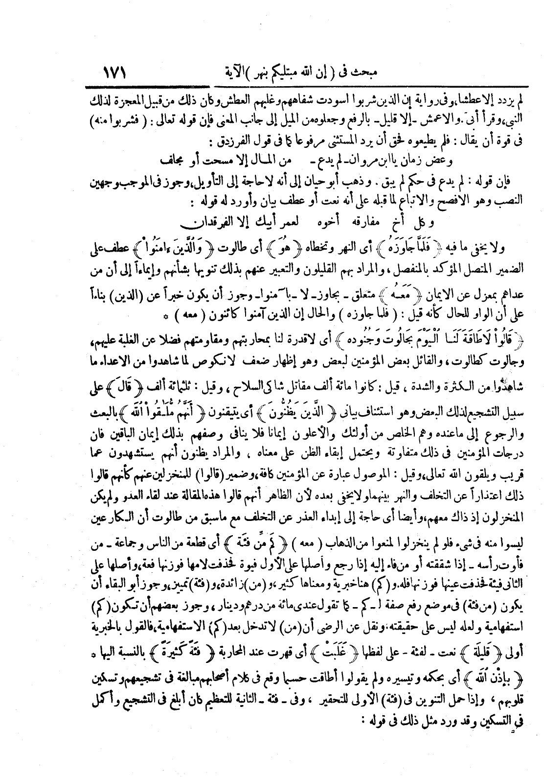 لم يزدد إلا عطشا وفي رواية إن الذين شربوا أسودت شفاههم وغلبهم العطش وكان ذلك من قبيل المعجزة لذلك النبي وقرأ أبي والأعمشإلا قليلبالرفع وجعلوه من الميل إلى جانب المعنى فإن قوله تعالى : فشربوا منه في قوة أن يقال : فلم يطيعوه فحق أن يرد المستثنى مرفوعا كما في قول الفرزدق : وعض زمان ياإبن مروانلم يدع من المال إلا مسحت أو مجلف فإن قوله : لم يدع في حكم لم يبق وذهب أبو حيان إلى أنه لا حاجة إلى التأويل وجوز في الموجب وجهين النصب وهو الأفصح والإتباع لما قبله على أنه نعت أو عطف بيان وأورد له قوله : وكل أخ مفارقه أخوه لعمر أبيك إلا الفرقدان ولا يخفى ما فيه فلما جاوزه أي النهر وتخطاه هو أي طالوت والذين آمنوا عطف على الضمير المتصل المؤكد بالمنفصل والمراد بهم القليلون والتعبير عنهم بذلك تنويها بشأنهم وإيماءا إلى أن من عداهم بمعزل عن الإيمان معه متعلقيجاوزلابآمنواوجو أن يكون مخبرا عن الذين بناءا على أن الواو للحال كأنه قيل : فلما جاوزه والحال إن الذين آمنوا كائنون معه
