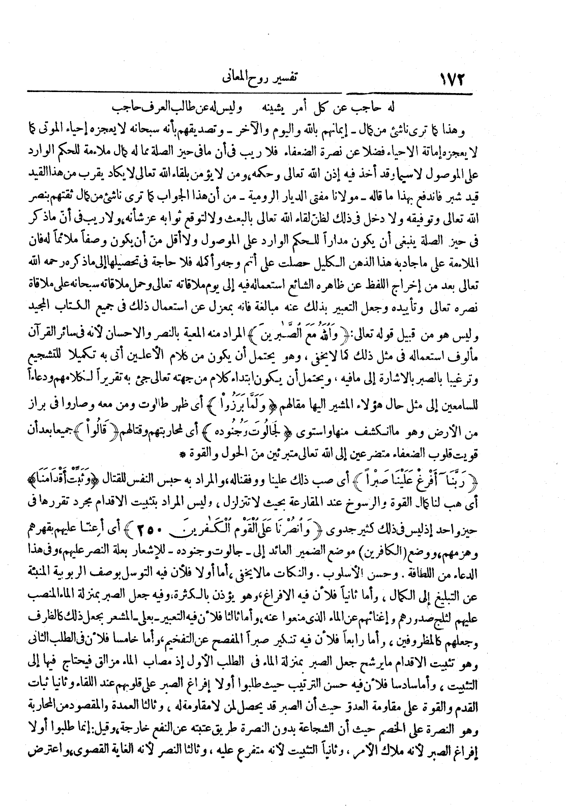 له حاجب عن كل أمر يشينه وليس له عن طالب العرف حاجب وهذا كما ترى ناشيء من كمالإيمانهم بالله واليوم الآخروتصديقهم بأنه سبحانه لا يعجزه إحياء الموتى كما لا يعجزه إماتة الأحياء فضلا عن نصرة الضعفاء فلا ريب في أن ما في حيز الصلة مما له كمال ملاءمة للحكم الوارد على الموصول لا سيما وقد أخذ فيه إذن الله تعالى وحكمه ومن لا يؤمن بلقاء الله تعالى لا يكاد يقرب من هذا القيد قيد شبر فأندفع بهذا ما قالهمولانا مفتي الديار الروميةمن أن هذا الجواب كما ترى ناشيء من كمال ثقتهم بنصر الله تعالى وتوفيقه ولا دخل في ذلك لظن لقاء الله تعالى بالبعث ولا لتوقع ثوابه عز شأنه ولا ريب في أن ما ذكر في حيز الصلة ينبغي أن يكون مدارا للحكم الوارد على الموصول ولا أقل من أن يكون وصفا ملائما له فإن الملاءمة على ما جاد به هذا الذهن الكليل حصلت على أتم وجه وأكمله فلا حاجة في تحصيلها إلى ما ذكره رحمه الله تعالى بعد من إخراج اللفظ عن ظاهره الشائع إستعماله فيه إلى يوم ملاقاته تعالى وحمل ملاقاته سبحانه على ملاقاة نصره تعالى وتأييده وجعل التعبير بذلك عنه مبالغة فإنه بمعزل عن إستعمال ذلك في جميع الكتاب المجيد وليس هو من قبيل قوله تعالى : والله مع الصابرين المراد منه المعية بالنصر والإحسان لأنه في سائر القرآن مألوف إستعماله في مثل ذلك كما لا يخفى وهو يحتمل أن يكون من كلام الأعلين أتى به تكميلا للتشجيع وترغيبا بالصبر بالإشارة إلى ما فيه ويحتمل أن يكون إبتداء كلام من جهته تعالى جيء به تقريرا لكلامهم ودعاءا للسامعين إلى مثل حال هؤلاء المشير إليها مقالهم ولما برزوا أي ظهر طالوت ومن معه وصاروا في براز من الأرض وهو ما أنكشف منها وأستوى لجالوت وجنوده أي لمحاربتهم وقتالهم قالوا جميعا بعد أن قويت قلوب الضعفاء متضرعين إلى الله تعالى متبرئين من الحول والقوة